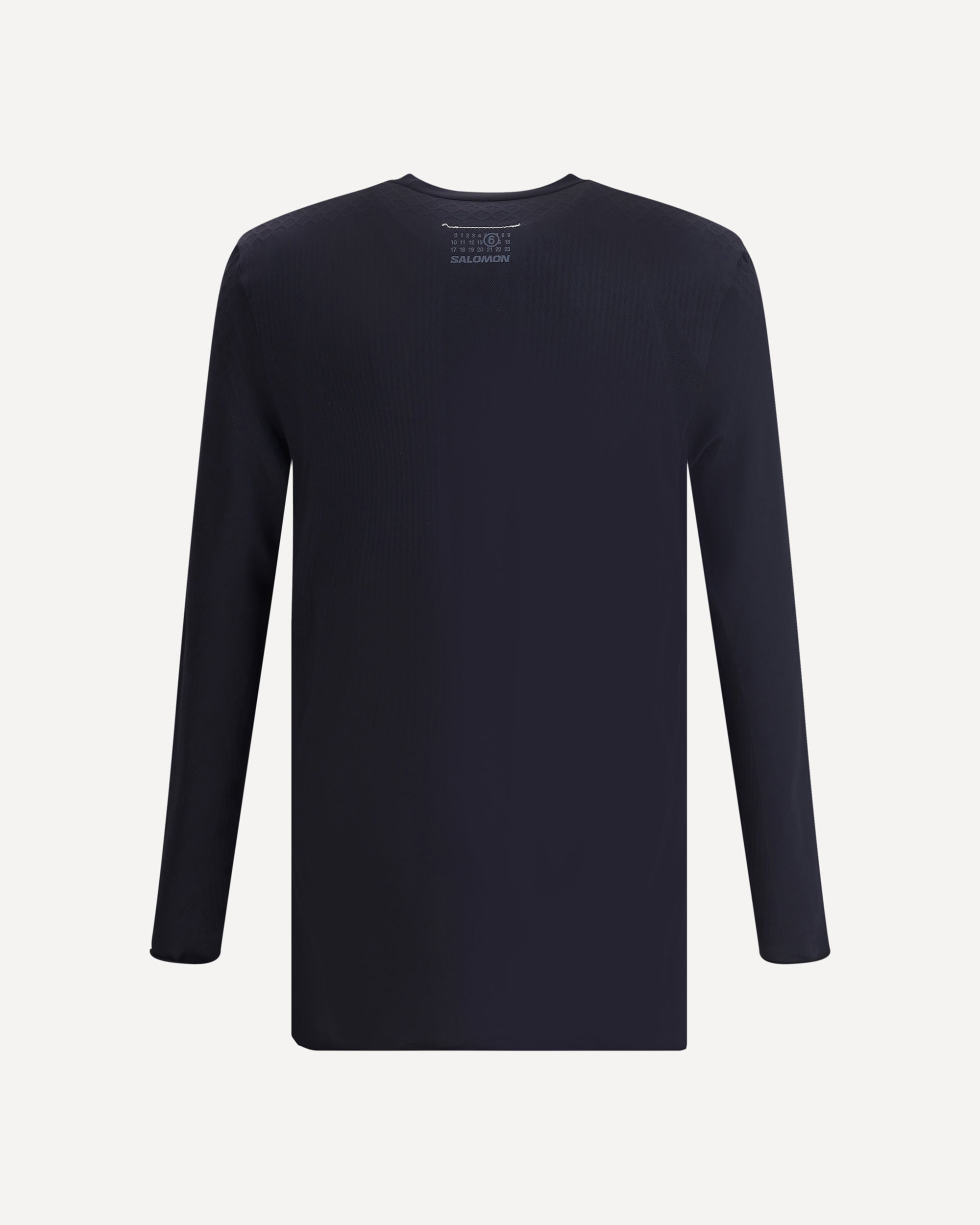 Maglia a maniche lunghe della collaborazione MM6 x Salomon, realizzata in tessuto stretch con fantasia monocromo. Il modello presenta un classico girocollo a costine e una silhouette aderente. Sul fronte spicca una maxi stampa che riproduce le iconiche calzature del brand, mentre sul retro è presente il monogramma a contrasto. Un capo audace e contemporaneo, perfetto per completare look streetwear dal forte impatto visivo.