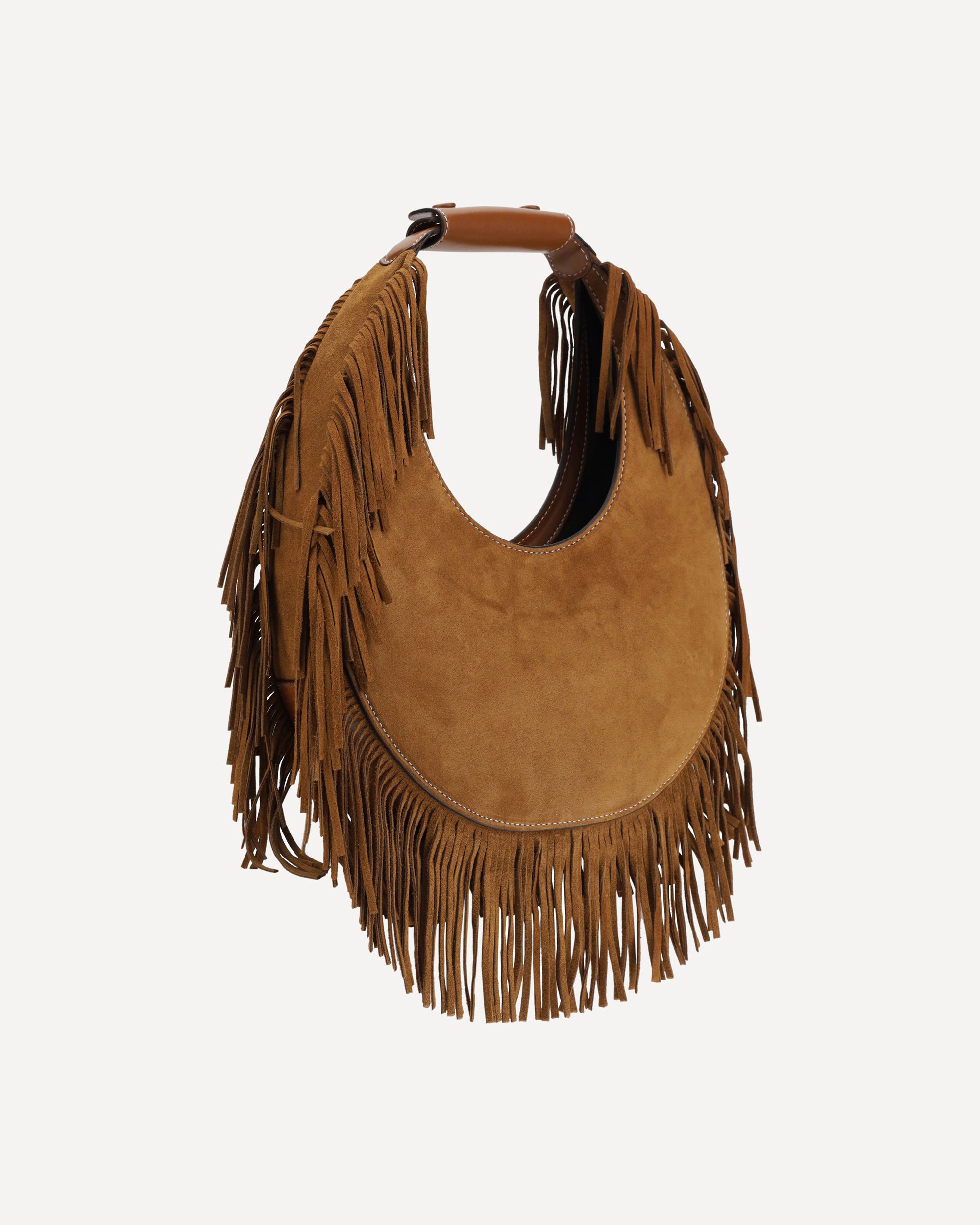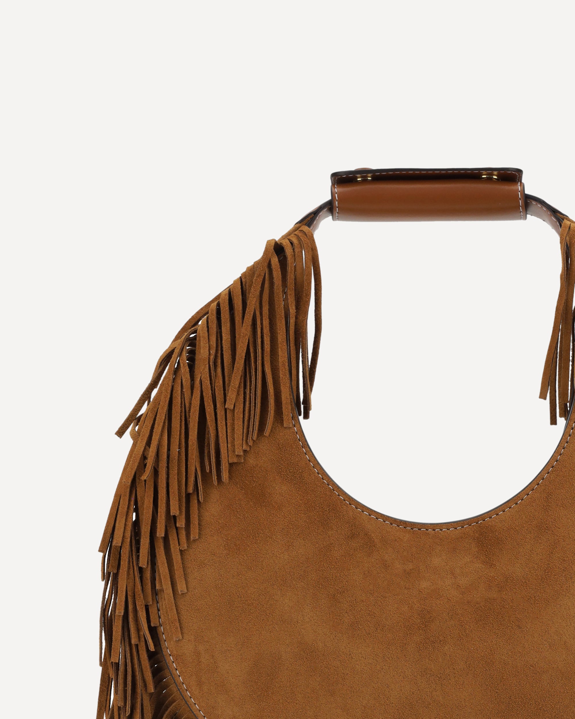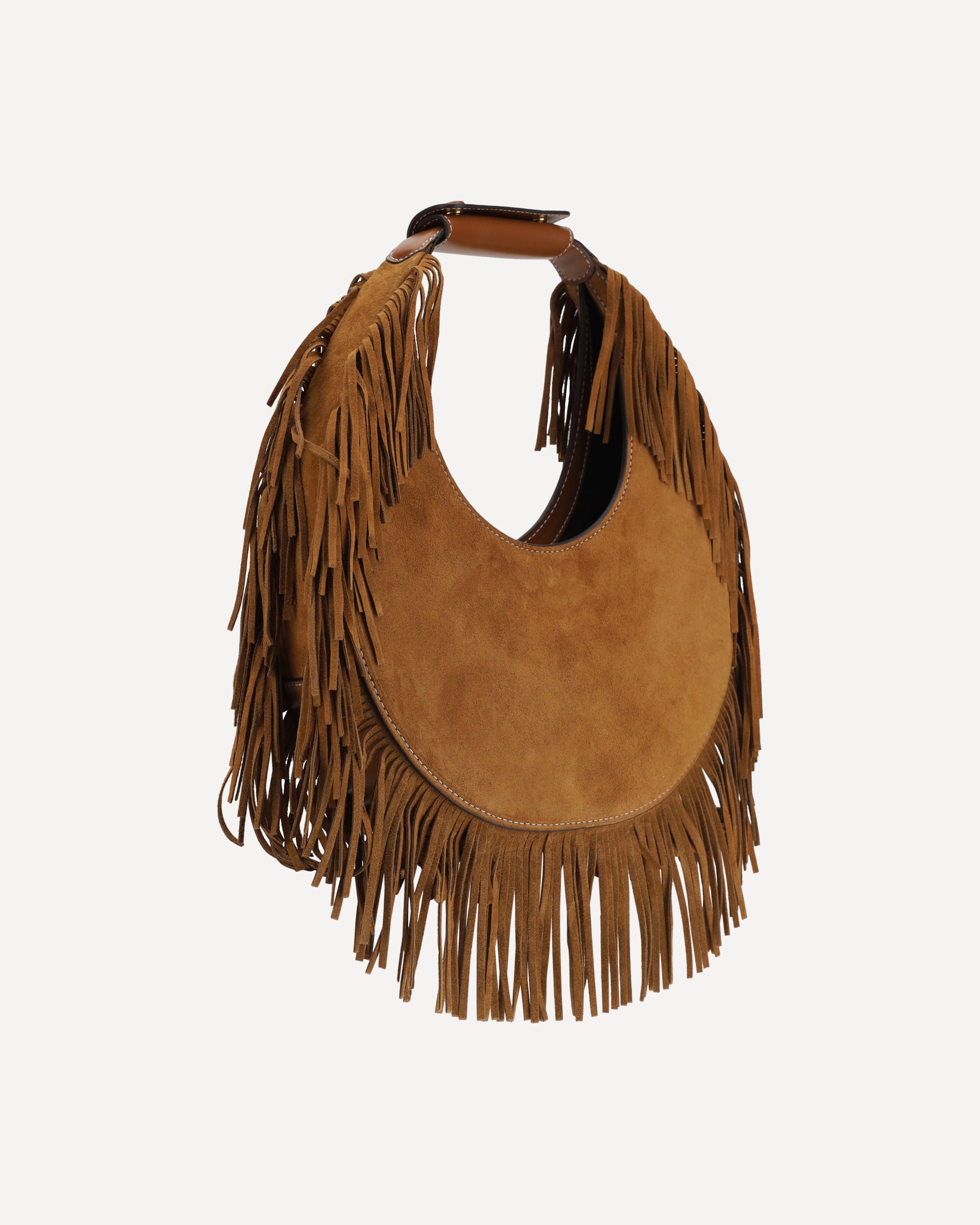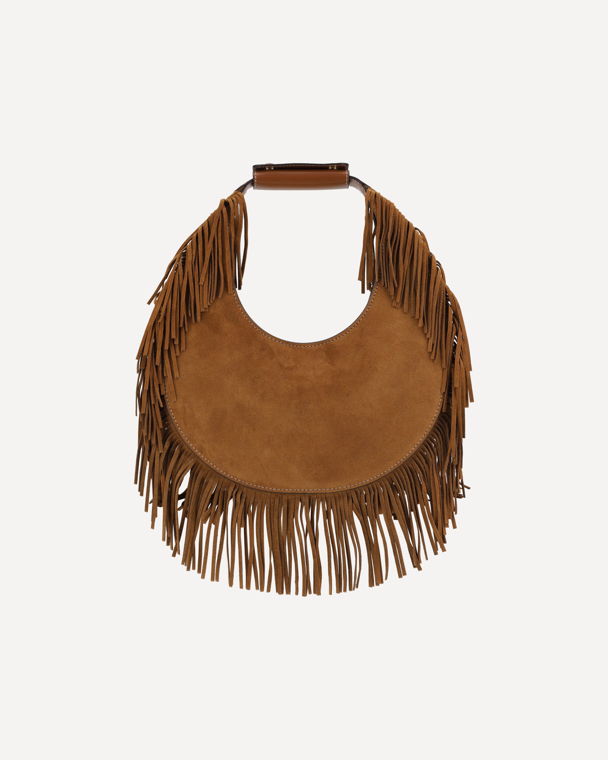 La Borsa a Spalla Moon di Staud è un modello dallo stile boho-chic, caratterizzato da un design in pelle scamosciata arricchito da frange decorative. Il manico rigido le conferisce un tocco strutturato, mentre la chiusura magnetica nascosta garantisce praticità mantenendo un’estetica pulita ed elegante.