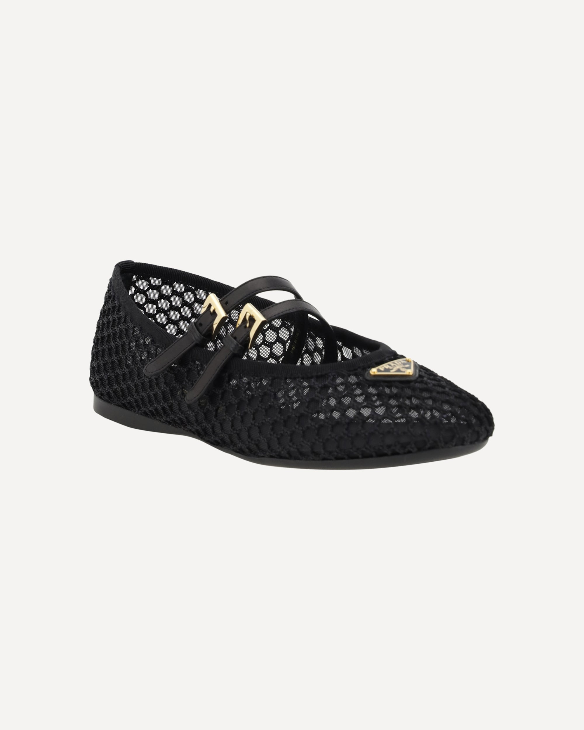 Le ballerine di Prada presentano una punta tonda che assicura comfort e una calzata elegante. L'iconica placca triangolare logata, applicata sul fronte, aggiunge un dettaglio distintivo del brand. Il design a rete conferisce leggerezza e un tocco moderno, mentre i due cinturini in pelle con fibbia sul fronte garantiscono una calzata sicura e stilosa. La suola piatta offre comfort, e la soletta logata completa il look con un ulteriore segno di autenticità del marchio.