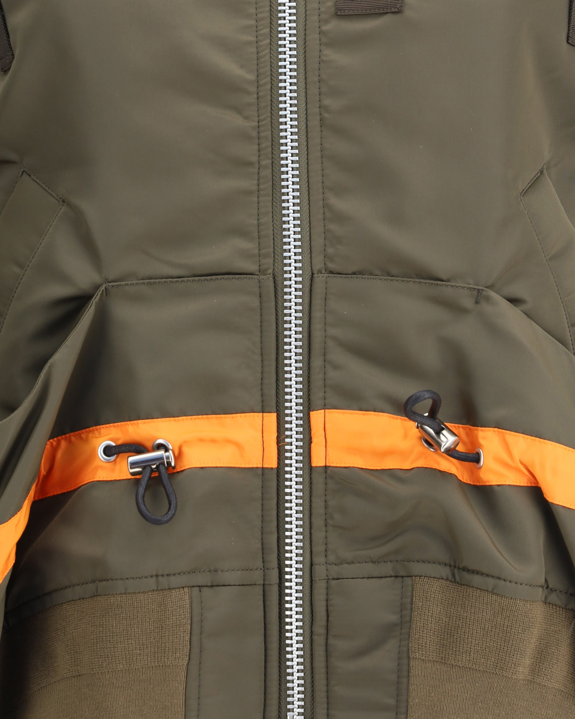 La Giacca bomber di Sacai è un capo d’abbigliamento dallo stile contemporaneo e ricercato. Caratterizzata da una chiusura frontale con cerniera a doppio cursore, unisce funzionalità e design con dettagli tecnici ben studiati. Il colletto e i polsini a costine aggiungono un tocco sportivo, mentre le quattro tasche a filetto sul davanti garantiscono praticità senza compromettere l’estetica. Una coulisse regolabile attraversa il fronte, permettendo di personalizzare la vestibilità. Completano il design una tasca applicata con zip sulla manica sinistra, dettaglio distintivo che richiama l’ispirazione utility tipica del brand.