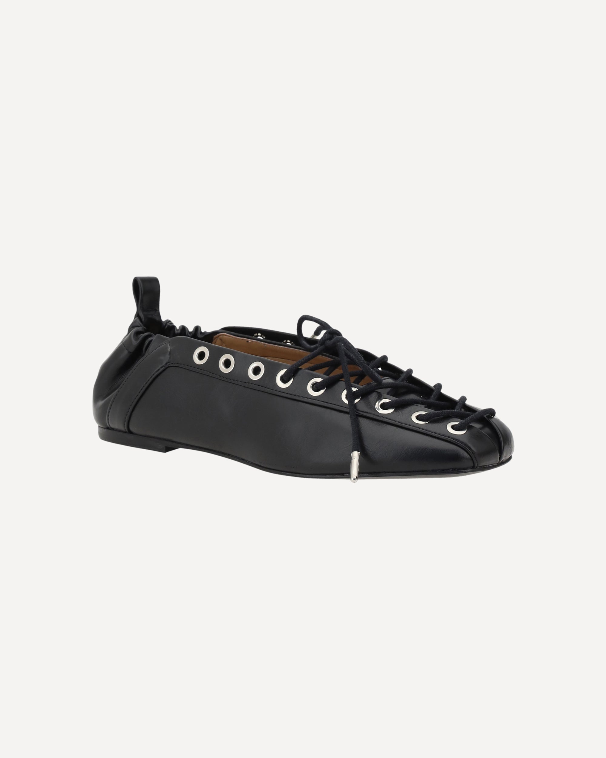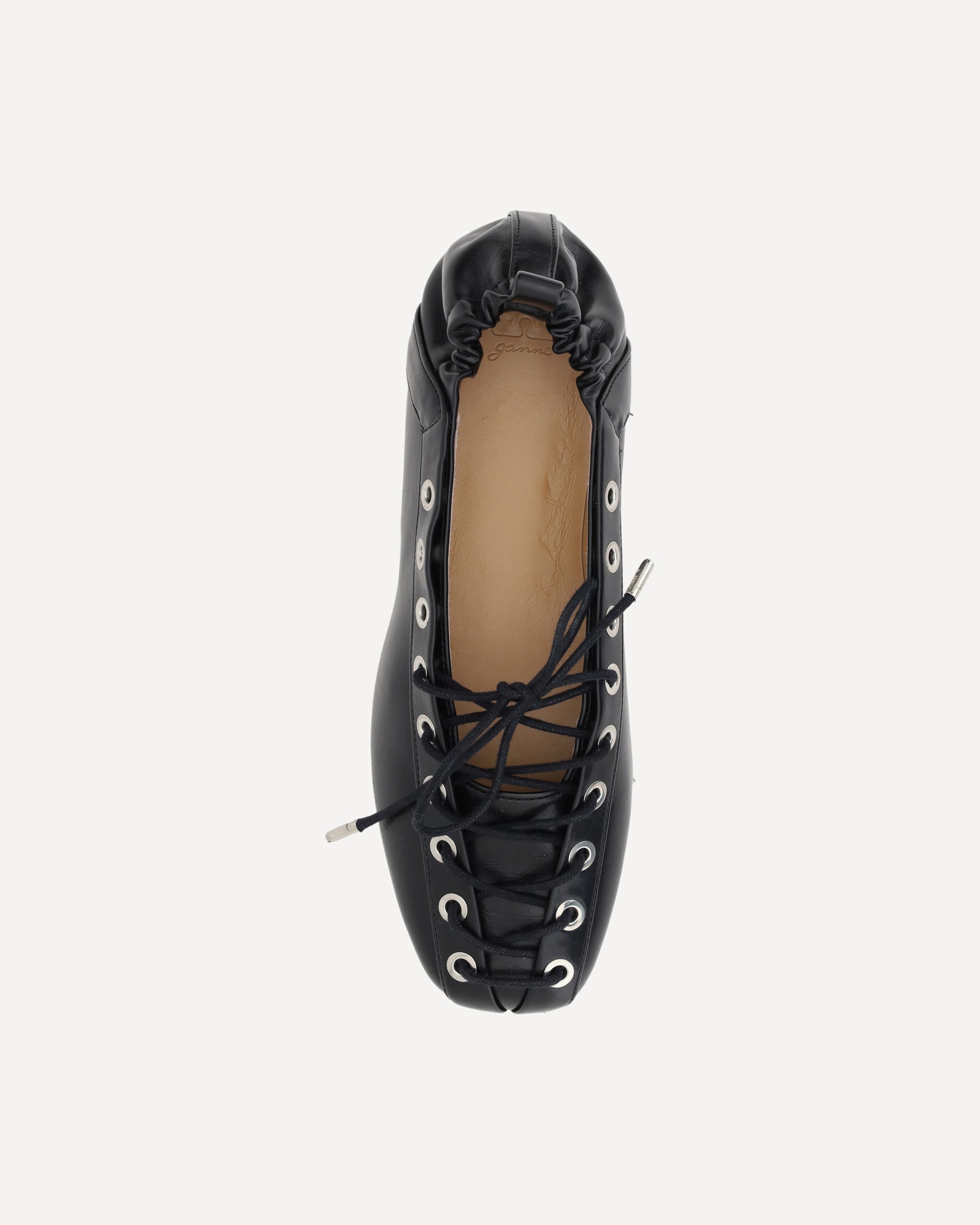 Le Ballerine di Ganni presentano una punta squadrata per un look moderno e distintivo. Realizzate in una miscela innovativa di Oleatex stropicciato, queste ballerine offrono un tocco di originalità e sostenibilità. Gli occhielli metallici distintivi e i lacci cerati incrociati che si allacciano sul davanti permettono una calzata facile e regolabile. La suola piatta e la soletta logata completano il design con comfort e un accento di lusso.