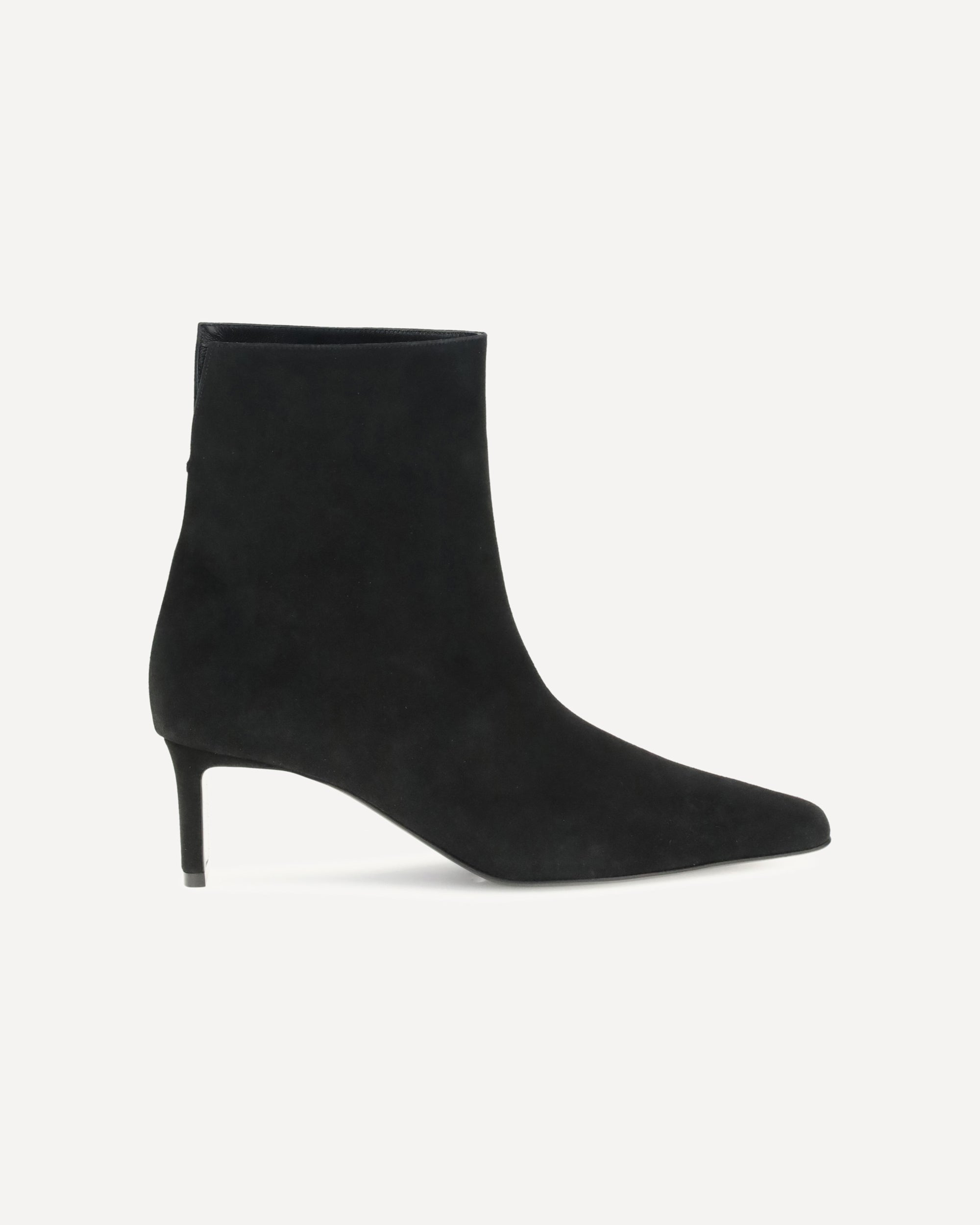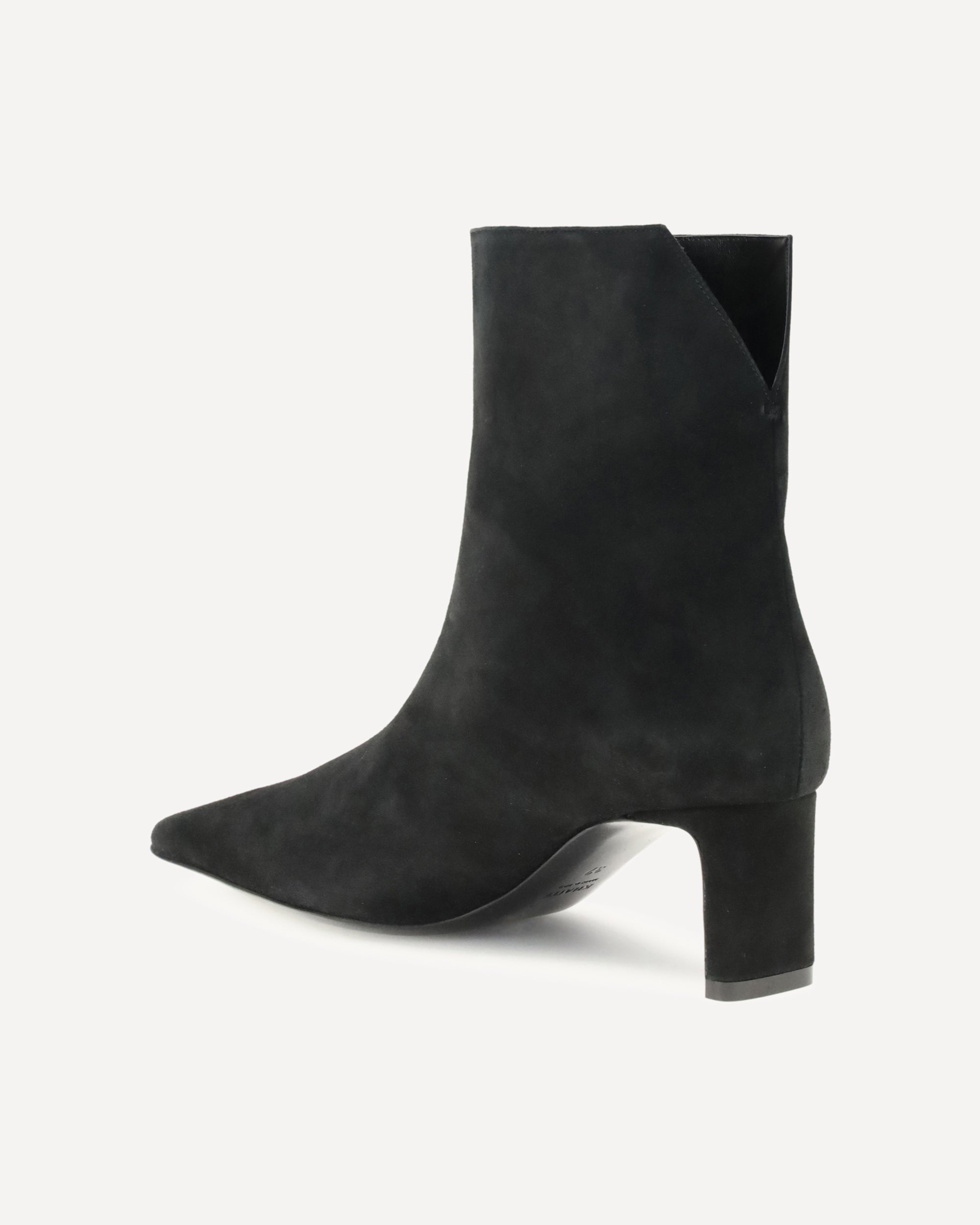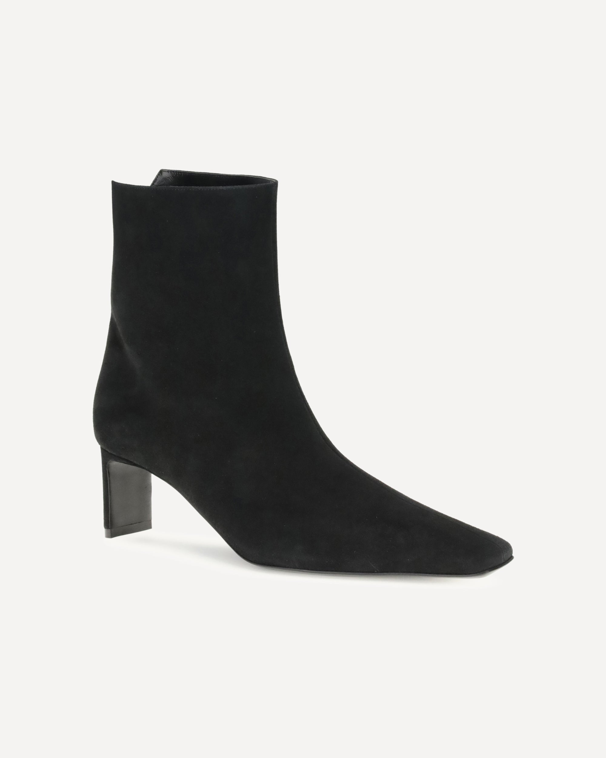 Gli Stivaletti di Khaite combinano eleganza essenziale e linee decise in un design contemporaneo. Realizzati in morbido camoscio nero, presentano una silhouette affusolata con punta squadrata e struttura slip-on che avvolge il piede con sobria raffinatezza. Il tacco squadrato tono su tono completa il look con un equilibrio perfetto tra modernità e femminilità, ideale per valorizzare sia outfit casual che più sofisticati.