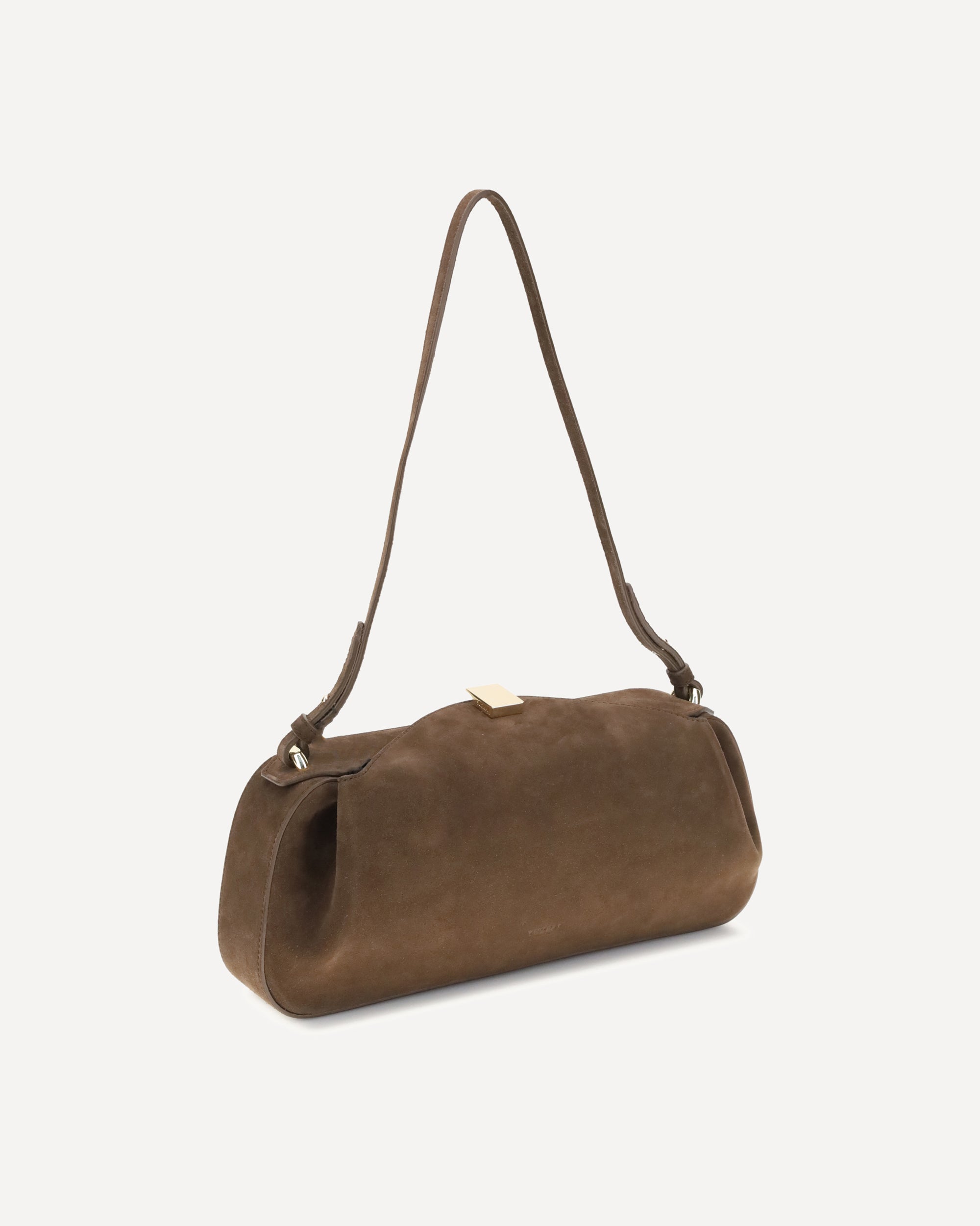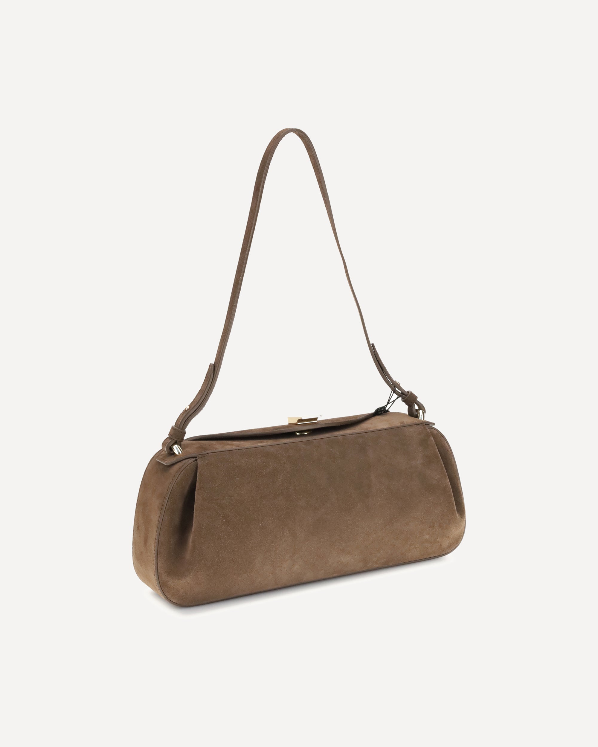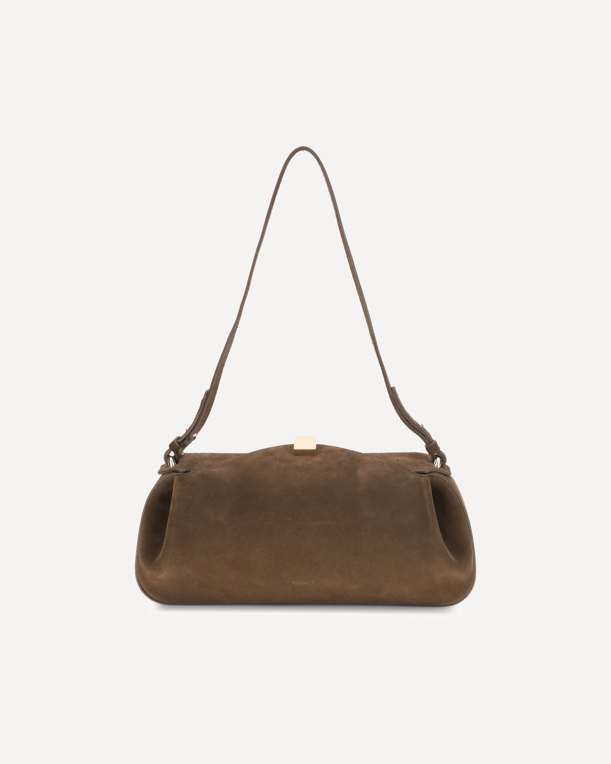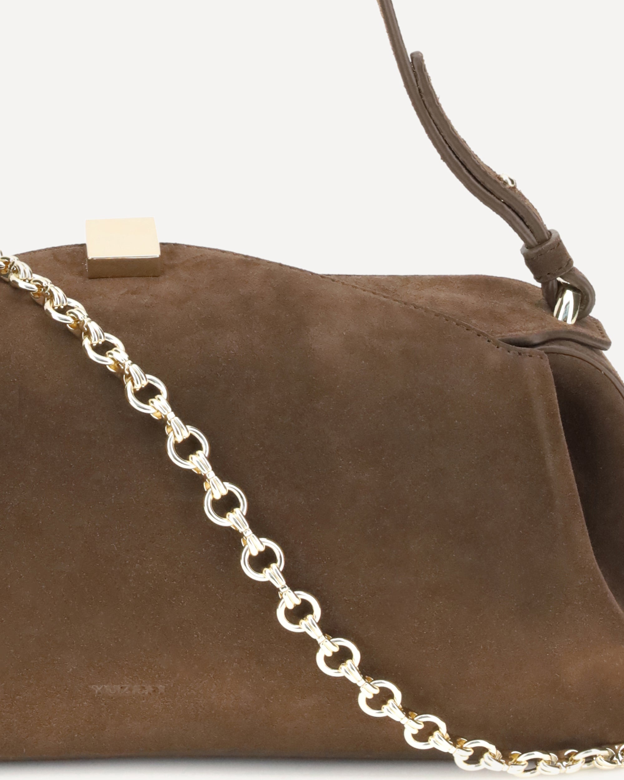 La Borsa a Spalla Oyster di Yuzefi è realizzata in pregiata pelle scamosciata e unisce eleganza e funzionalità in un design raffinato. La silhouette allungata offre spazio sufficiente per contenere tutti gli essenziali quotidiani, come telefono, chiavi e portafoglio. È dotata di tracolla regolabile in pelle e manico a catena rimovibile, entrambi con finiture color oro. La chiusura magnetica aggiunge praticità, rendendola perfetta sia per il giorno che per la sera.