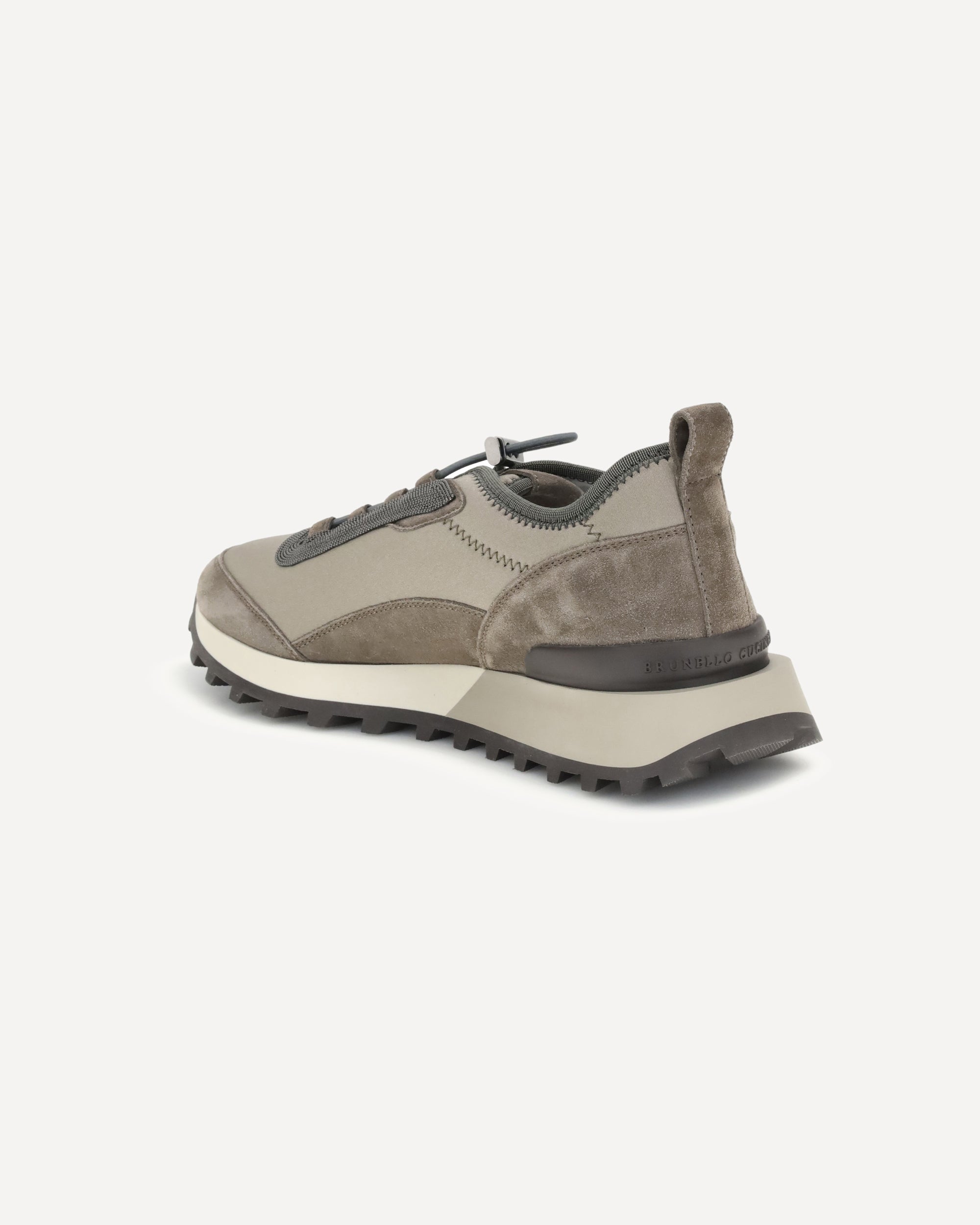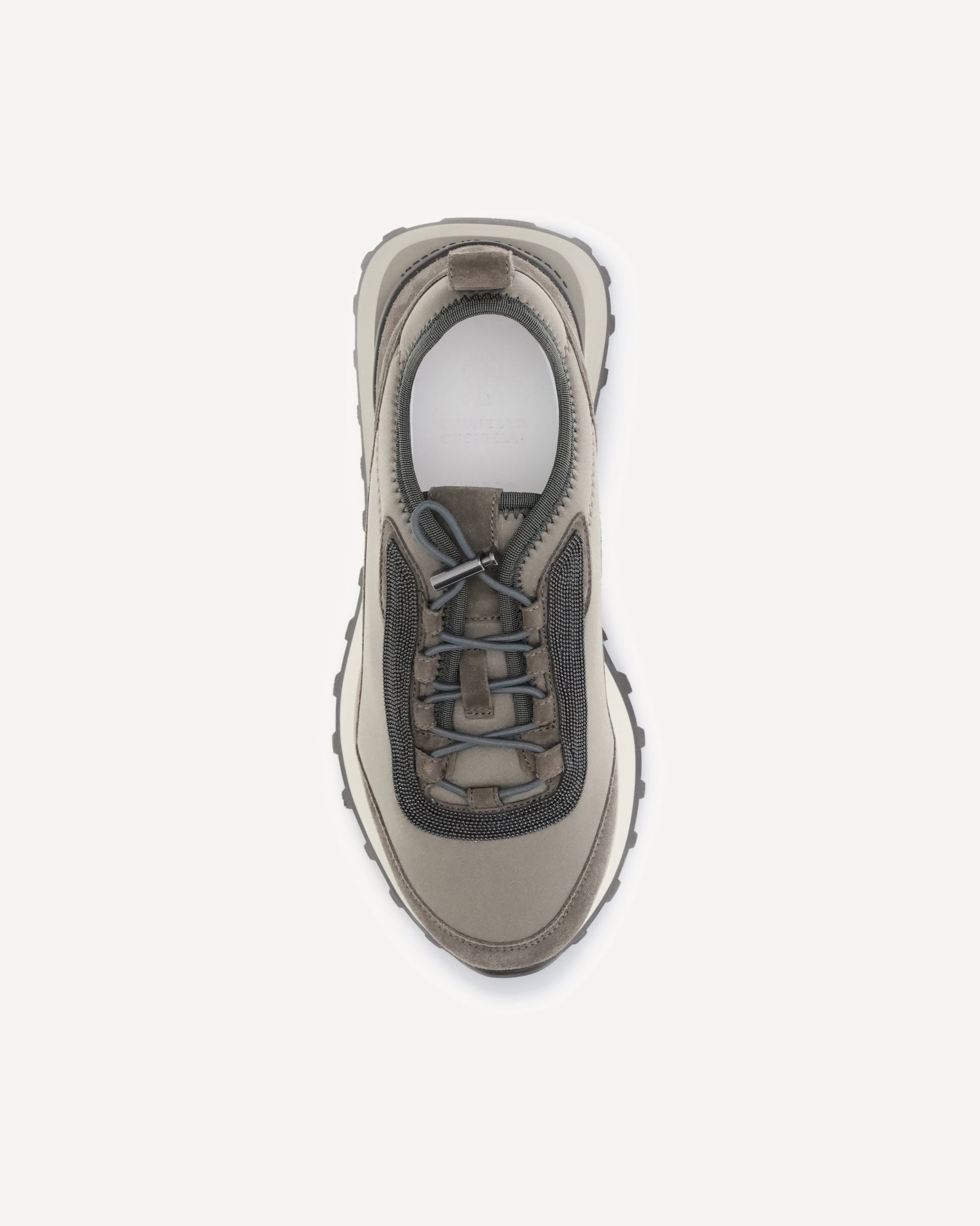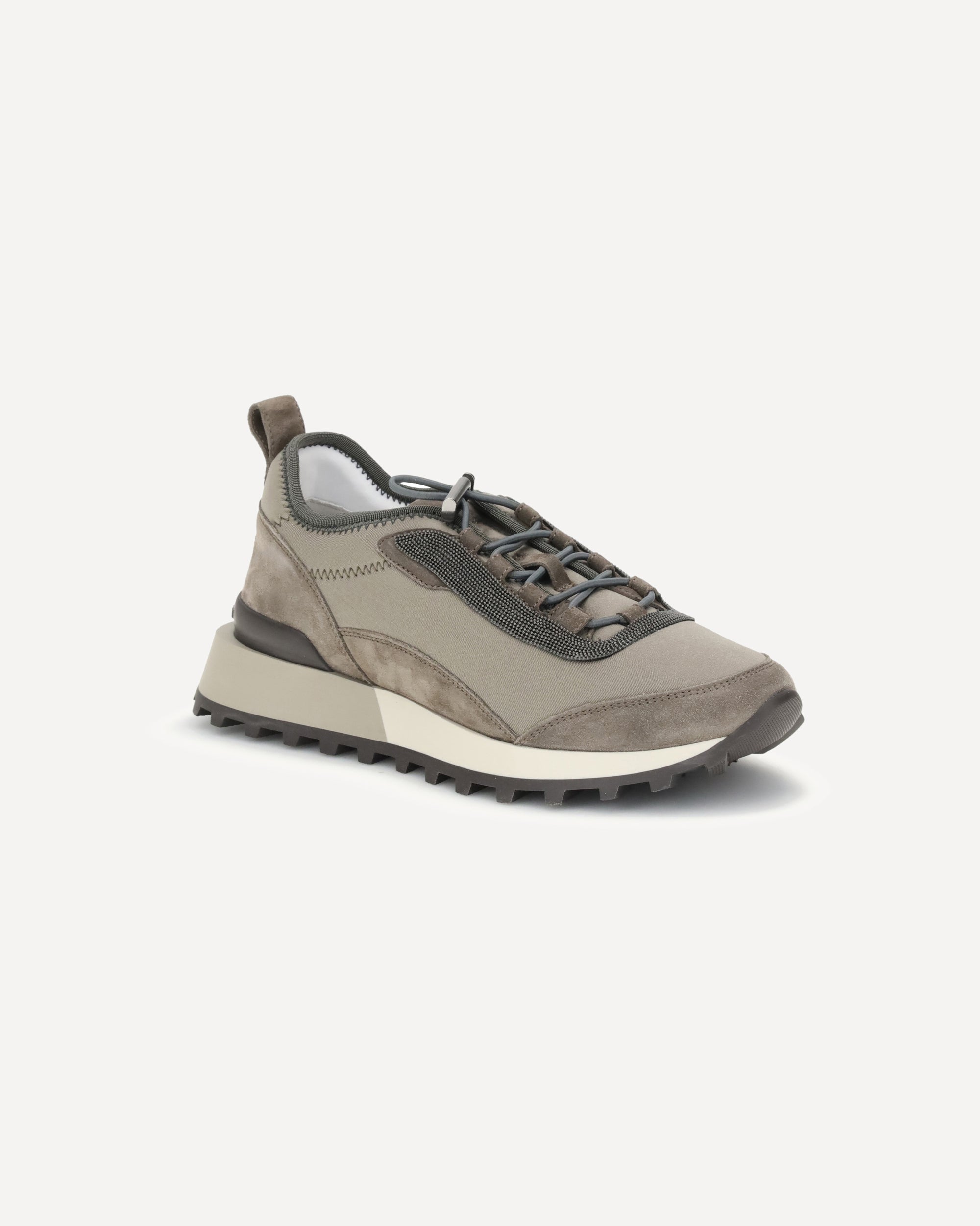 Le Sneakers in pelle di Brunello Cucinelli uniscono artigianalità e stile contemporaneo. La chiusura con coulisse offre una calzata pratica e moderna, mentre la fodera in pelle e tessuto garantisce comfort e traspirabilità. La suola in micro leggero con battistrada in gomma TPU assicura leggerezza e aderenza. Il tiretto sul tallone e i brillanti monili iconici applicati sulla tomaia aggiungono un tocco di eleganza discreta, tipico del savoir-faire del brand.