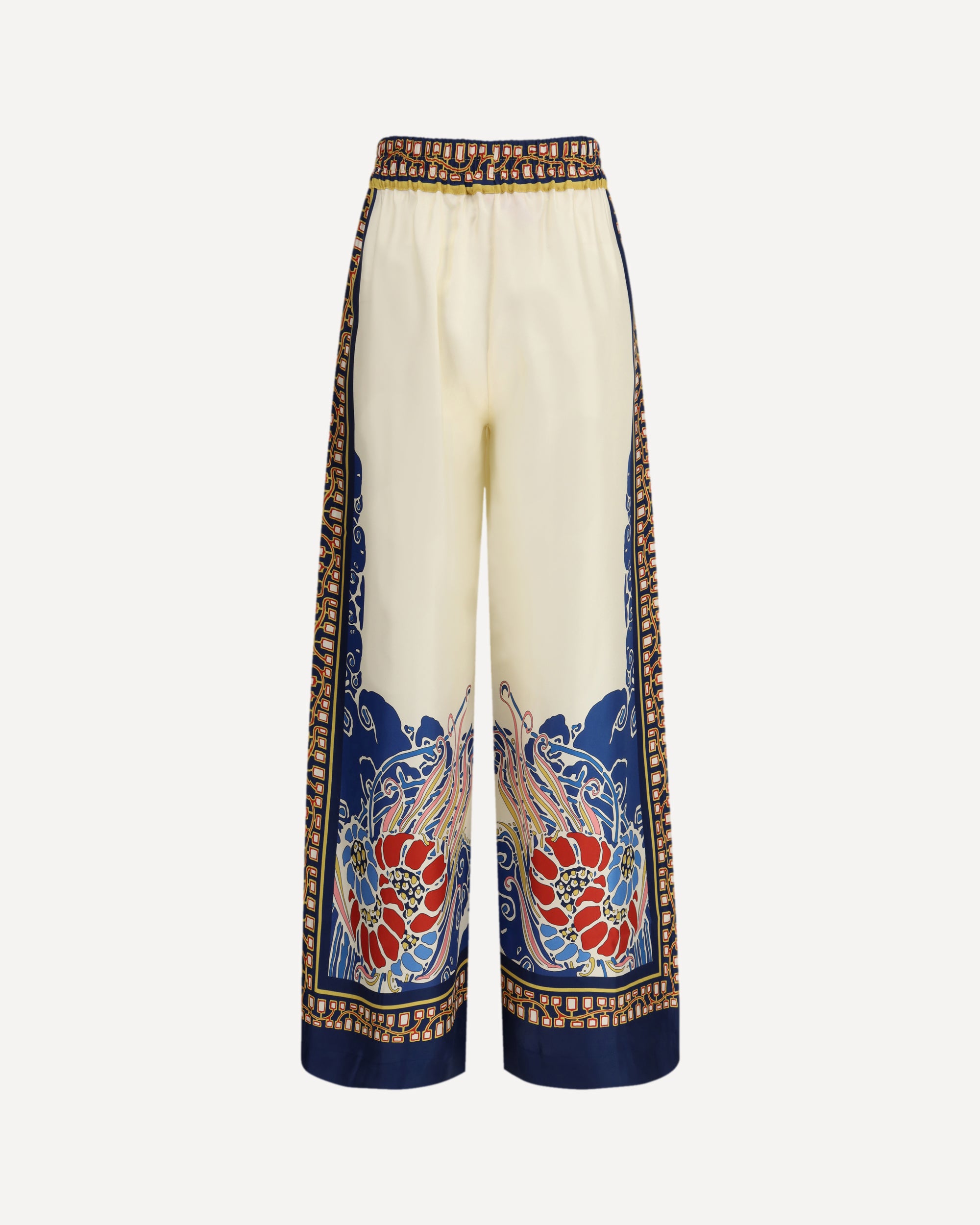 I Pantaloni Palazzo by La DoubleJ reinterpretano il classico pantalone a palazzo attraverso una linea ampia e leggera che richiama la fluidità di una gonna, mantenendo però tutta la praticità del pantalone. Realizzati in twill di seta del Lago di Como, offrono una mano liscia e una luminosità naturale grazie alla lavorazione intrecciata del tessuto. La vita elasticizzata garantisce comfort senza rinunciare alla forma, mentre le tasche laterali nascoste preservano la pulizia del design. La stampa, posizionata a mano, completa il modello con un motivo accuratamente definito. Un capo ideale per chi cerca un’eleganza rilassata e contemporanea.