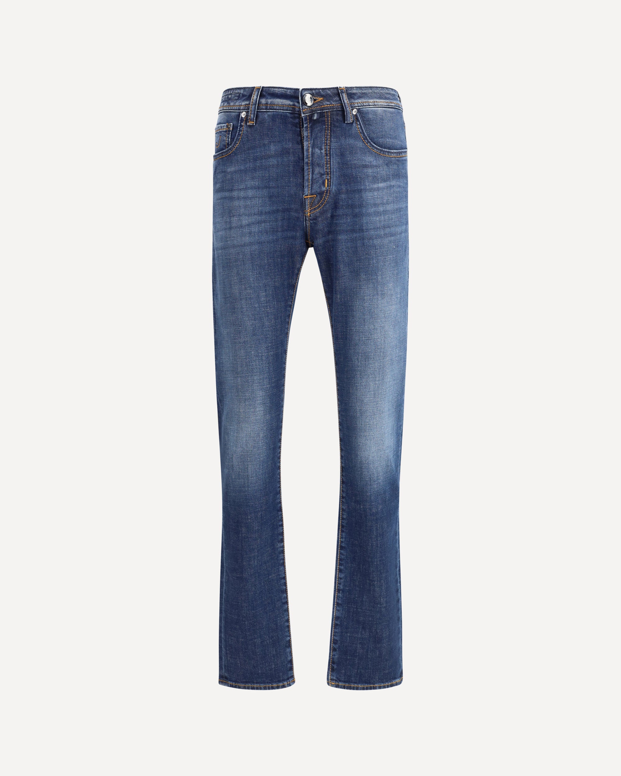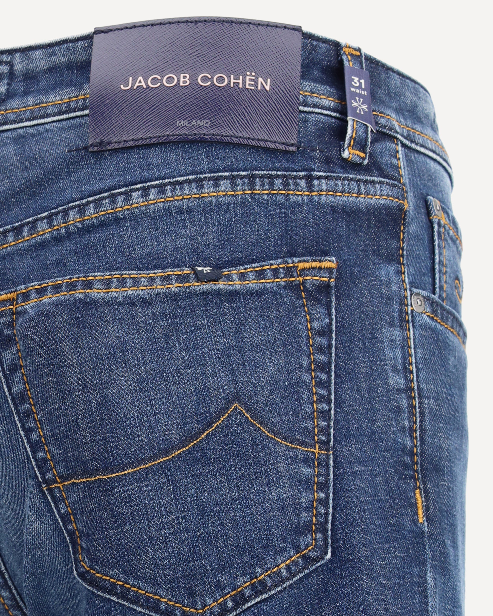 Il Pantalone Bard in Denim di Jacob Cohen propone una rilettura sofisticata del modello cinque tasche in versione slim fit. La chiusura con bottoni e la salpa in pelle con logo impresso sottolineano l’attenzione artigianale del brand, mentre il bottone in argento, inciso con stemma e nome, firma il capo con un dettaglio esclusivo. Completano il design le cuciture a contrasto, le rifiniture sartoriali e l’iconico kit con bandana a stampa geometrica e rocchetto di filo, segno distintivo della maison.