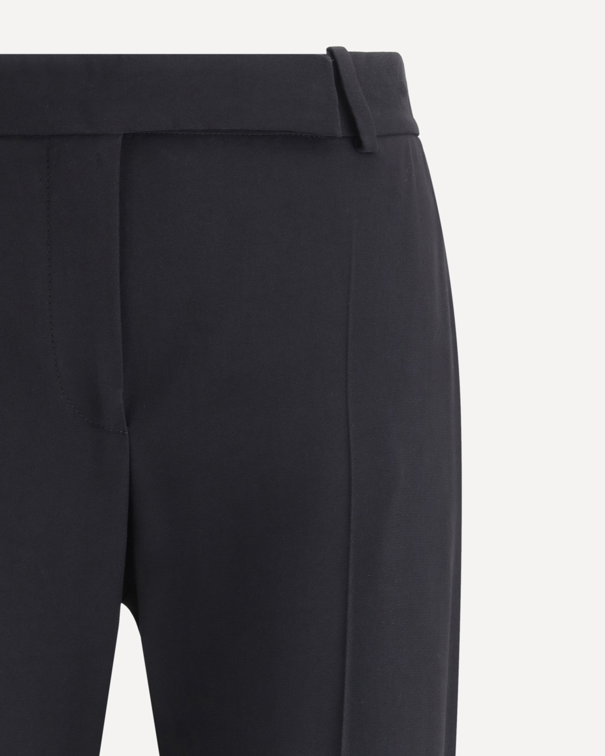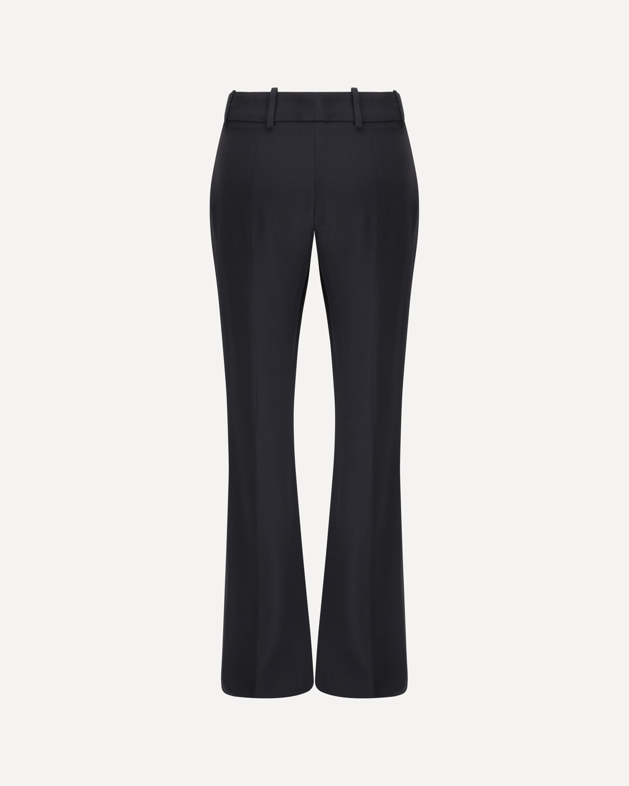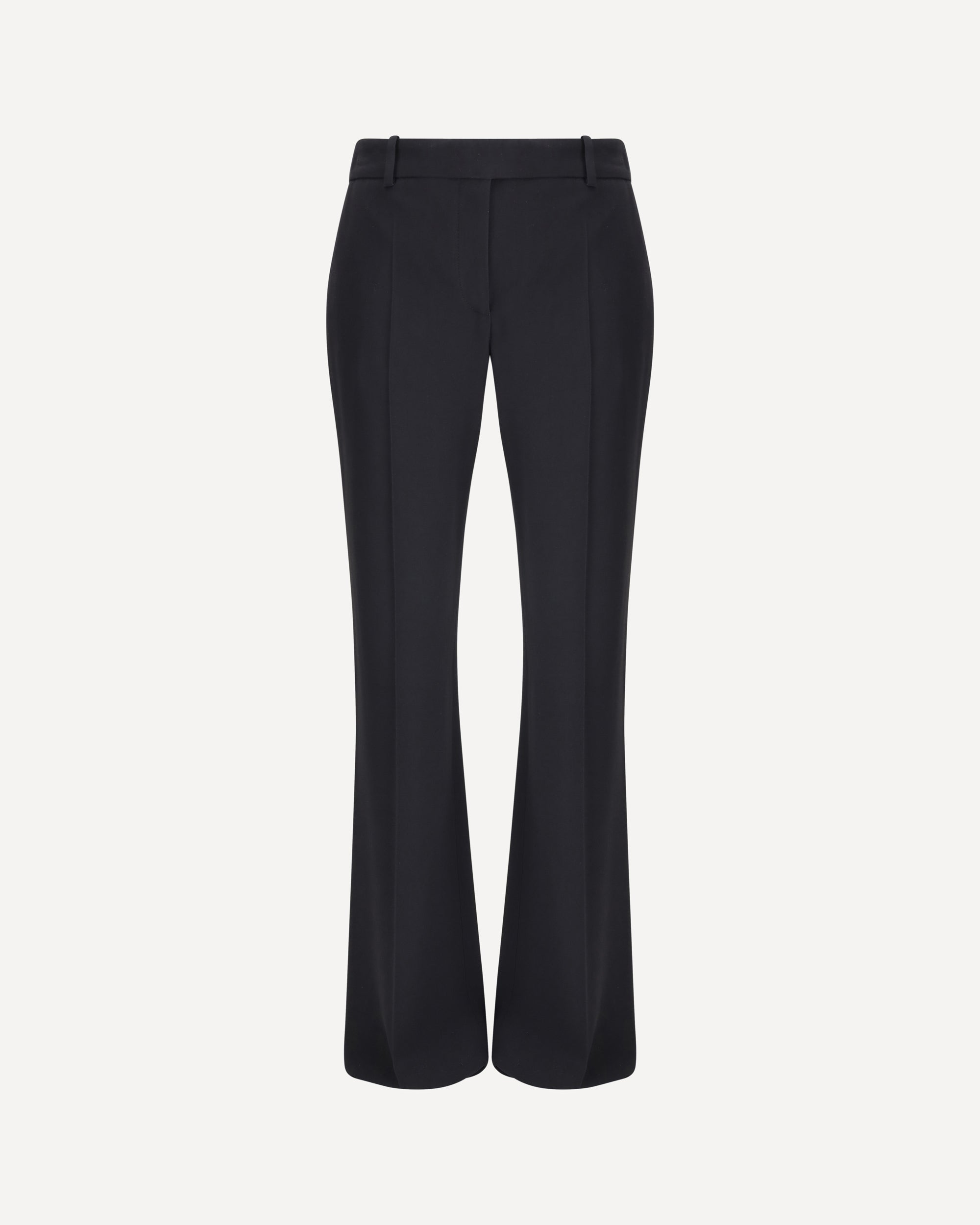 Pantaloni Neri di Alexander McQueen, chiusura con zip e gancio sul fronte, due tasche a chino, gamba svasata, tasca a filetto sul retro.