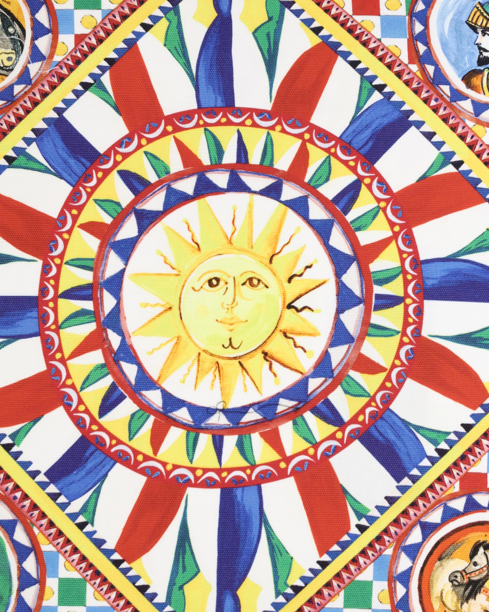 Il Cuscino in canvas Carretto Siciliano di Dolce&Gabbana celebra le radici culturali del brand attraverso una stampa ispirata al tradizionale carretto siciliano, simbolo del folklore locale e delle arti decorative dell’isola. Il motivo, tratto da un foulard d’archivio, è vivace e ricco di dettagli, mentre il bordo piatto valorizza la generosa imbottitura. Sfoderabile e dotato di chiusura a zip. Dimensioni: 45 x 45 cm.