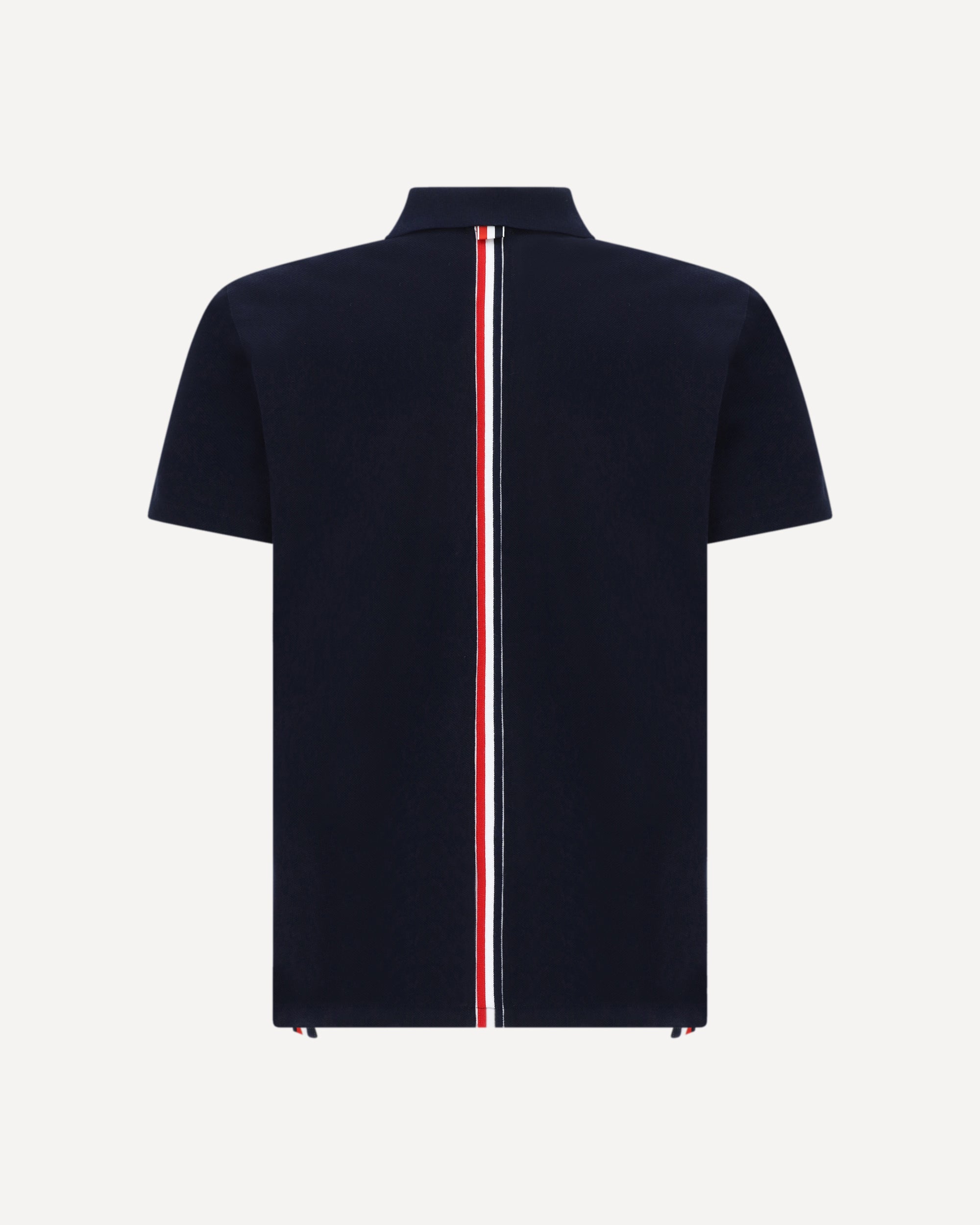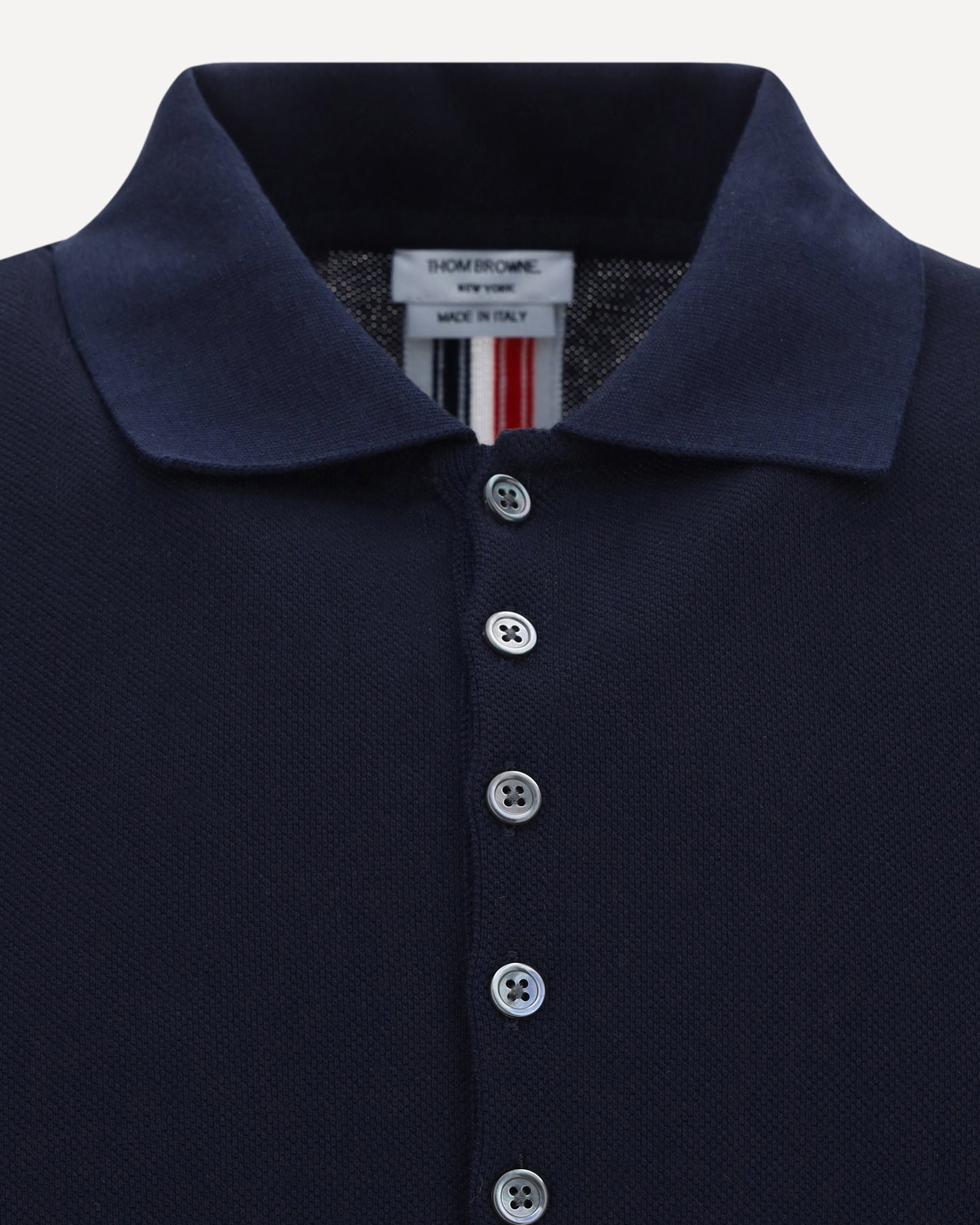 Maglia Polo in Cotone di Thom Browne, colletto classico, chiusura con bottoni sul fronte, dettaglio iconica banda tricolore del brand applicata sul retro, iconica patch con firma brand a contrasto sul fronte.