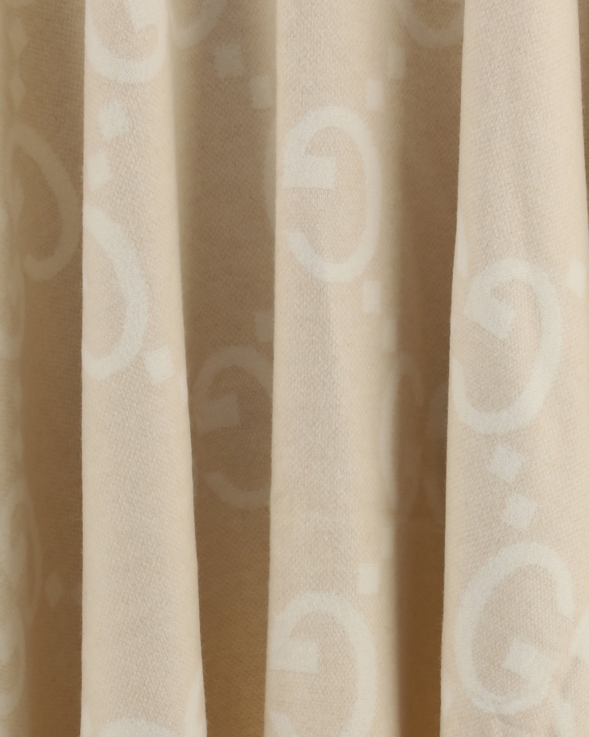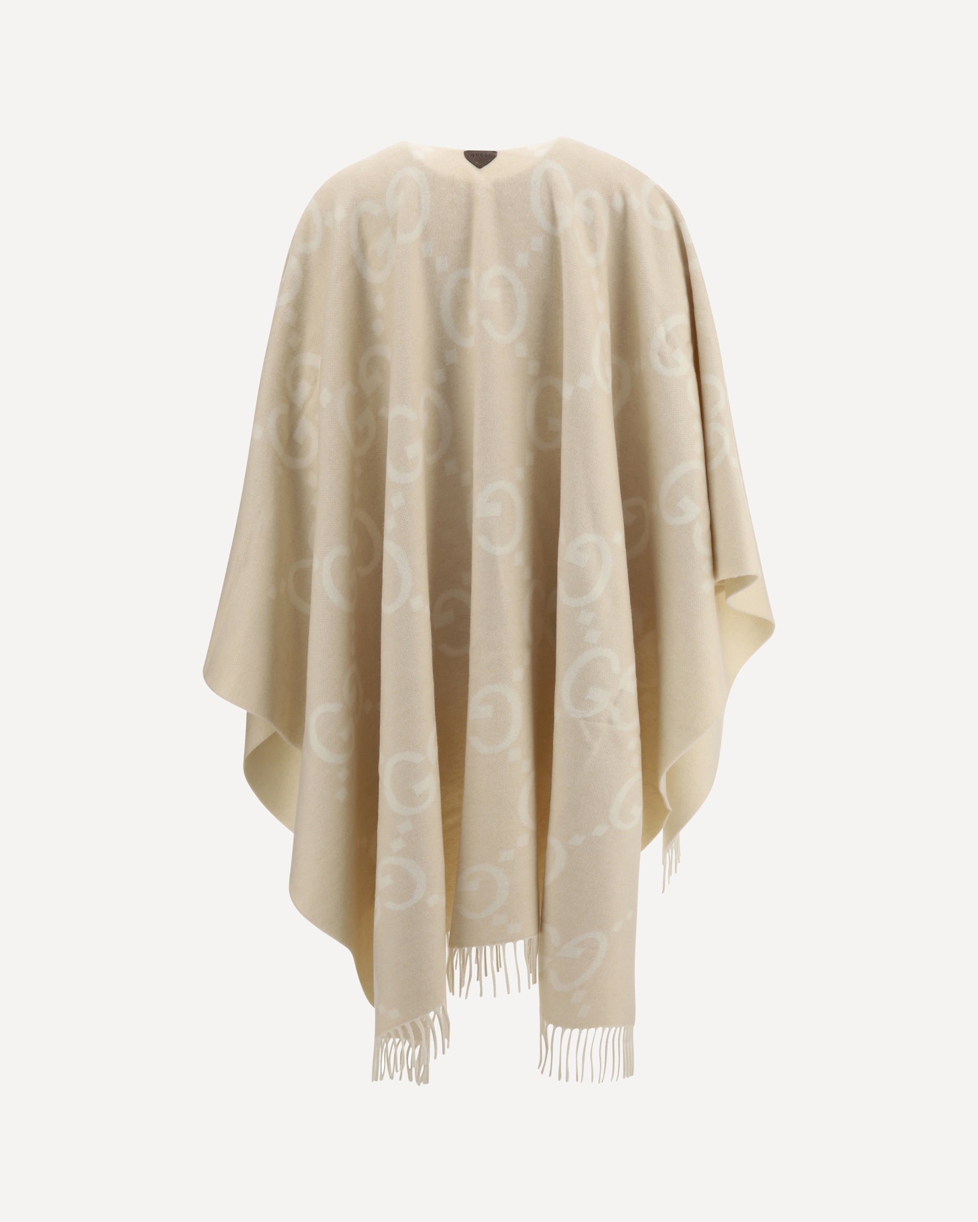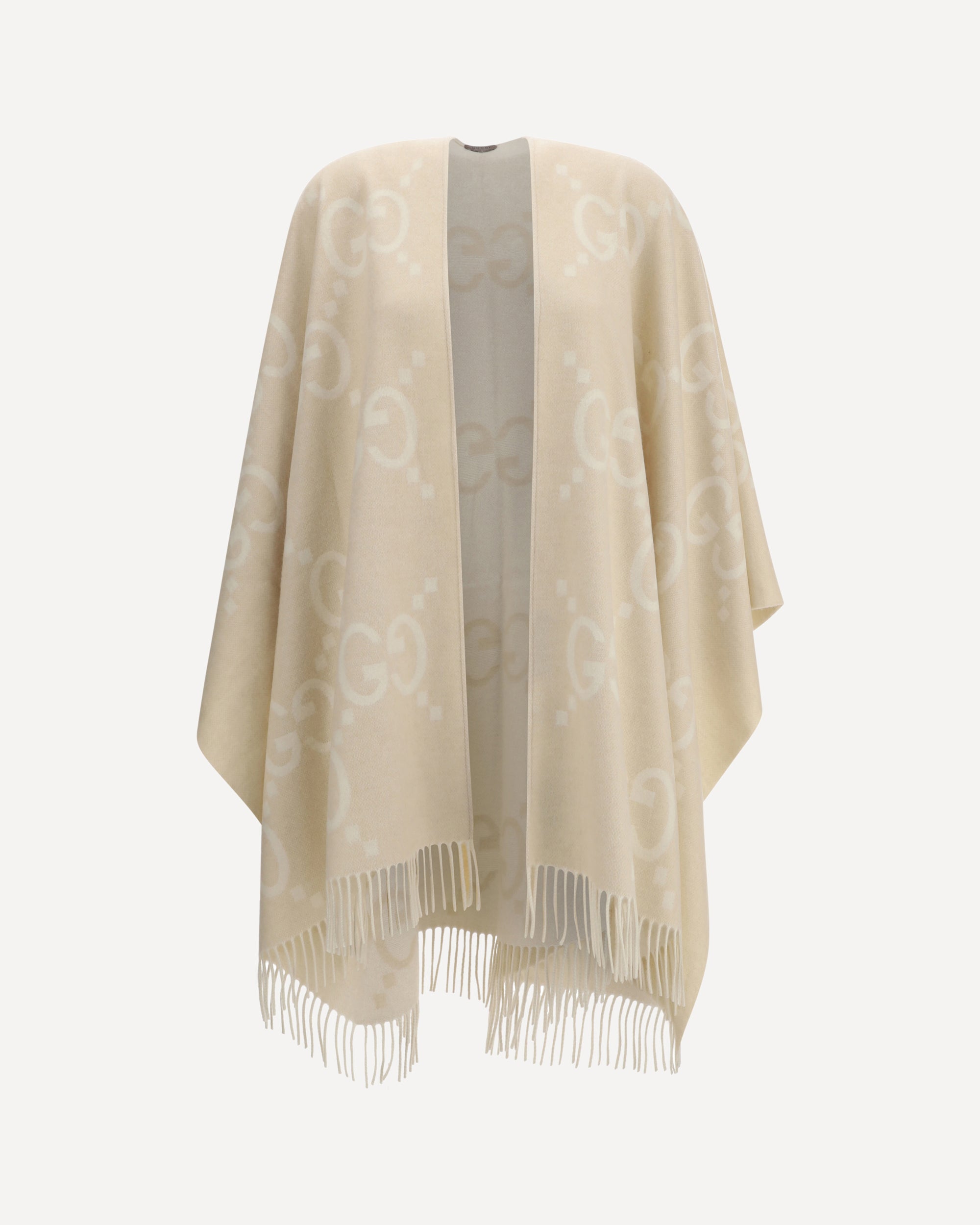 Poncho in cashmere di Gucci, design a mantella reversibile, rever sciallato, orlo sfrangiato, iconico logo brand a contrasto all-over, vestibilità oversize.
