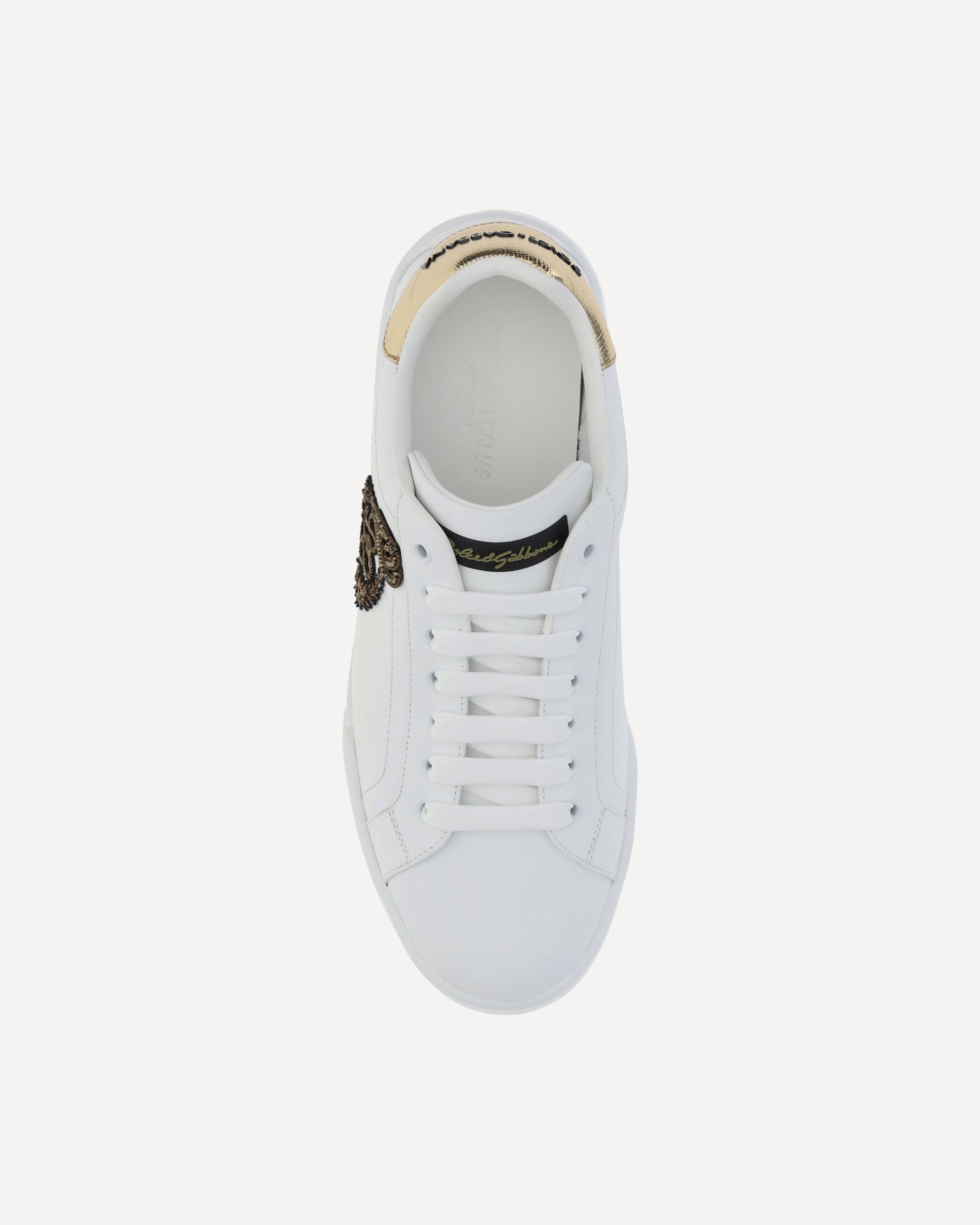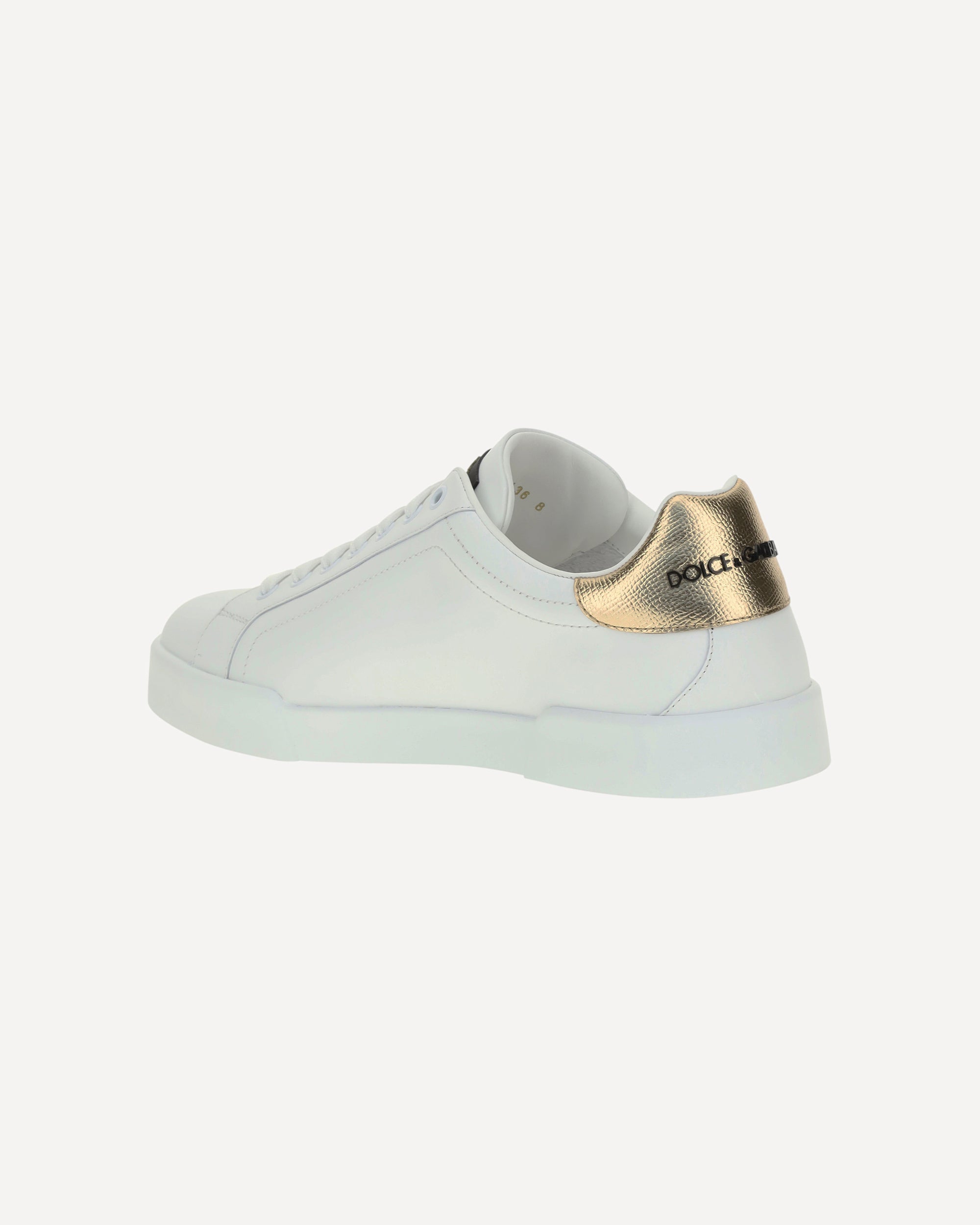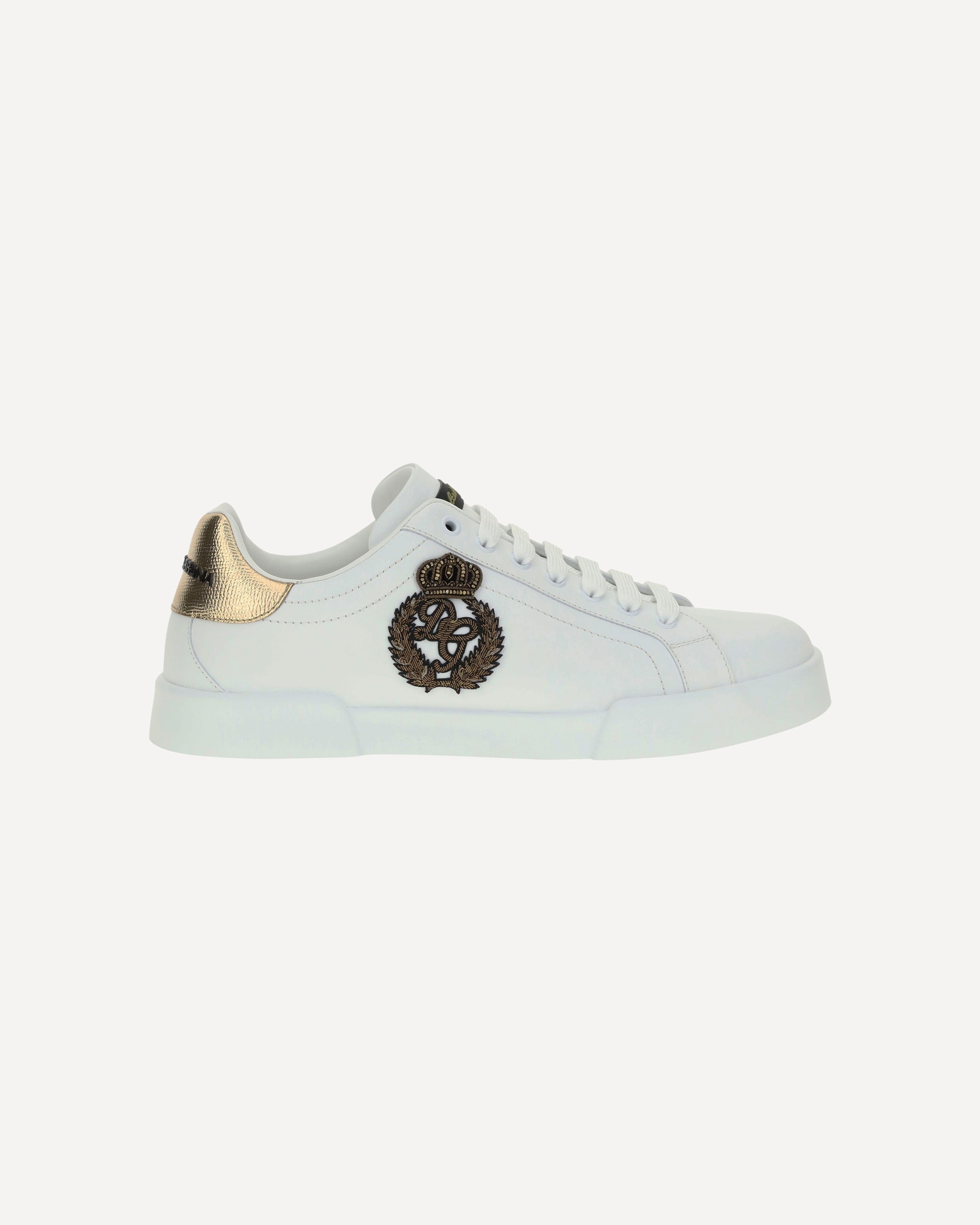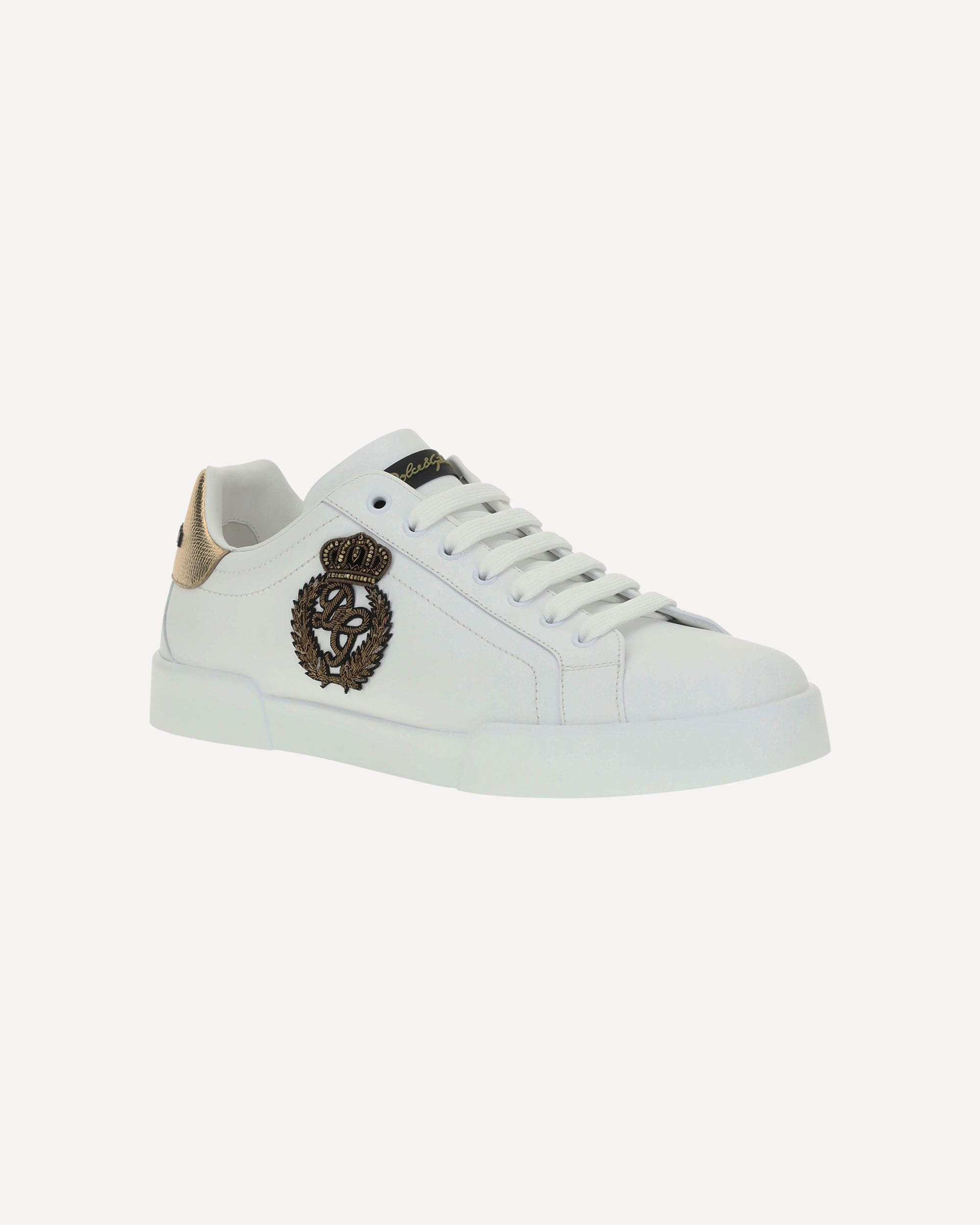 Le Sneakers in pelle Portofino di Dolce&Gabbana sono un perfetto mix di stile e comfort. La chiusura con lacci garantisce una calzata sicura, mentre la tallonetta a contrasto laminato con logo gommato aggiunge un tocco distintivo. Il Fussbett in vitello con etichetta logata e la suola piatta in gomma assicurano comfort e una camminata stabile, rendendole ideali per un look casual e alla moda.