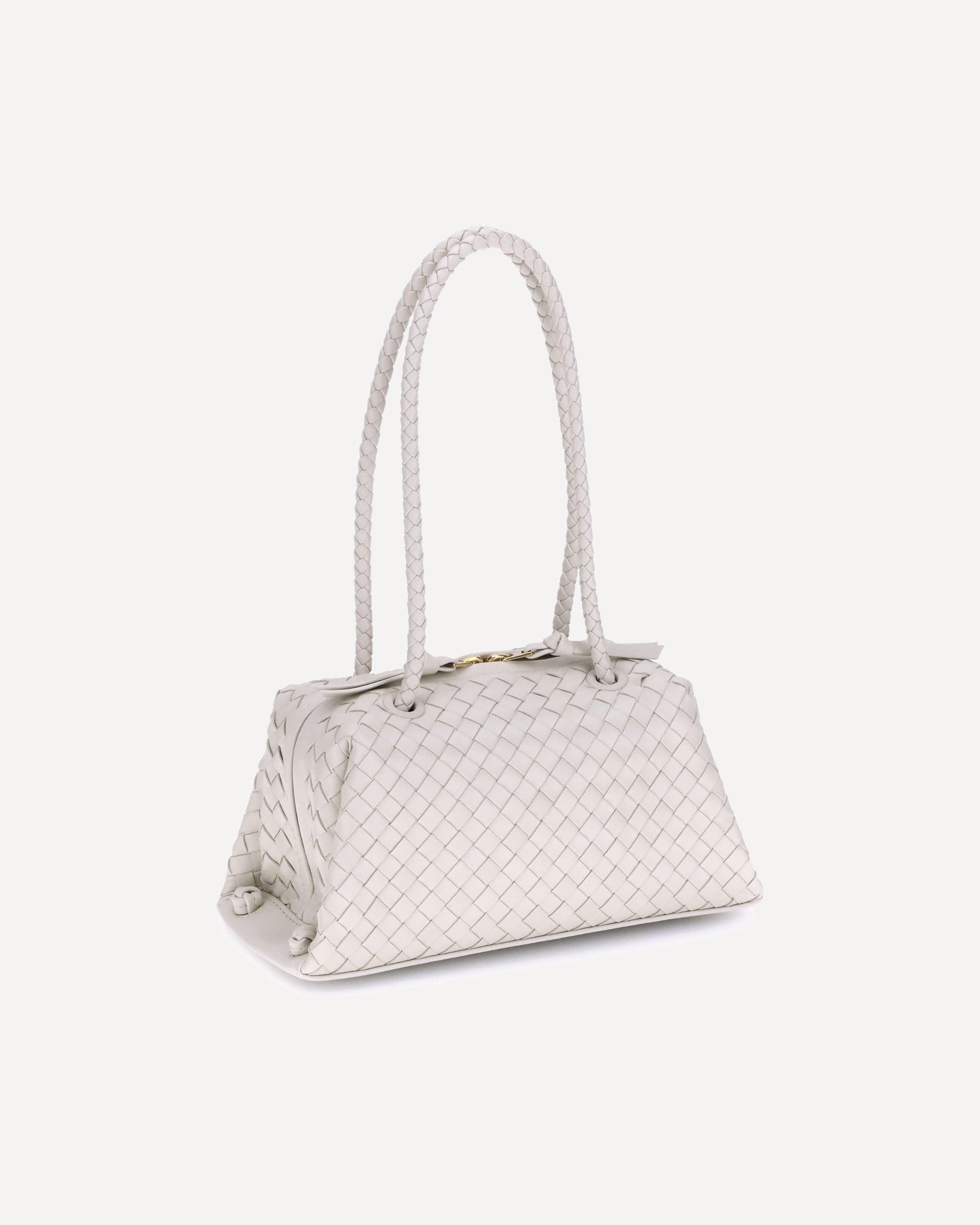 Borsa a Spalla Tokyo in morbida pelle d’agnello di Bottega Veneta, raffinata ed essenziale. Caratterizzata da due manici tubolari intrecciati superiori che richiamano l’artigianalità distintiva del brand. La chiusura con cerniera a doppio cursore garantisce praticità e sicurezza. Il design è impreziosito dall’iconico motivo intrecciato all-over, simbolo senza tempo della maison. L’interno presenta un unico scomparto ampio e funzionale, perfetto per contenere con eleganza tutti gli oggetti essenziali.