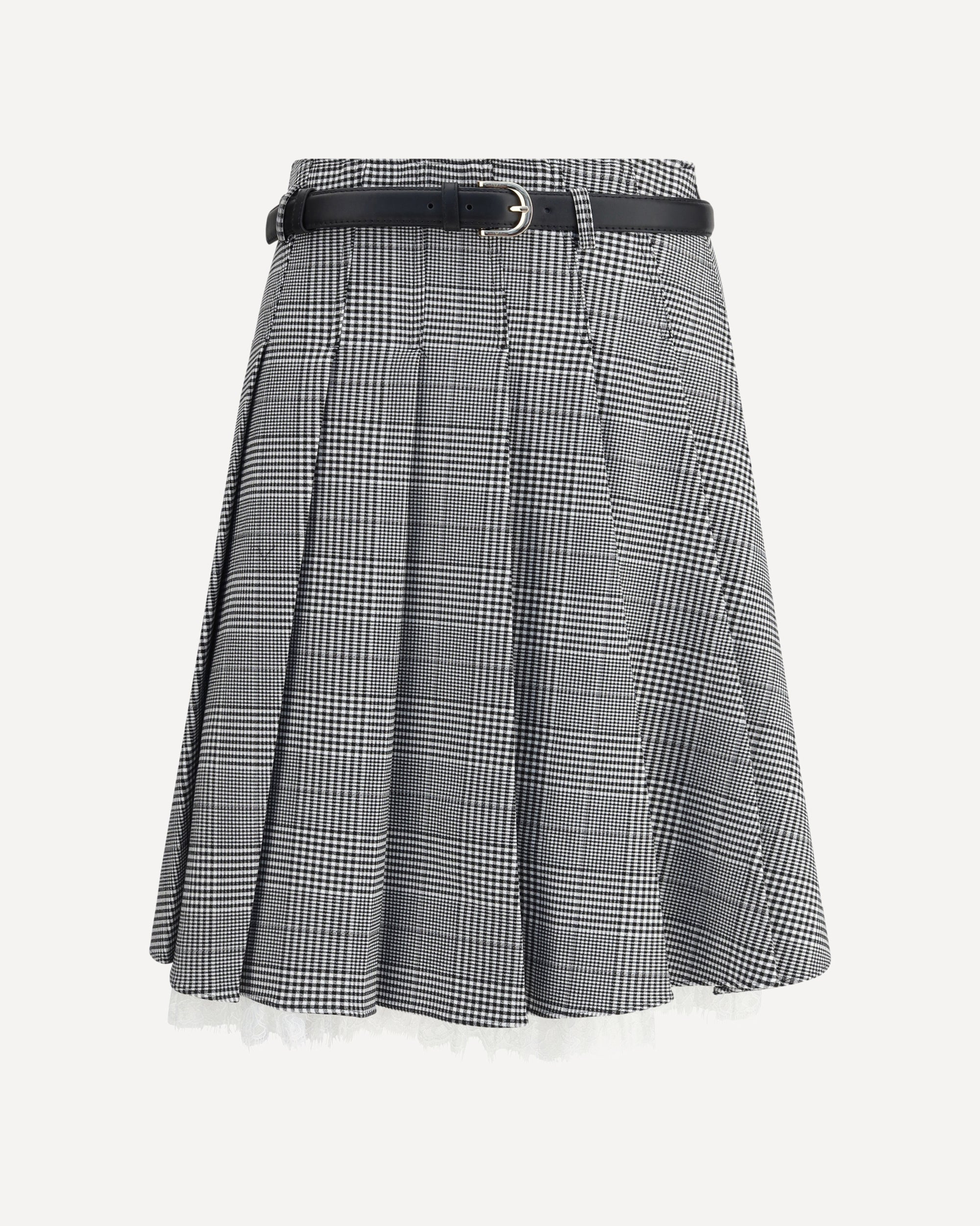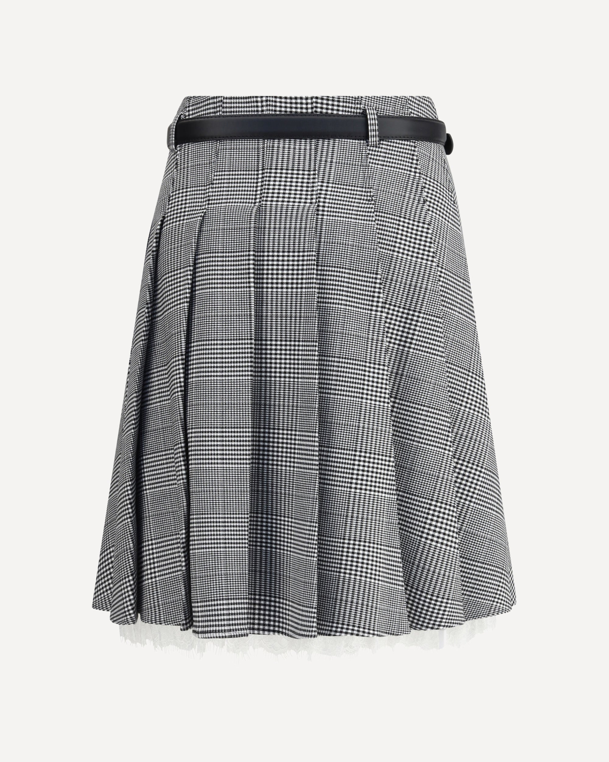 La Minigonna con stampa Principe di Galles di Self-Portrait unisce tradizione e modernità in un design a pieghe dal carattere deciso. Realizzata con stampa check, è arricchita da un sottogonna in pizzo che aggiunge un tocco femminile e inaspettato. I passanti per cintura in vita completano il capo, perfetto per look dal gusto sartoriale ma contemporaneo.