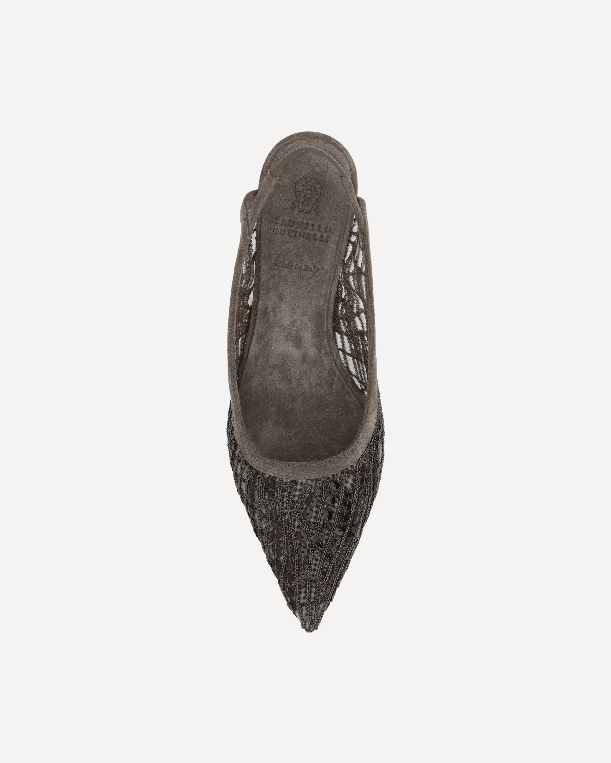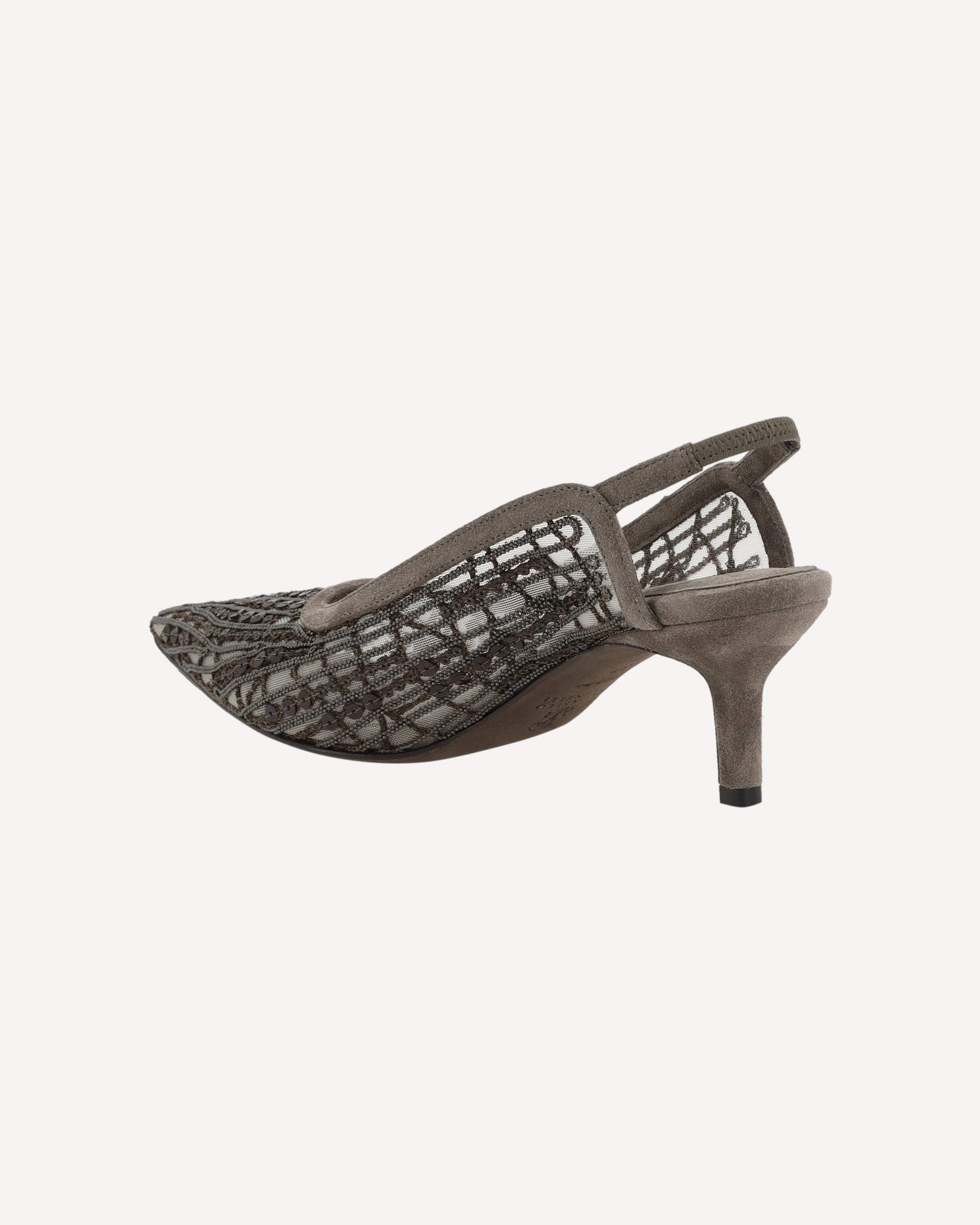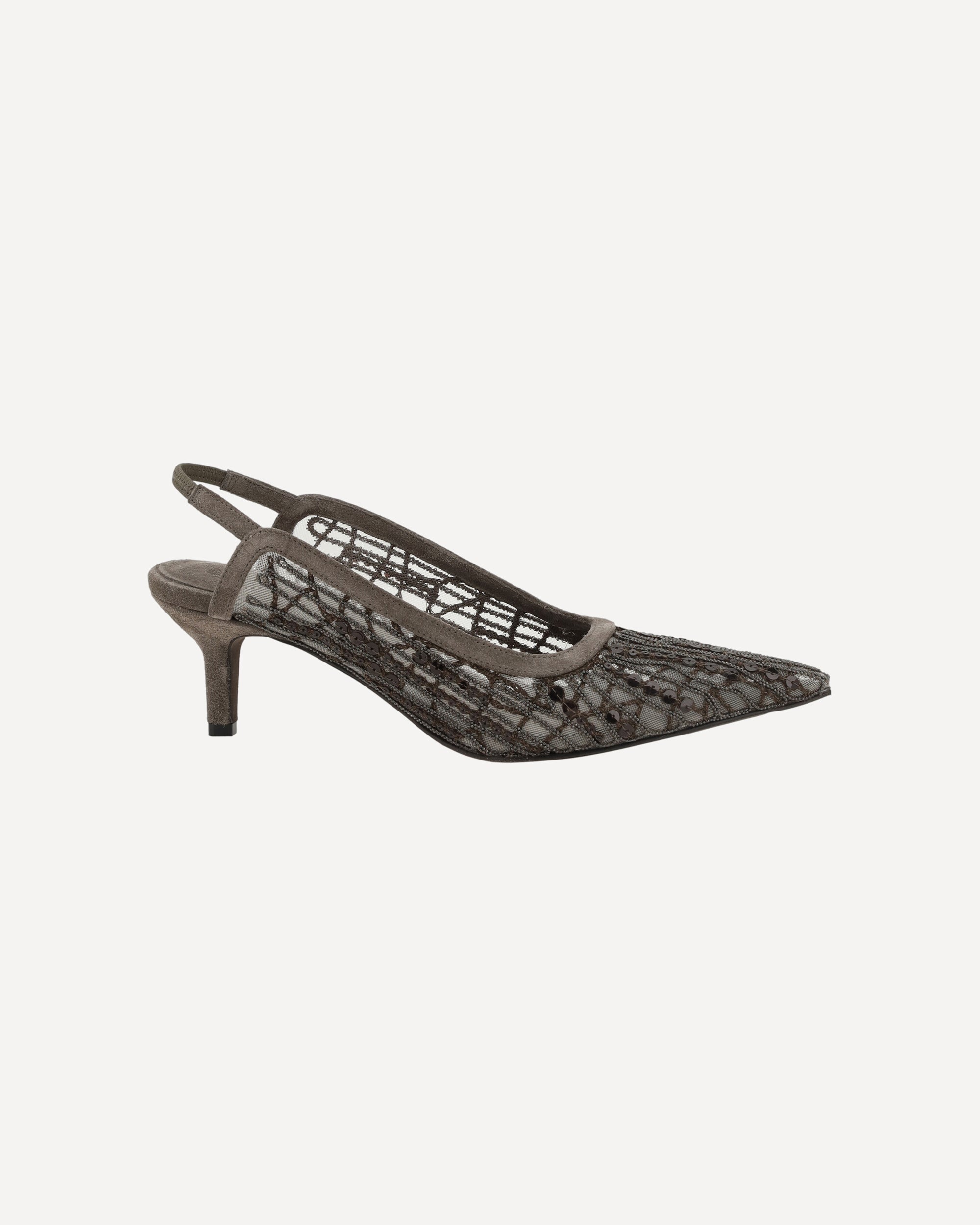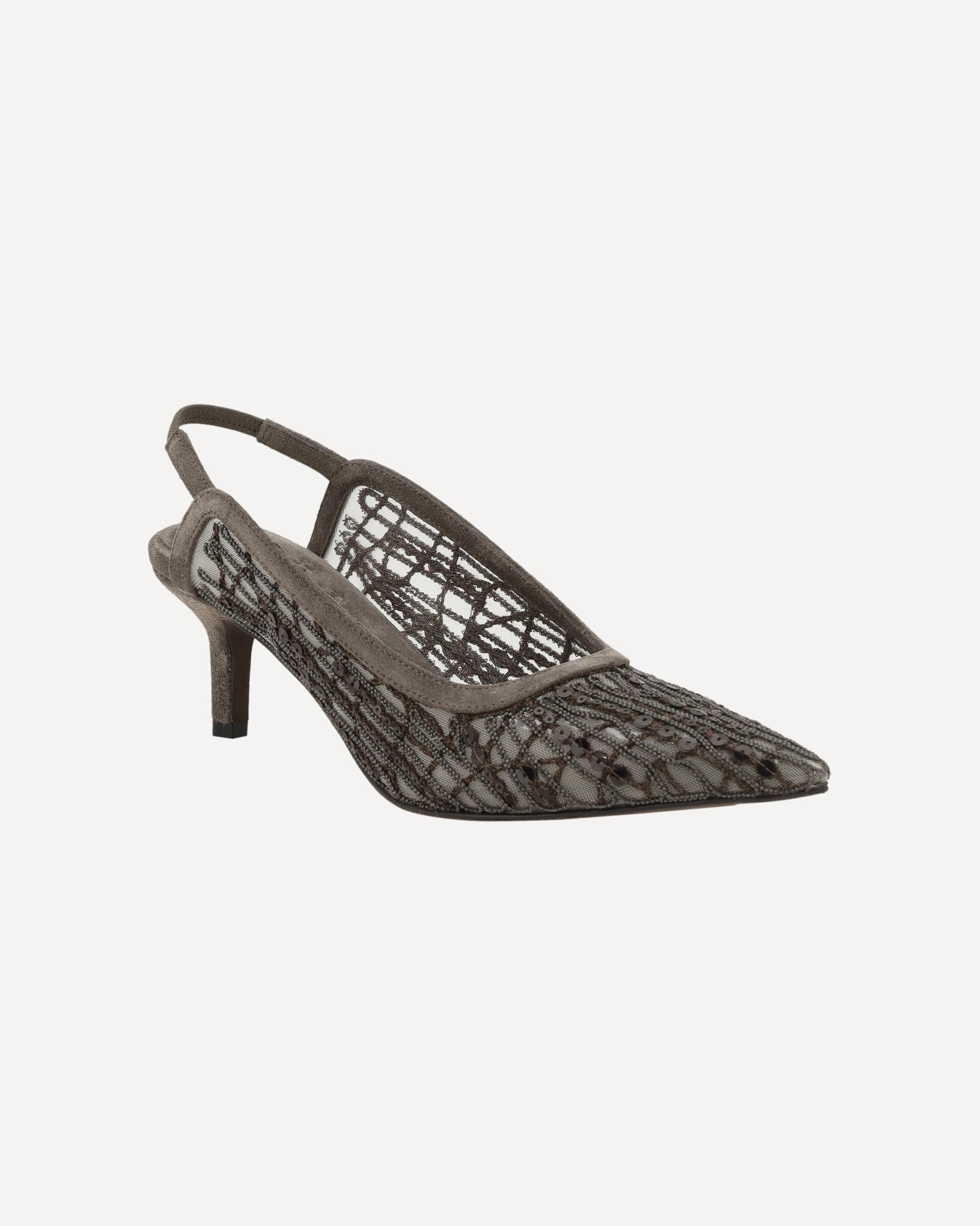 Décolleté in pelle scamosciata di Brunello Cucinelli, con punta allungata e design in rete arricchito da paillettes e sottili fili di monili brillanti, che aggiungono un tocco di eleganza e luminosità. Il tacco a stiletto dona un aspetto sofisticato e slanciato, mentre la soletta scamosciata logata garantisce comfort e stile. Un paio di scarpe raffinate, perfette per occasioni speciali e serate eleganti.