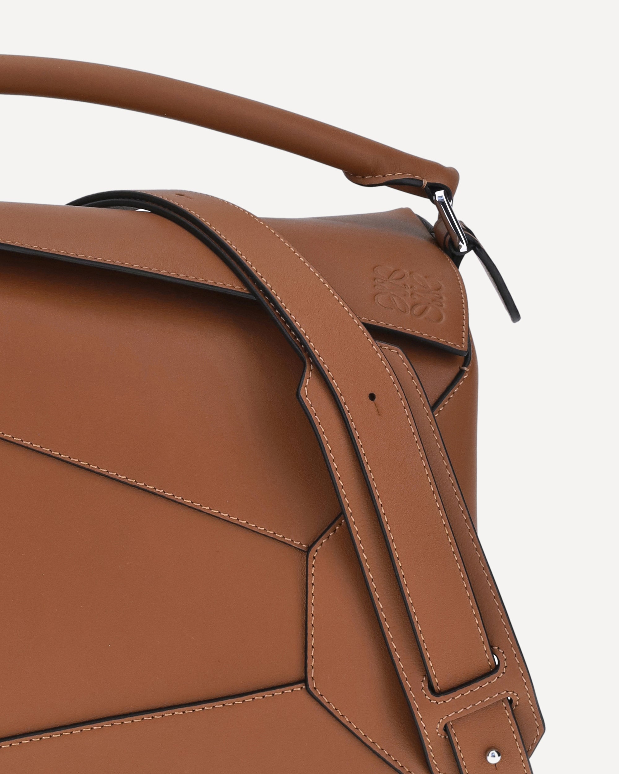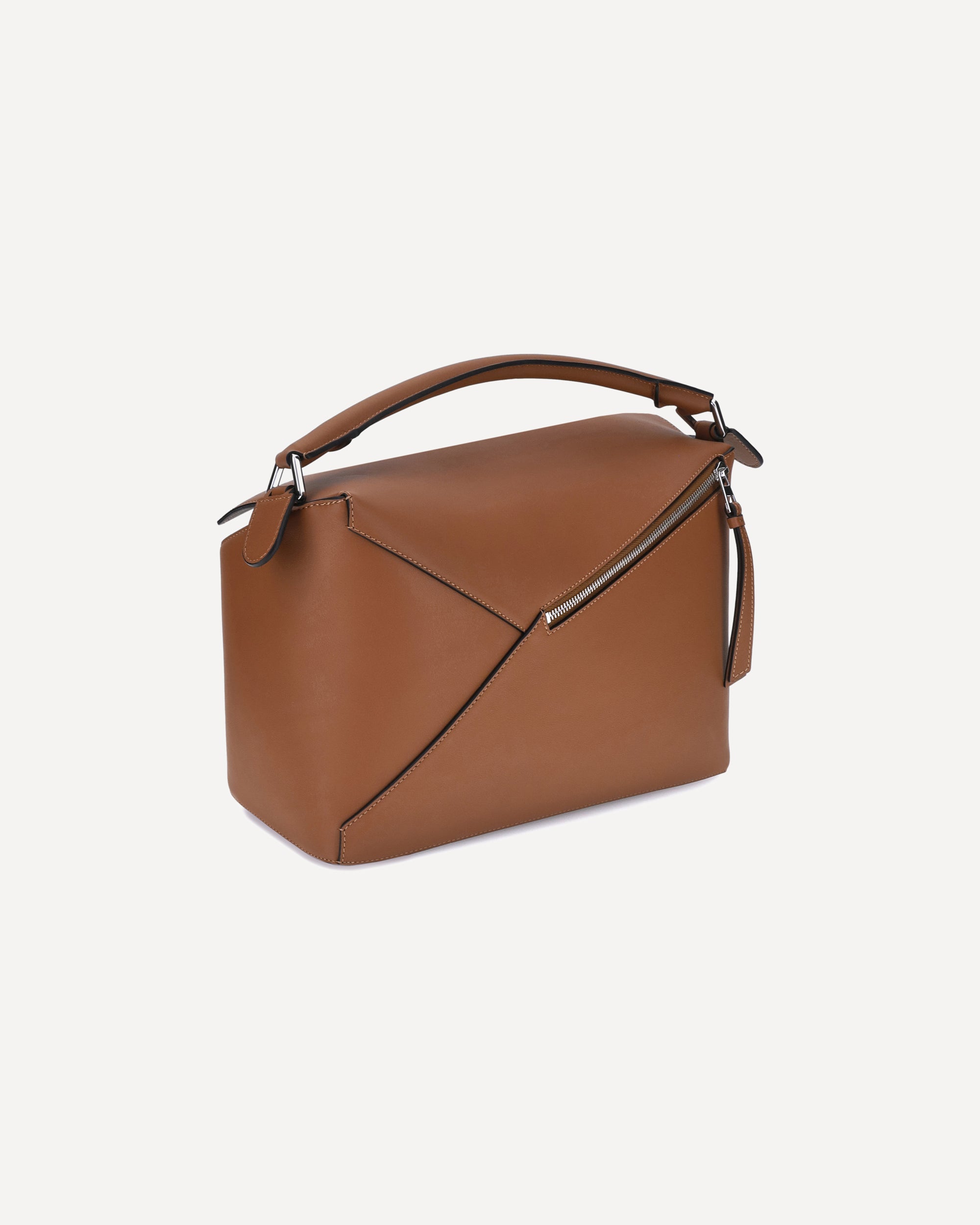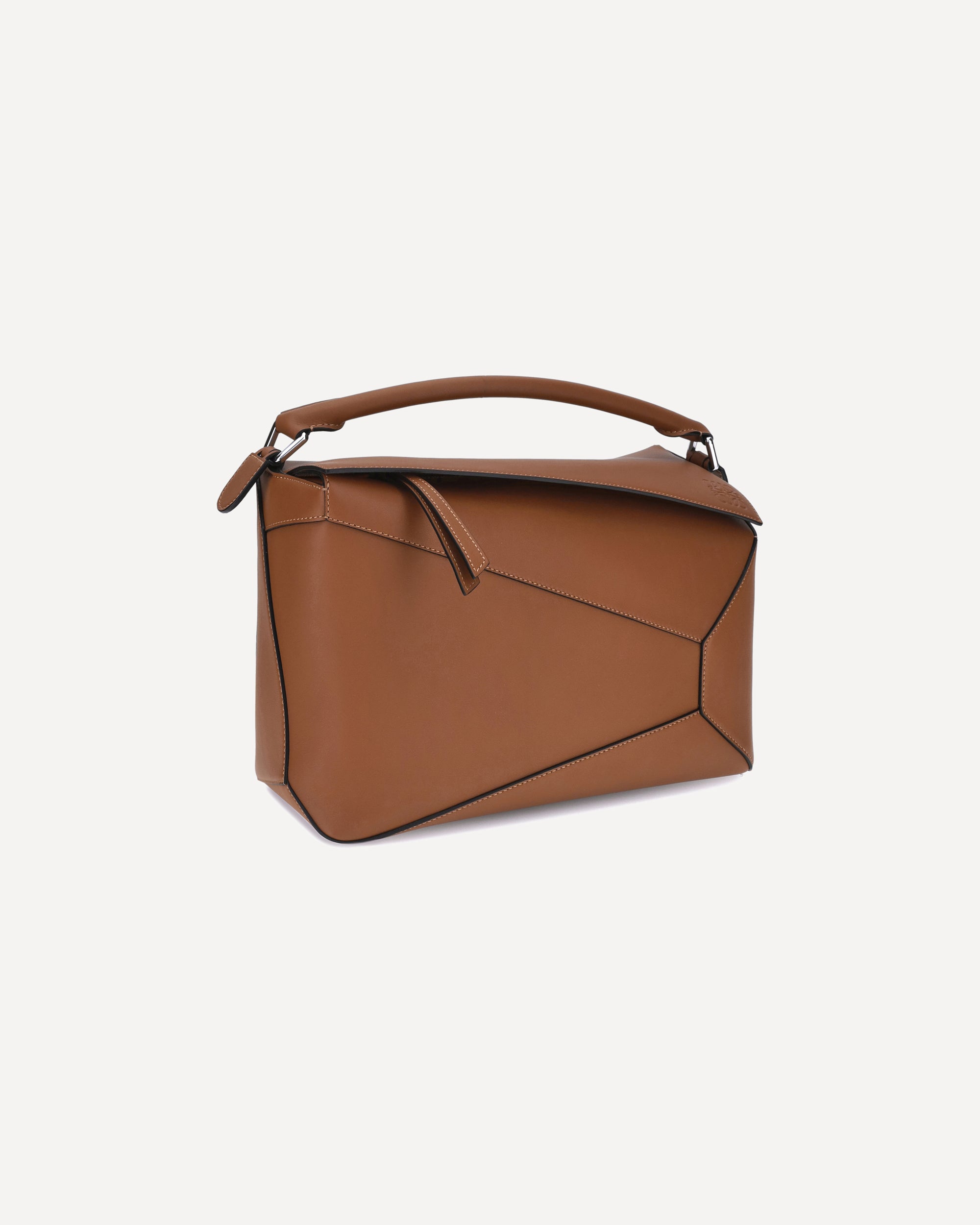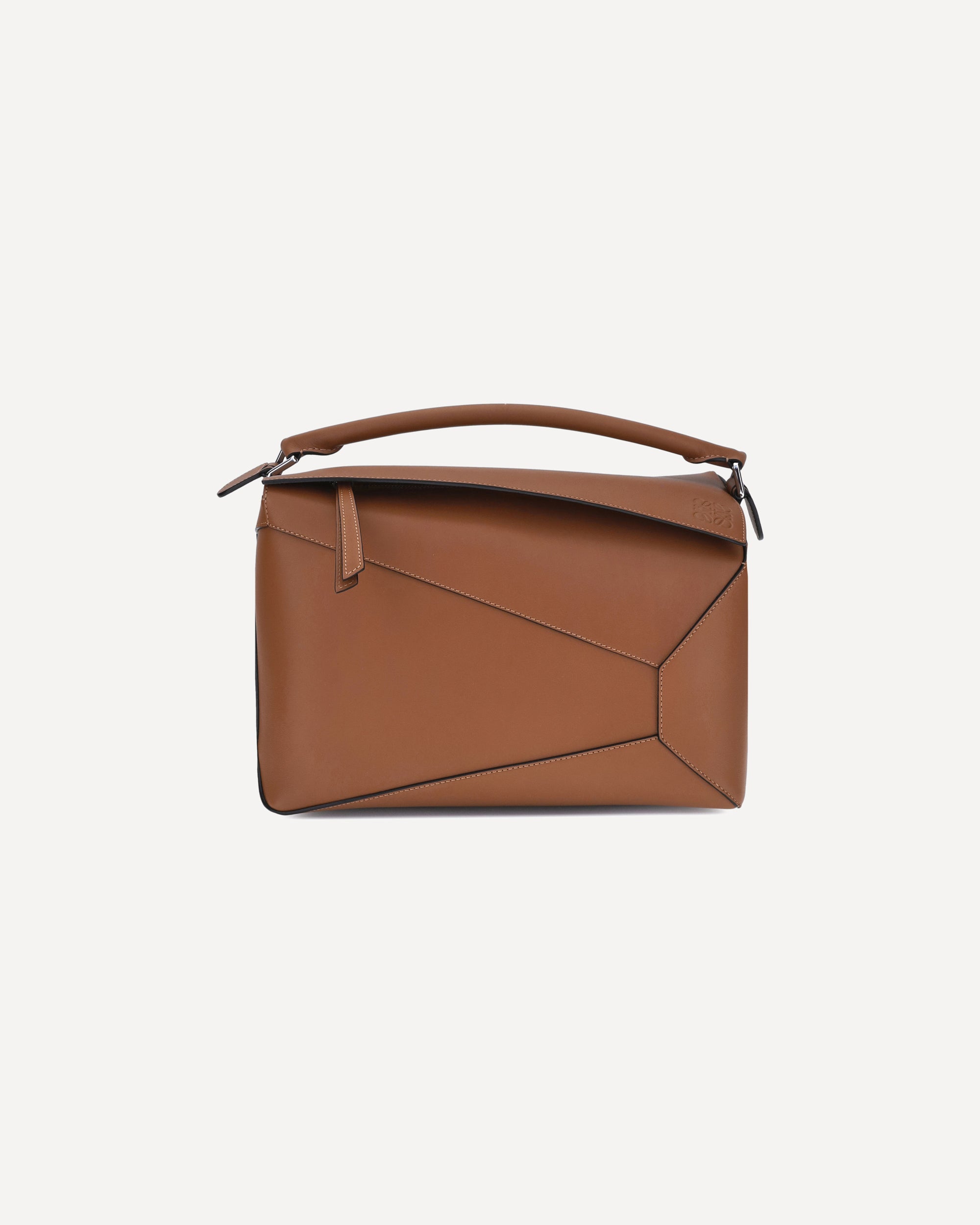 La Borsa a Mano Puzzle Edge Large in Pelle di Loewe è realizzata in pelle di alta qualità e si distingue per il suo design a pannelli geometrici, moderno e strutturato. Dotata di un manico superiore rigido e di una tracolla regolabile e removibile, può essere portata a mano o a spalla. La chiusura con zip è nascosta da una pattina per un look pulito. Il logo Loewe è stampato a pressione sul fronte, mentre una tasca con zip sul retro offre praticità aggiuntiva.