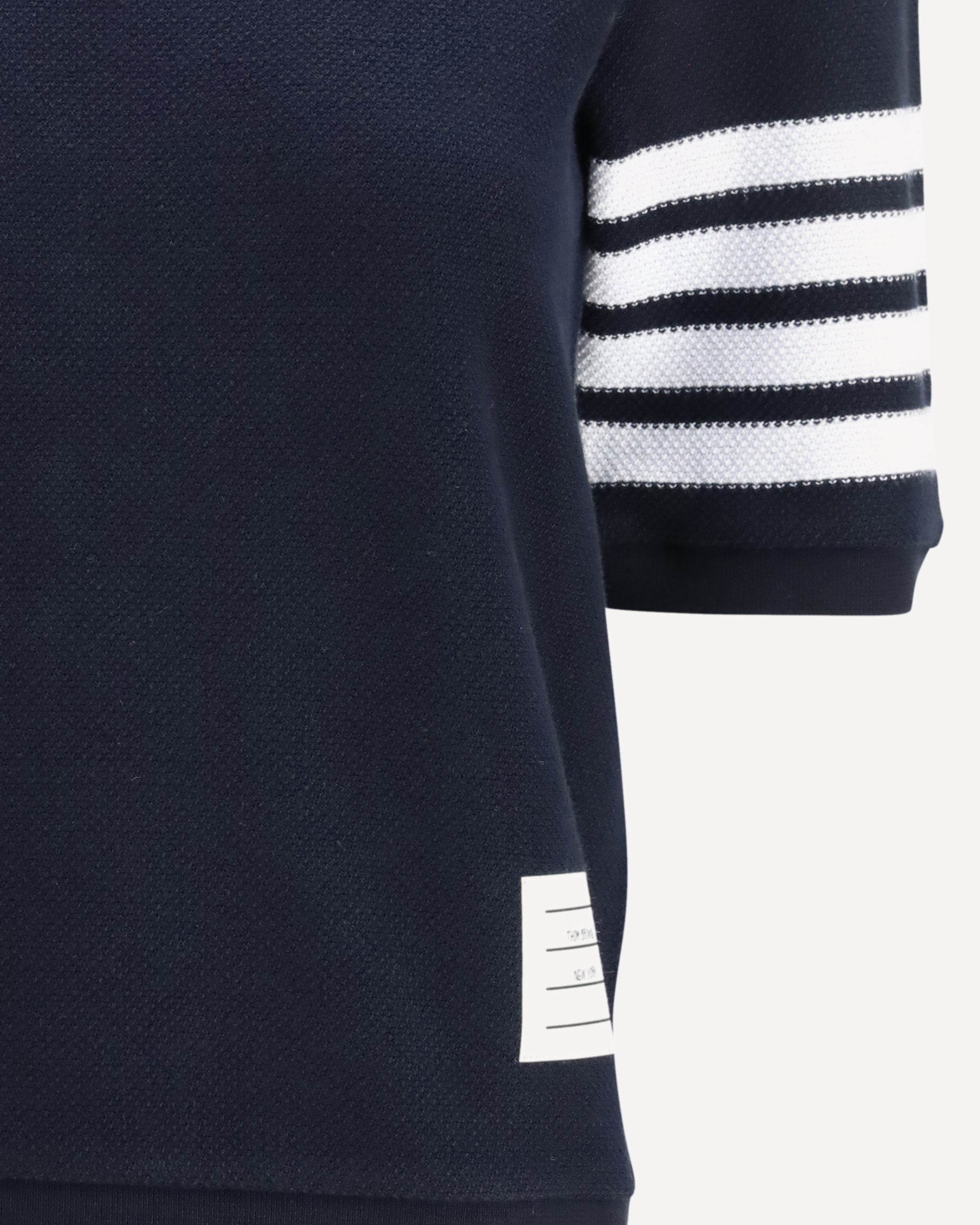 La T-shrit in cotone di Thom Browne interpreta l’essenzialità con la precisione iconica della maison. La linea girocollo e le maniche corte valorizzano la costruzione pulita, mentre le inconfondibili 4-Bar sul braccio sinistro introducono un dettaglio grafico immediatamente riconoscibile. Un modello che unisce comfort e stile, perfetto per definire il guardaroba quotidiano con l’eleganza rigorosa tipica di Thom Browne.