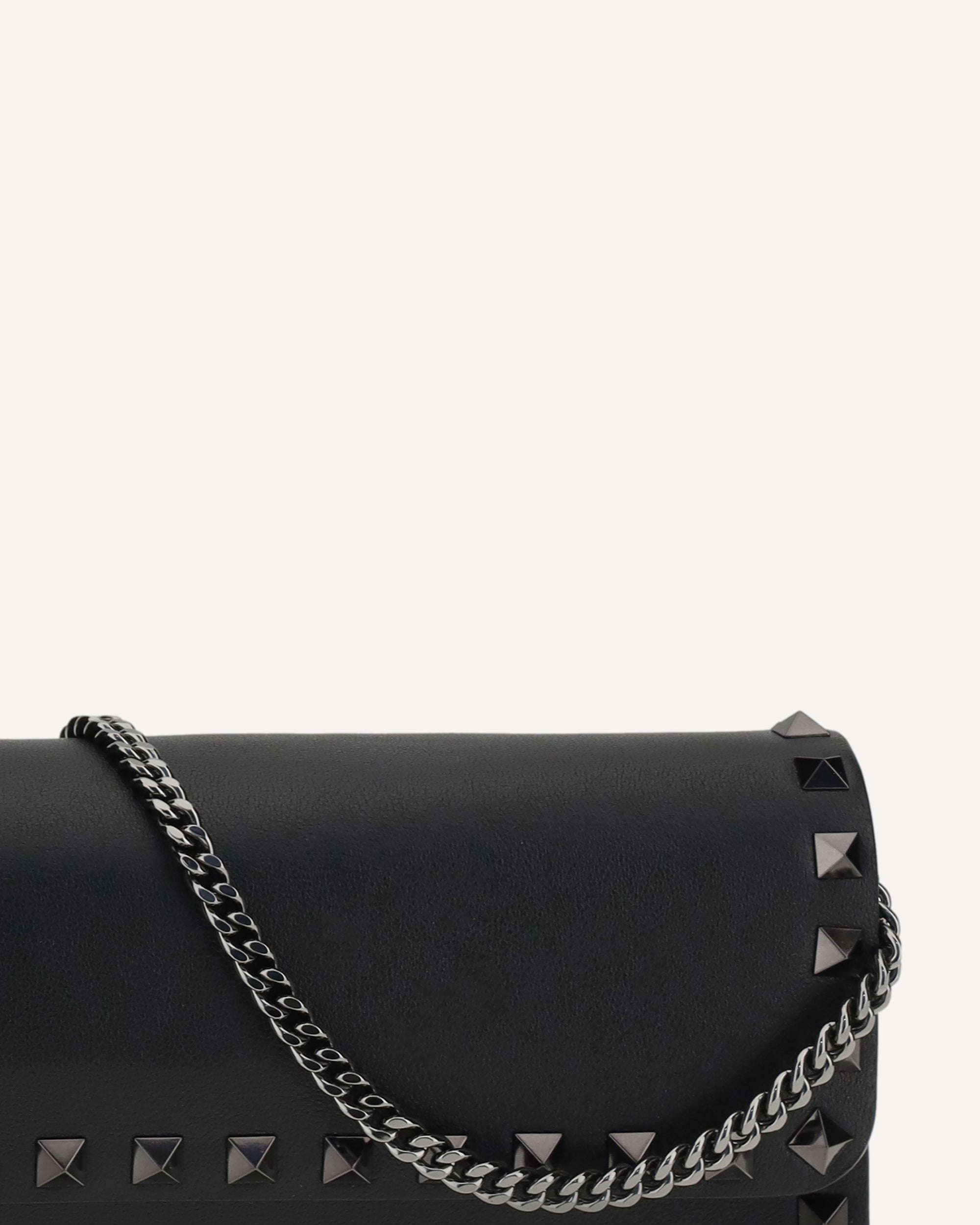 La Borsa a Tracolla in pelle di Valentino Garavani è un accessorio sofisticato e raffinato. Le bordature sono arricchite dalle iconiche borchie Rockstud, applicate sia sul fronte che sul retro, donando un tocco di carattere audace. La chiusura frontale è dotata di patta e un bottone magnetico, mentre sul retro spicca il monogramma del brand, stampato a contrasto per un effetto distintivo. La tracolla a catena aggiunge un ulteriore accento di eleganza, creando un equilibrio perfetto tra stile raffinato e un pizzico di audacia.