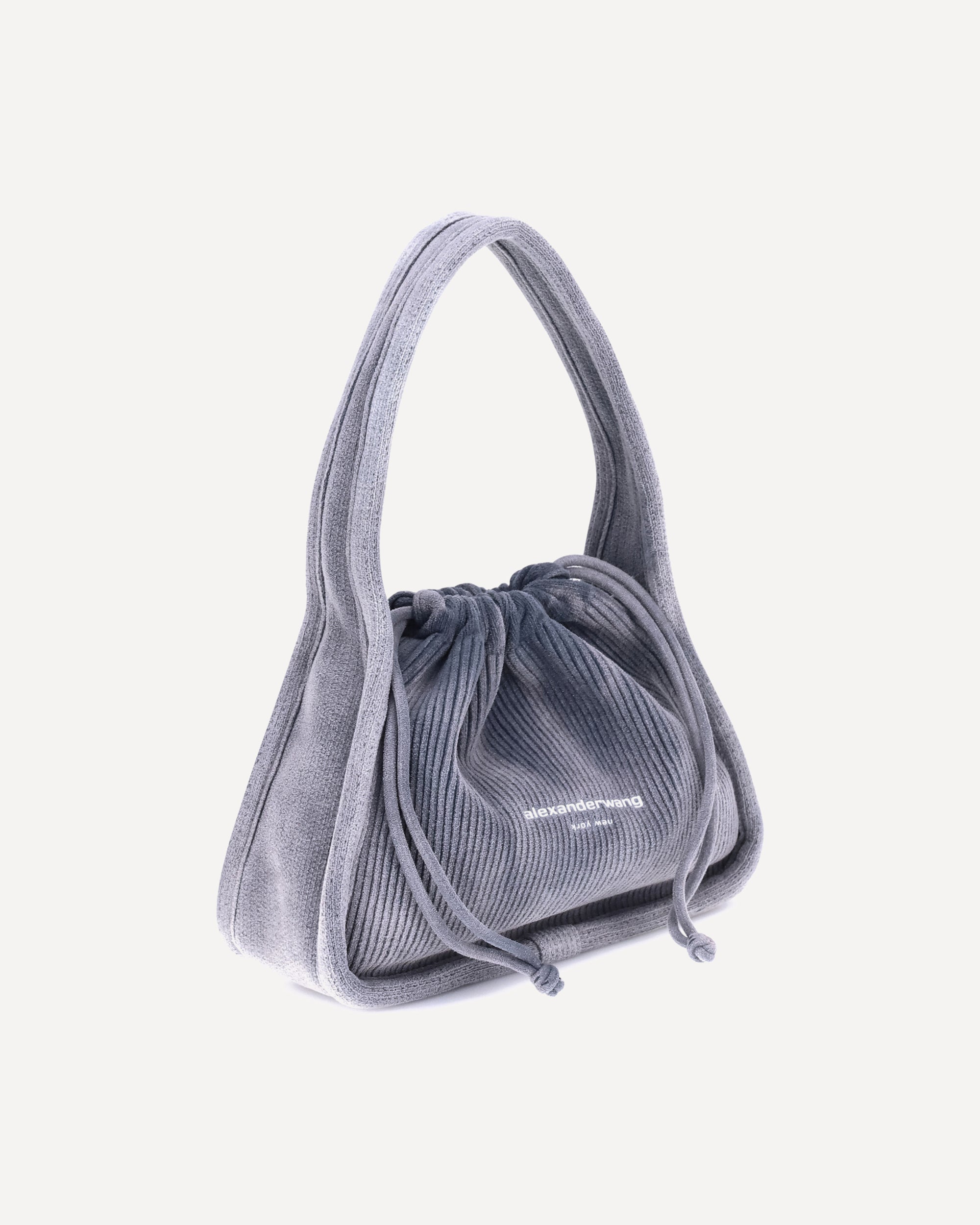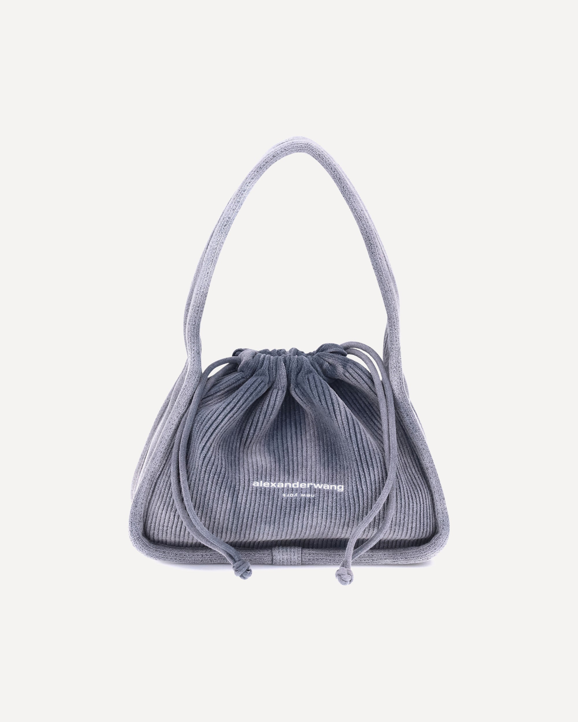 La Borsa a Mano Ryan small di Alexander Wang è un accessorio dallo stile urbano e contemporaneo. Caratterizzata da un design in tessuto a costine, presenta un manico piatto nella parte superiore e una chiusura con coulisse arricchita da nastri, che aggiungono un tocco casual e moderno. L'iconico monogramma del brand stampato sul fronte completa il look con un segno distintivo. Compatta ma capiente, è la scelta ideale per chi cerca funzionalità senza rinunciare al carattere.