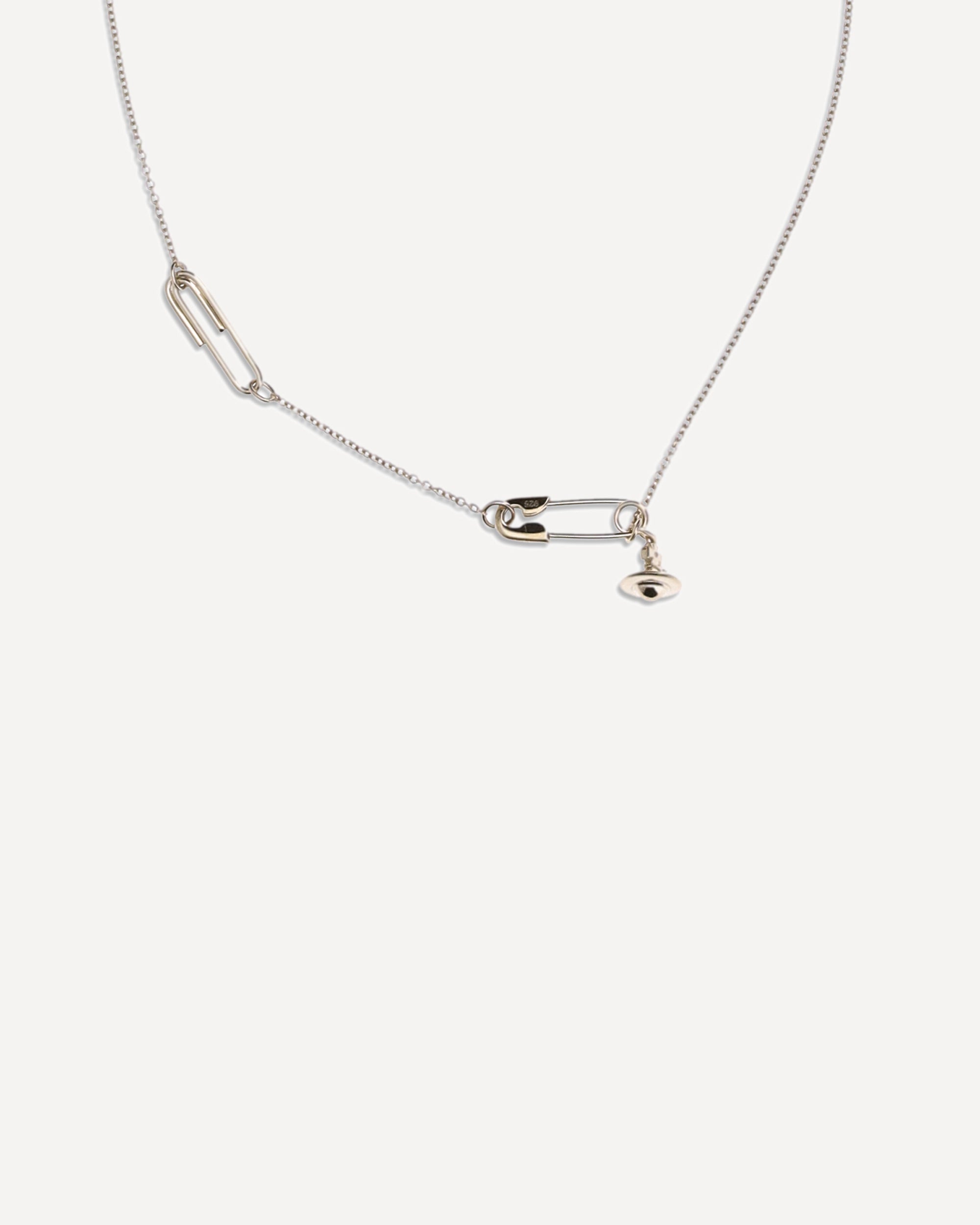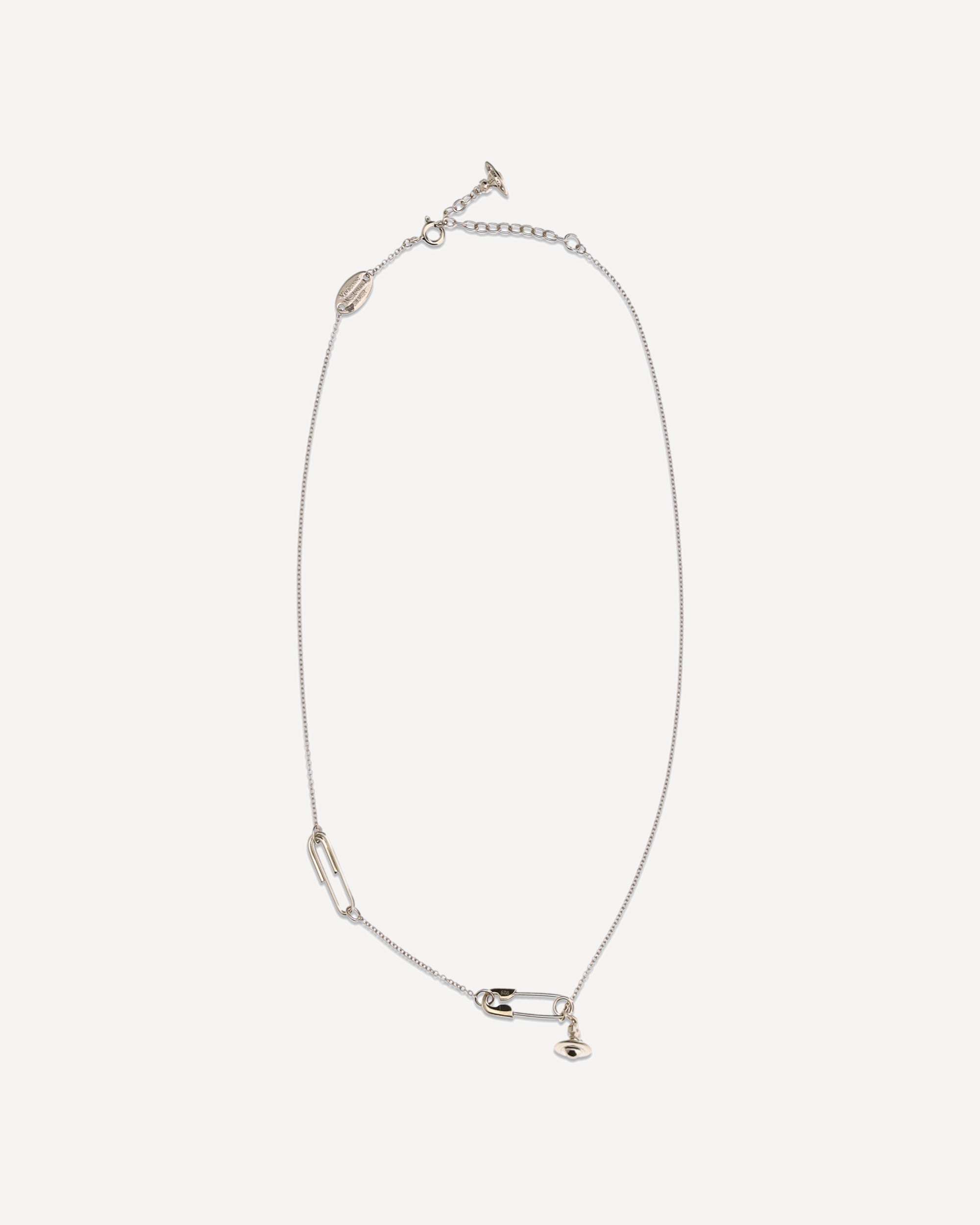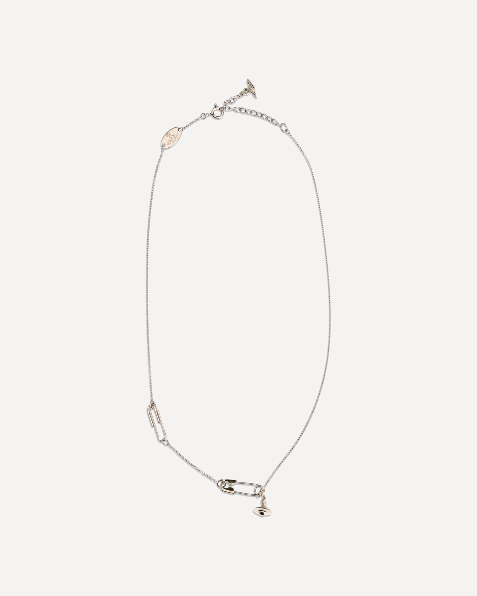 La Collana di Vivienne Westwood è un gioiello dal forte impatto visivo, che fonde lo spirito punk con l’eleganza contemporanea. I dettagli con spille da balia richiamano l’estetica ribelle tipica della maison, mentre l’iconico pendente Orbit aggiunge un tocco inconfondibile, simbolo della visione anticonvenzionale del brand. La chiusura regolabile con gancetto assicura una vestibilità pratica e personalizzabile, rendendo questa collana un accessorio versatile, perfetto per chi desidera esprimere personalità e stile attraverso ogni dettaglio.