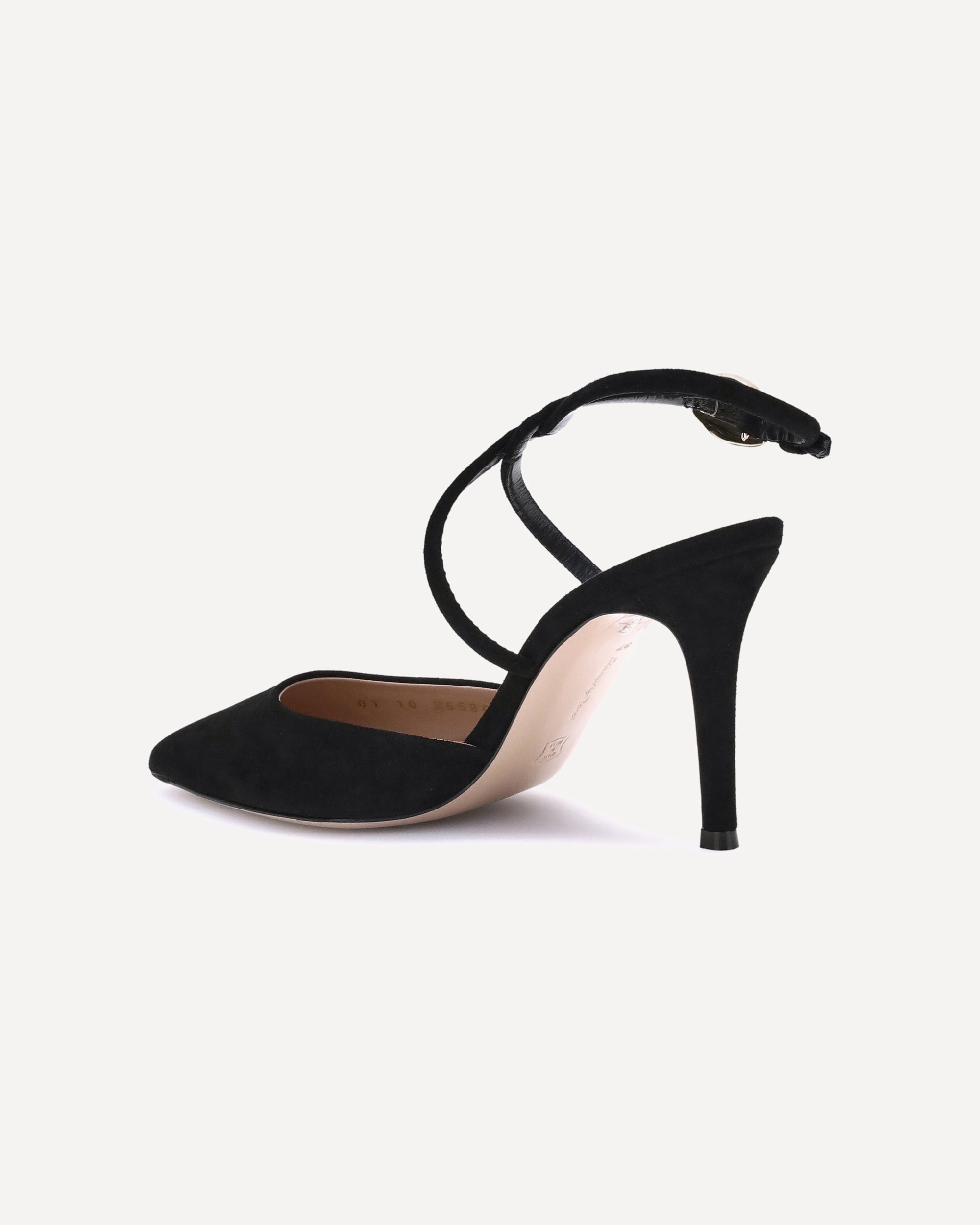 Décolleté in pelle scamosciata in pelle scamosciata con punta allungata e cinturino intrecciato sul fronte, regolabile con fibbia alla caviglia impreziosita da un dettaglio 3D dorato. Il tacco a stiletto in cuoio dona eleganza e slancio, mentre la soletta logata completa il design con un tocco di raffinatezza.