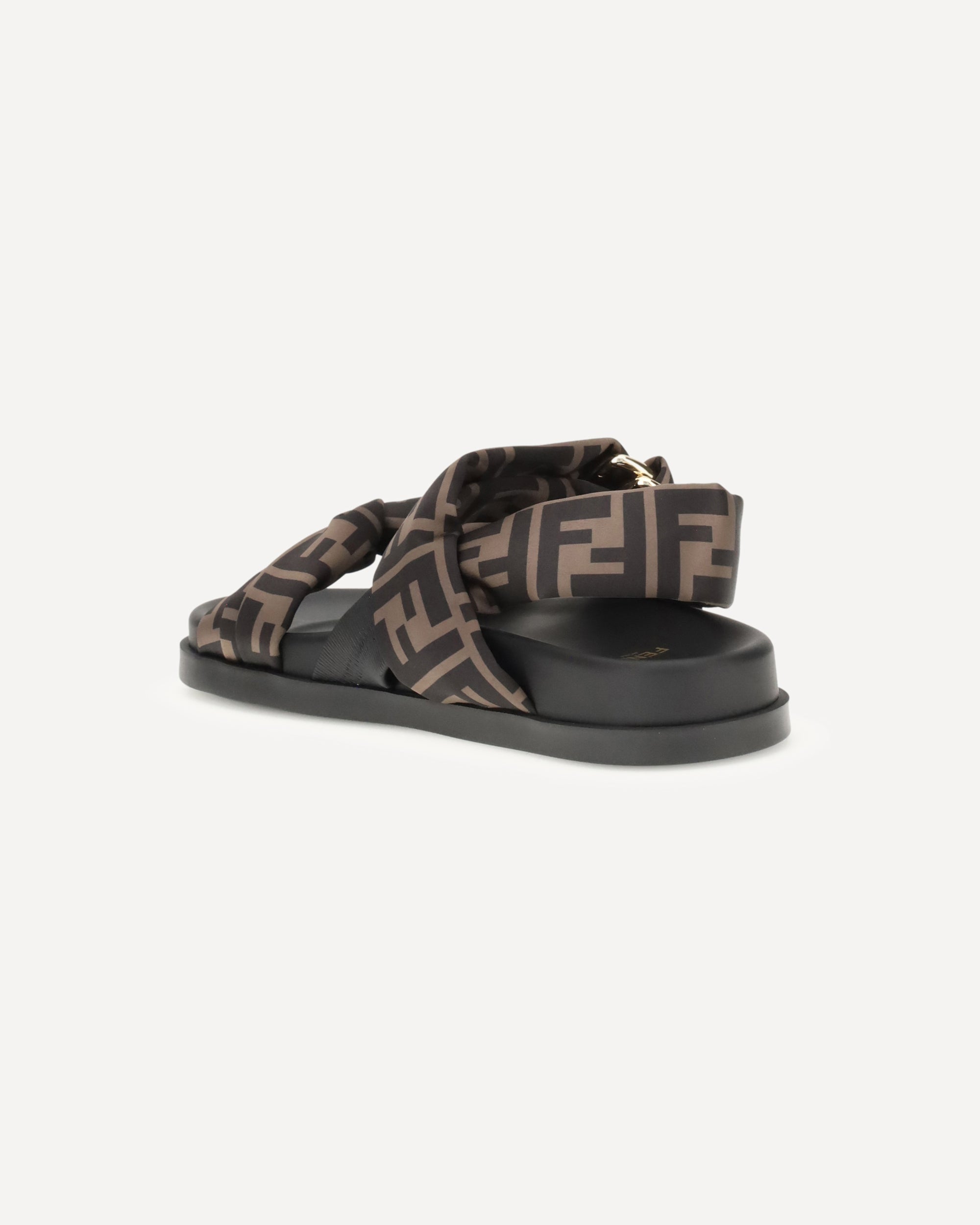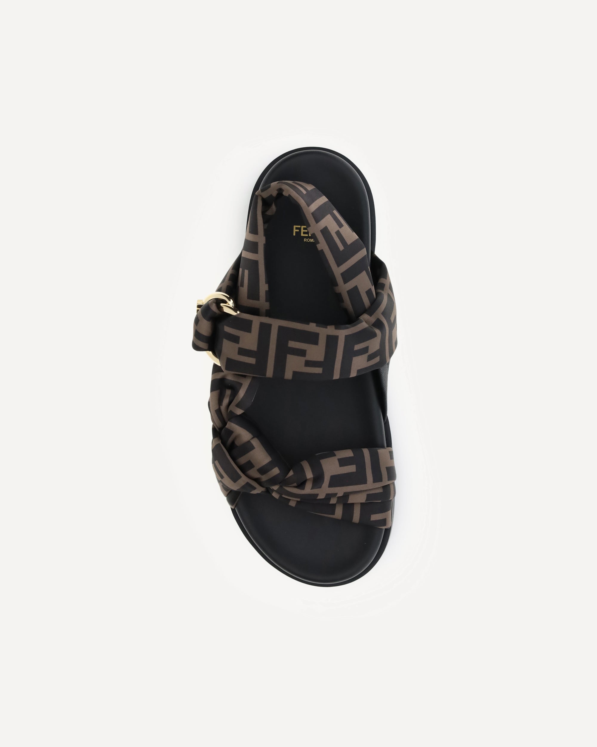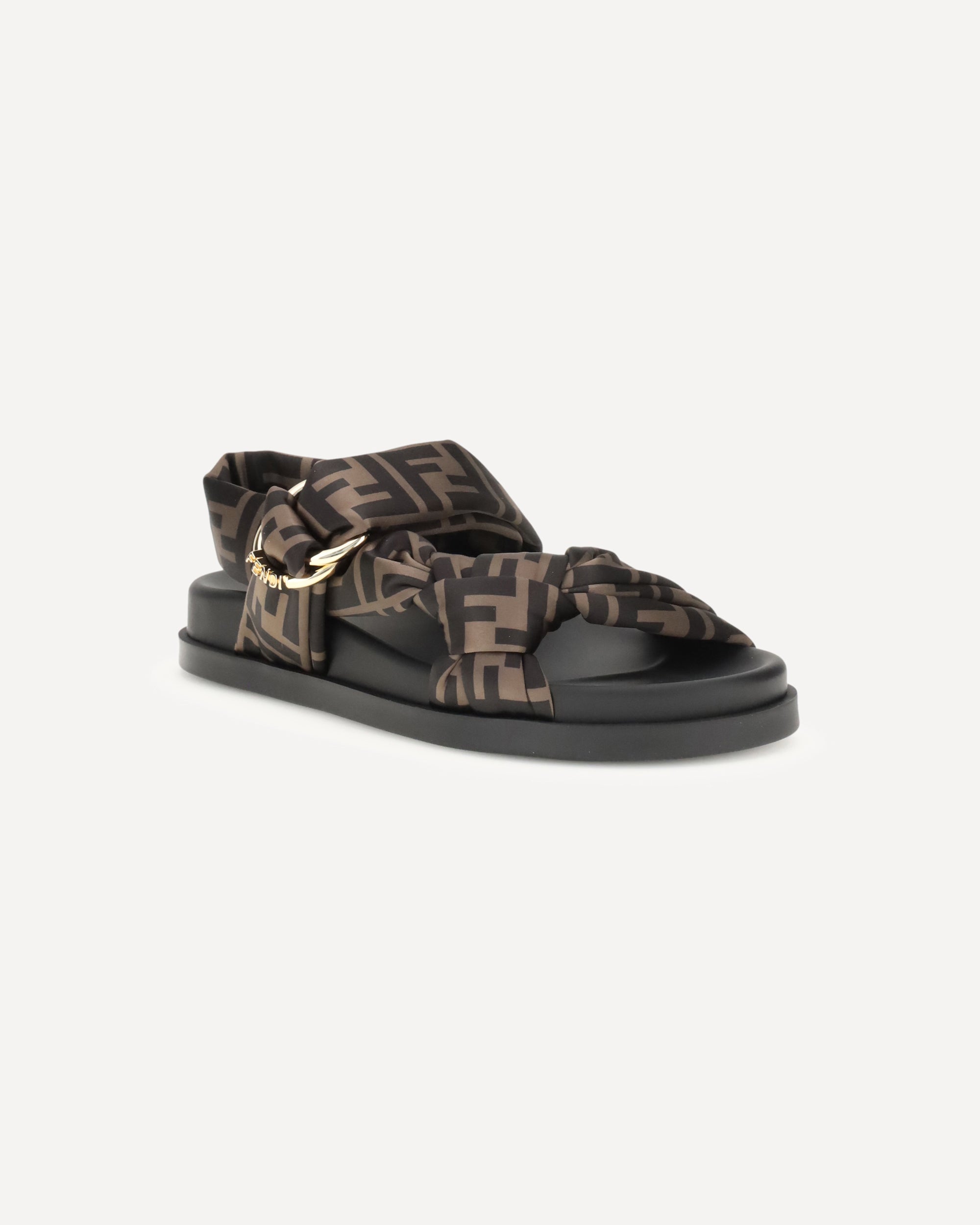 I Sandali in raso FF di Fendi coniugano stile audace e dettagli iconici. Il design si distingue per le fasce imbottite e la fibbia decorativa a D-ring con lettering Fendi tridimensionale, che dona carattere e riconoscibilità al modello. Realizzati in raso con l’inconfondibile motivo FF, sono completati da una soletta in pelle nera e suola in gomma per un comfort quotidiano. Gli accessori metallici con finitura dorata aggiungono un tocco di luce e raffinatezza.