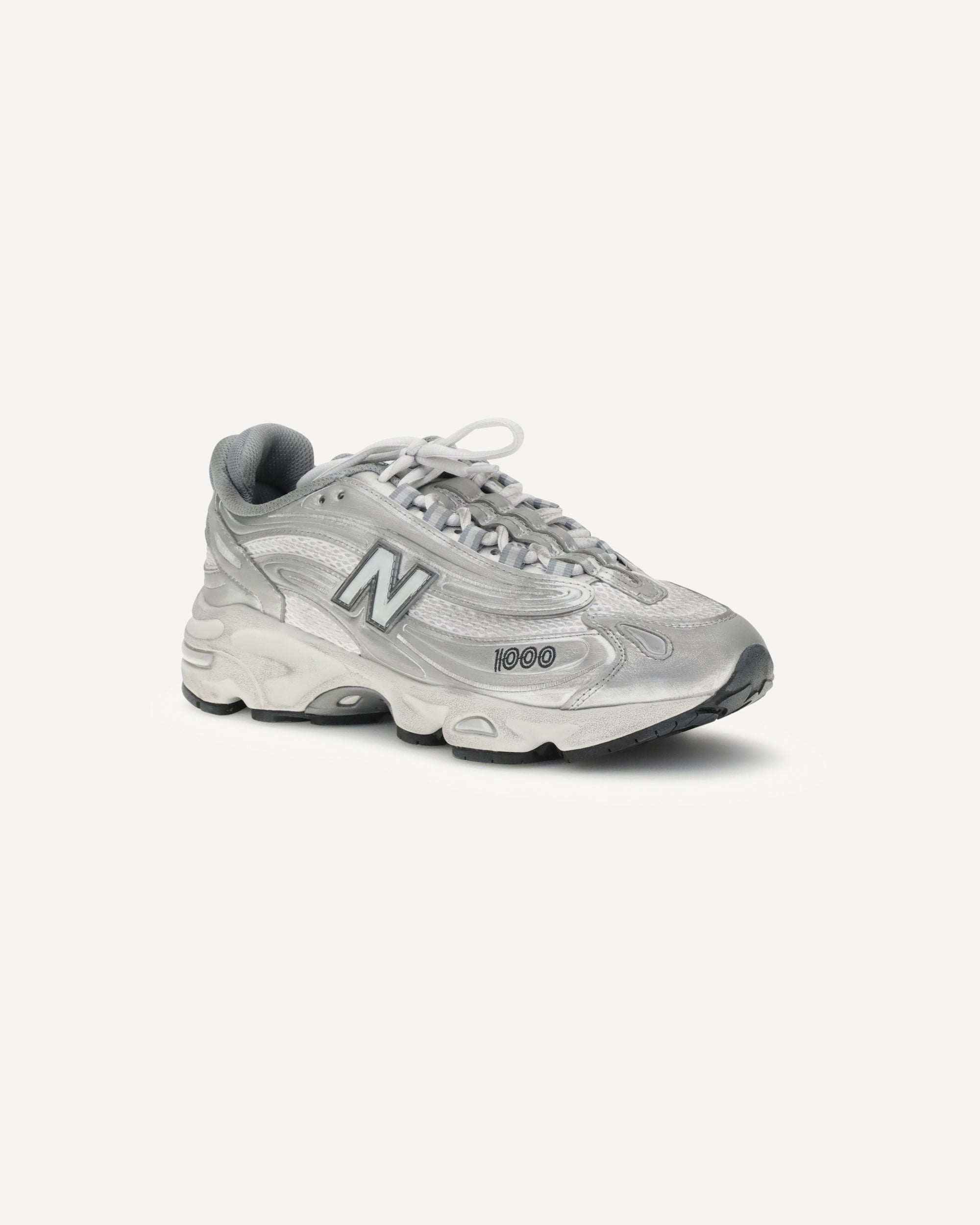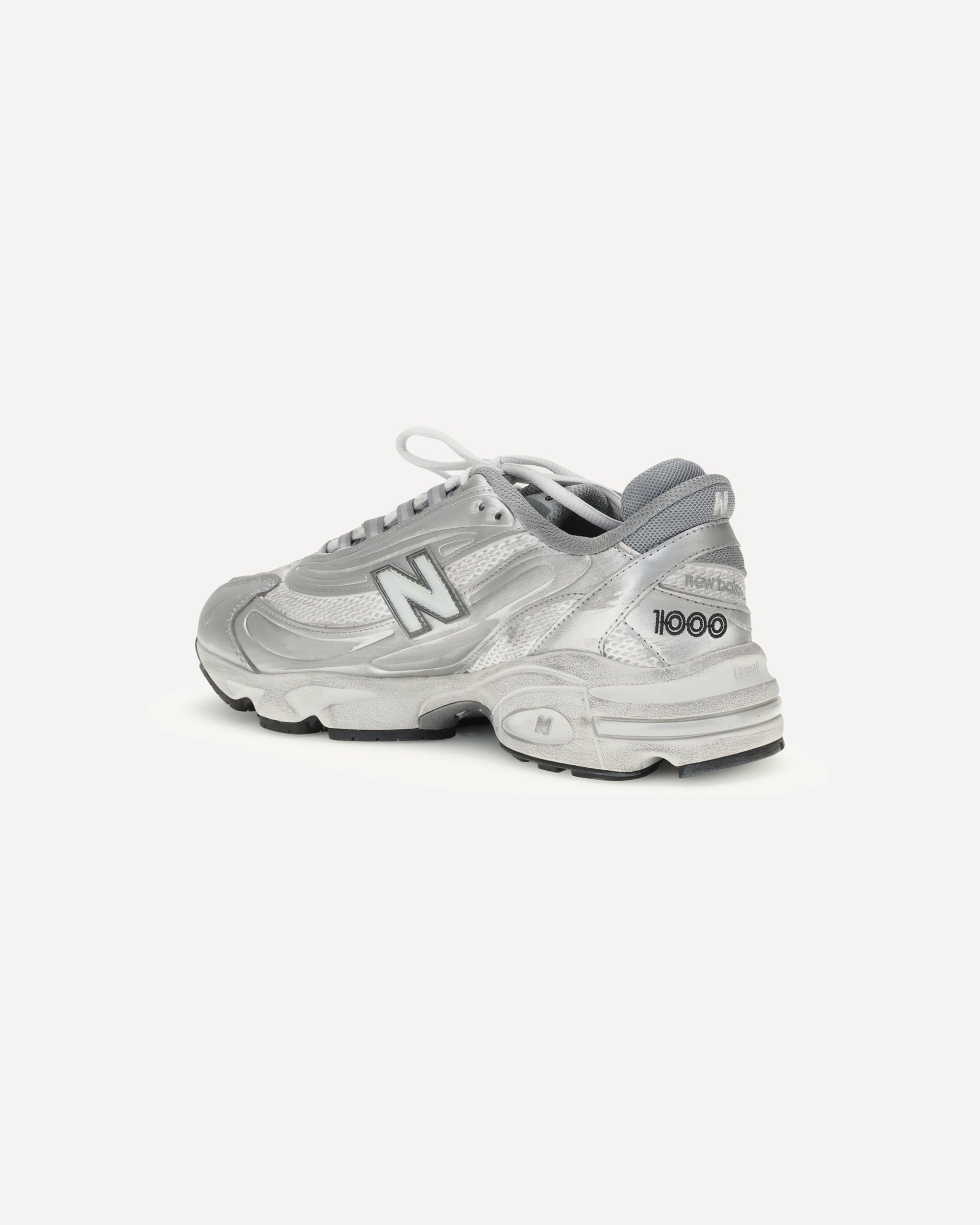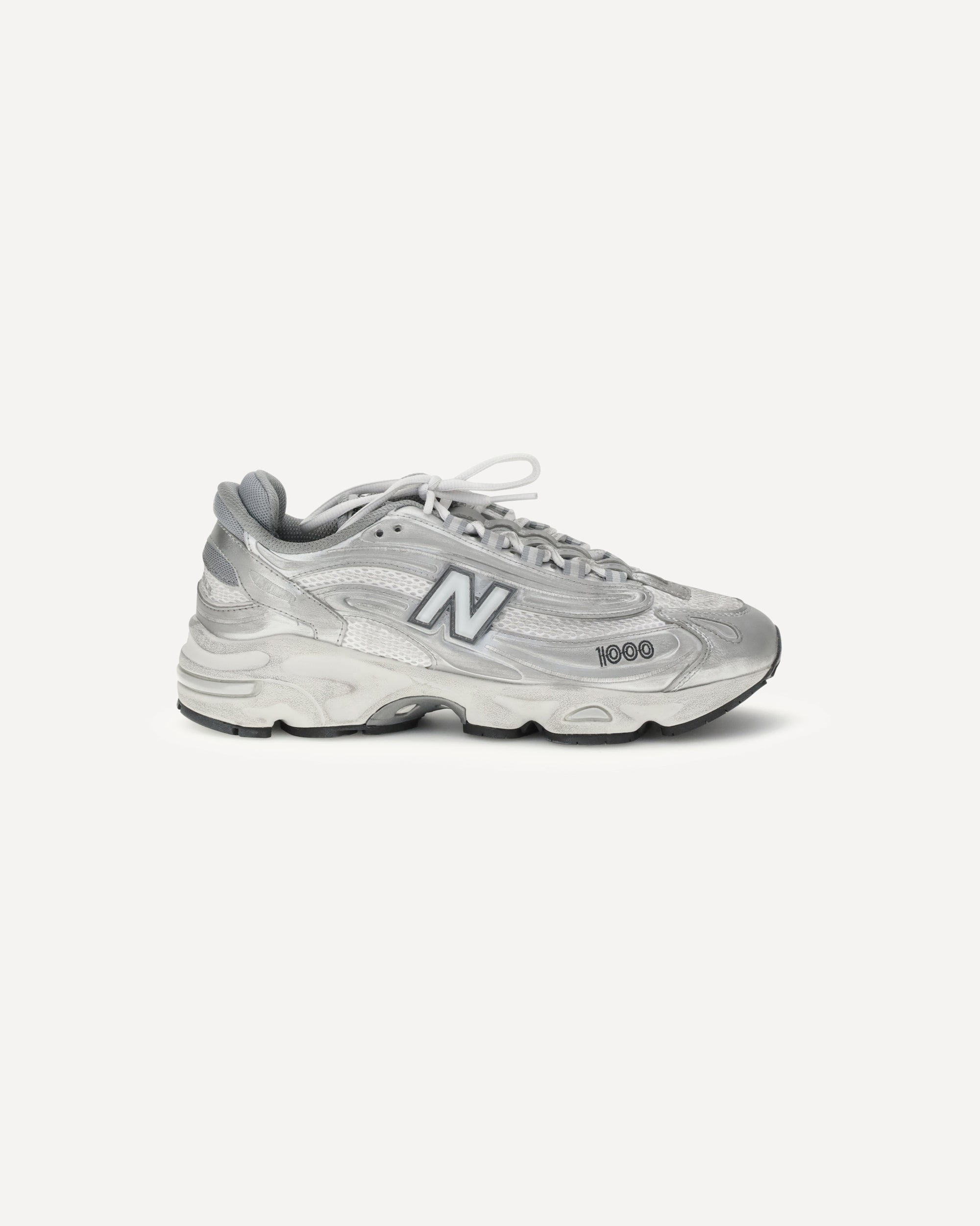 Sneakers 1000 di New Balance, il design standard della tomaia in mesh e dei rivestimenti in suede è invertito, con strati in mesh che emergono dai pannelli di rivestimento più sporgenti, per un look raffinato e ispirato alla tecnologia. La suola segmentata presenta un'ammortizzazione ABZORB nel tallone e nell'avampiede, con un supporto Stability Web nella parte centrale del piede, logo "N" gommato con profilo trasparente, struttura di allacciatura esterna con occhielli in nylon.