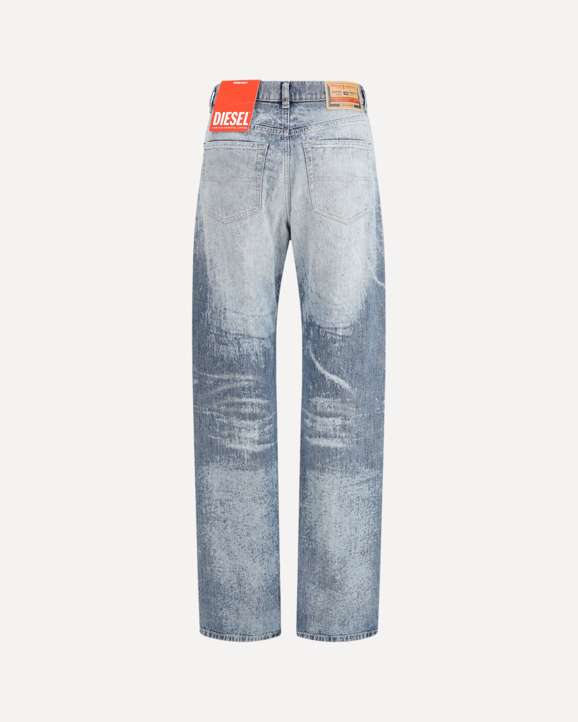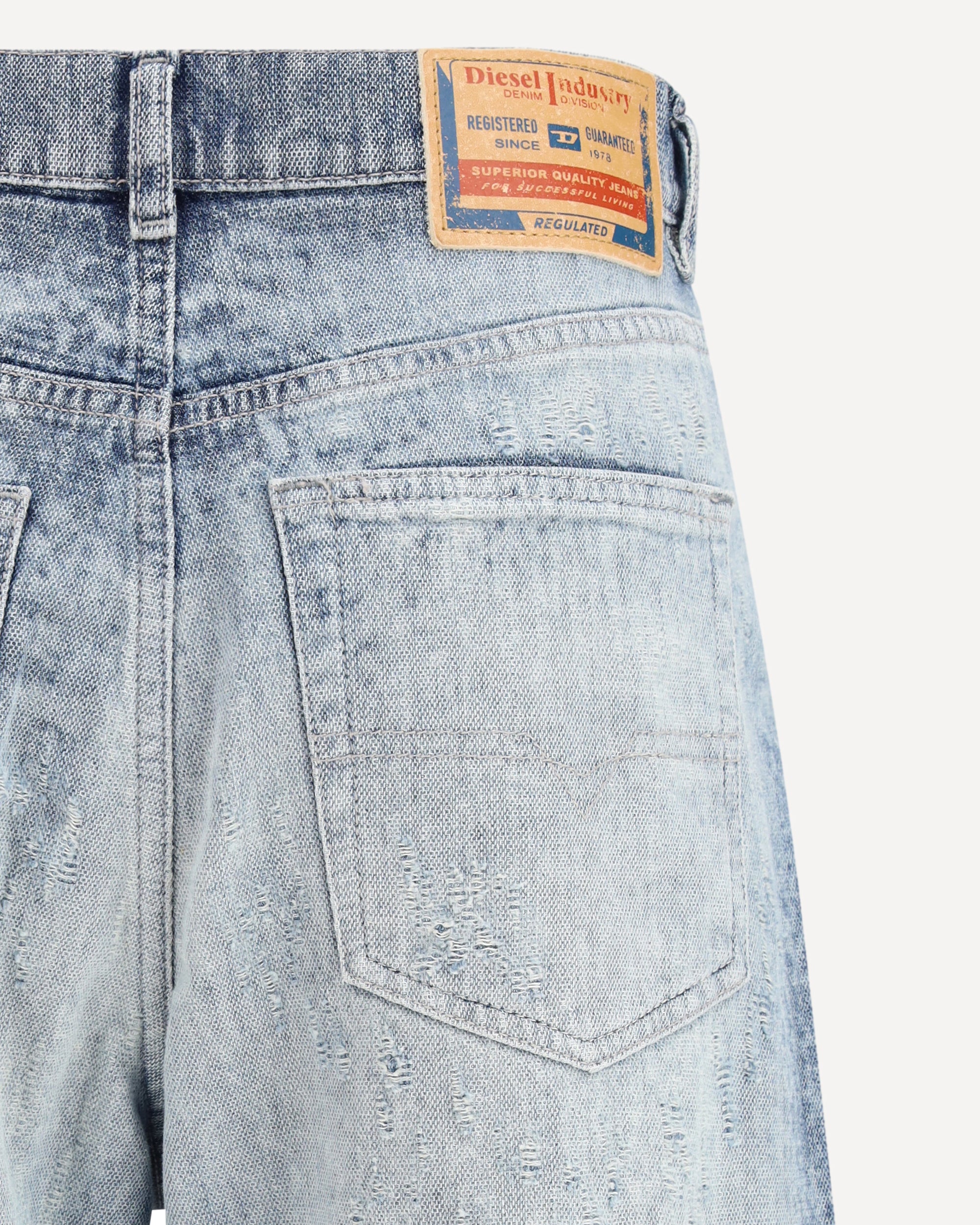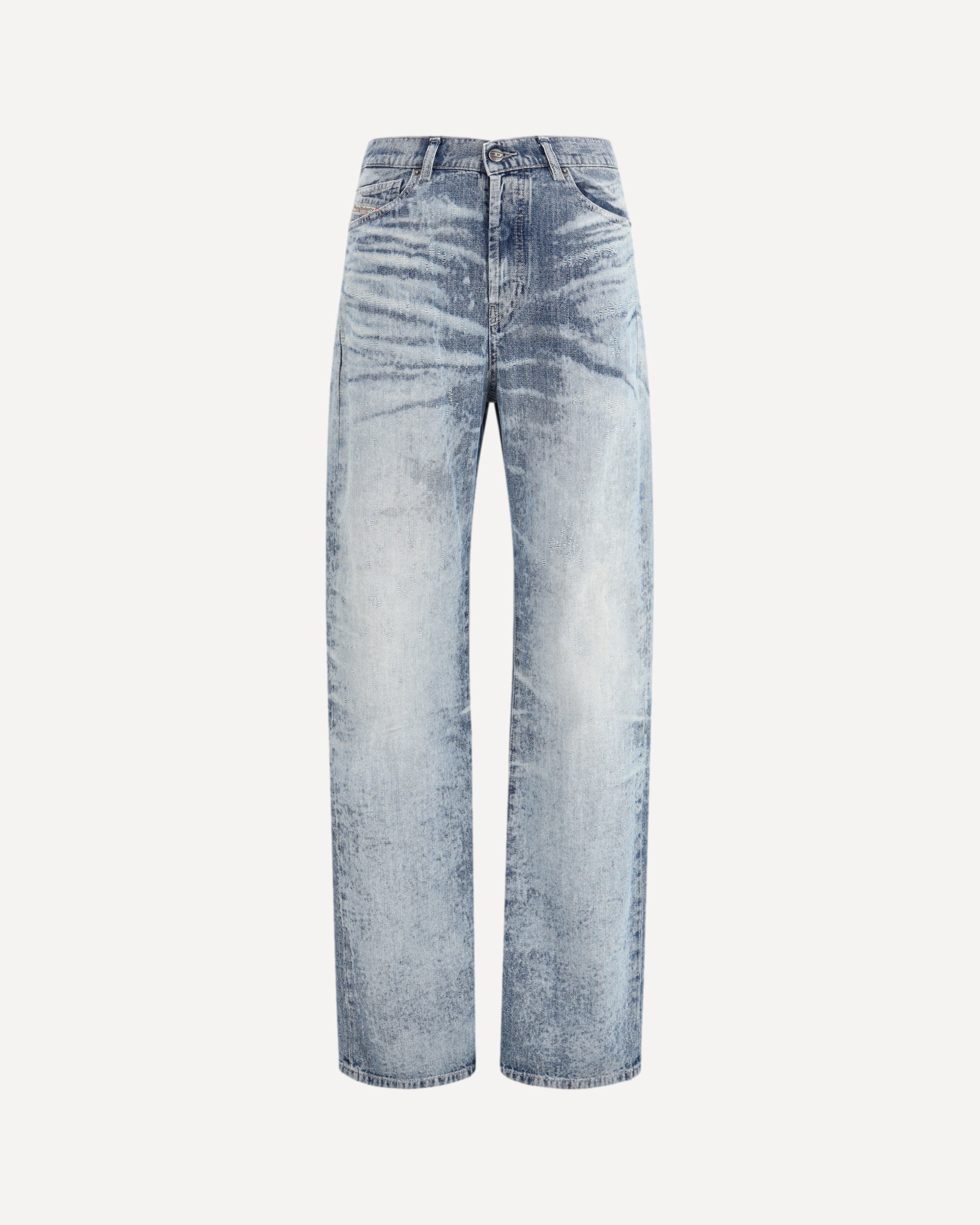I Jeans regular 1971 D-Sent di Diesel presentano una vestibilità regolare con gamba dritta e vita alta, caratterizzata da una costruzione a V sul davanti che valorizza la silhouette femminile mantenendo un comfort naturale. Realizzati in denim 100% cotone blu chiaro, si ispirano ai tessuti giapponesi a nido d’ape. La lavorazione jacquard è arricchita da trattamenti stonewash, effetti bleach nebulizzati e tecnologia laser, mentre fili fluttuanti e leggere abrasioni completano la finitura distressed tipica del lavaggio da sfilata. Chiusura con bottoni.