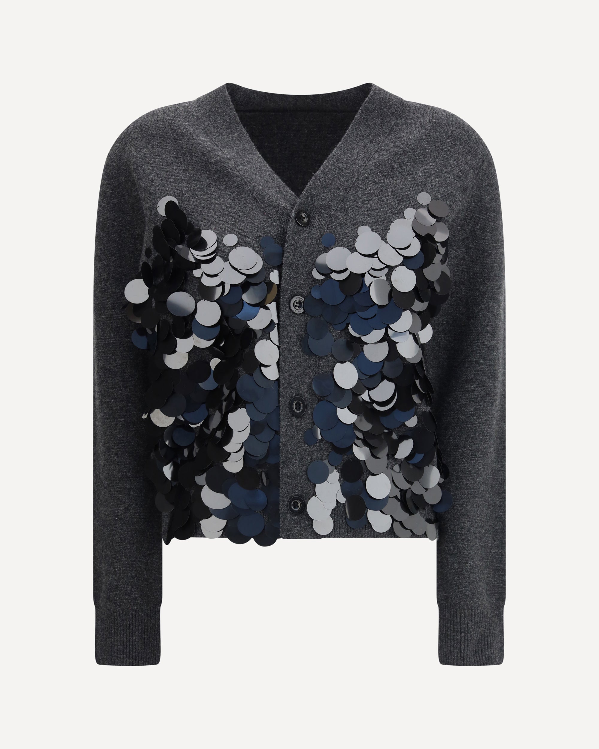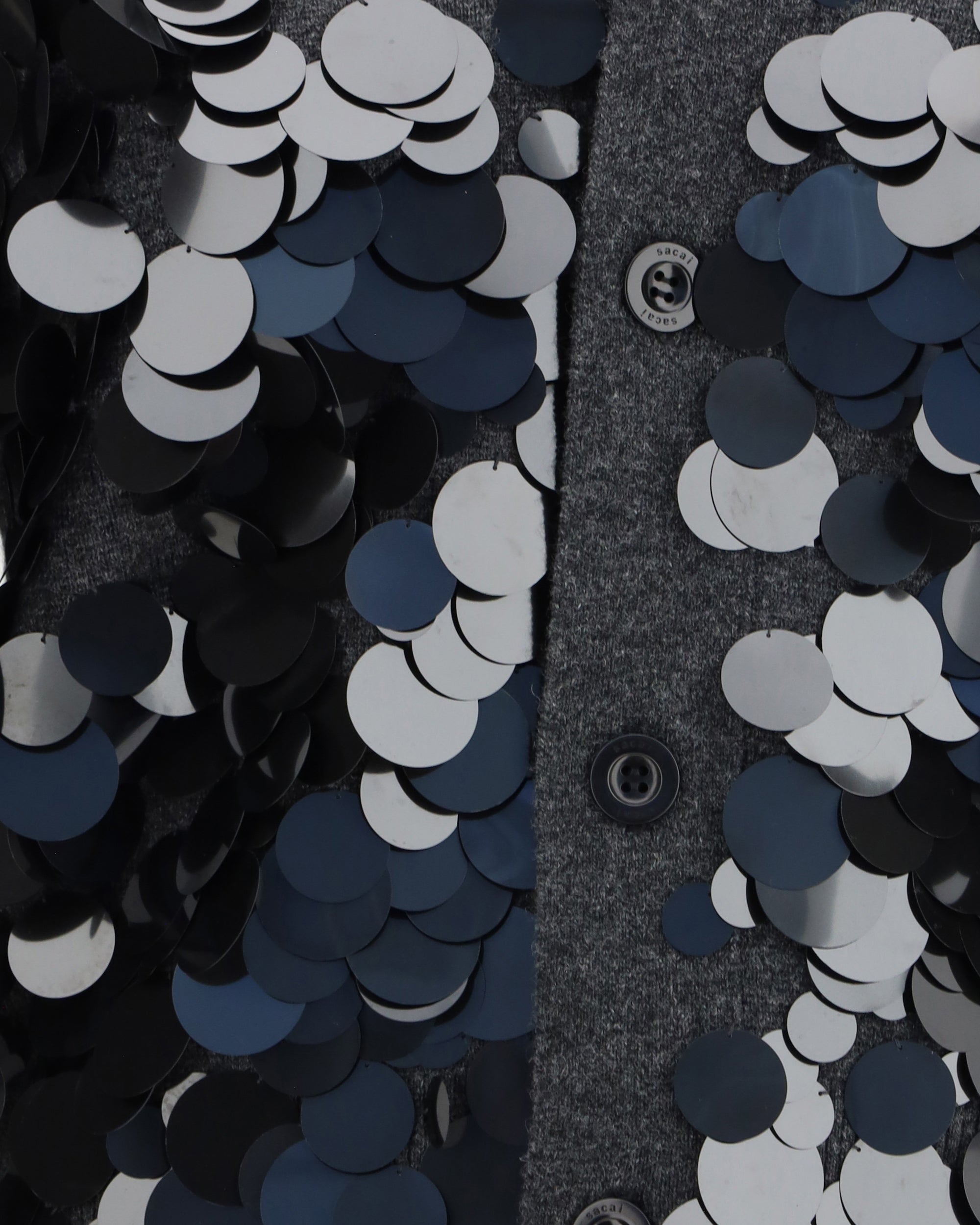 Il Cardigan in Lana con Paillettes di Sacai unisce la tradizione della maglieria alla brillantezza contemporanea. Il modello, lavorato in pura lana, si distingue per il davanti ricoperto da maxi paillettes che catturano la luce a ogni movimento. Lo scollo a V e la chiusura con bottoni mantengono l’anima classica del cardigan, mentre i bordi a coste aggiungono struttura e definizione.