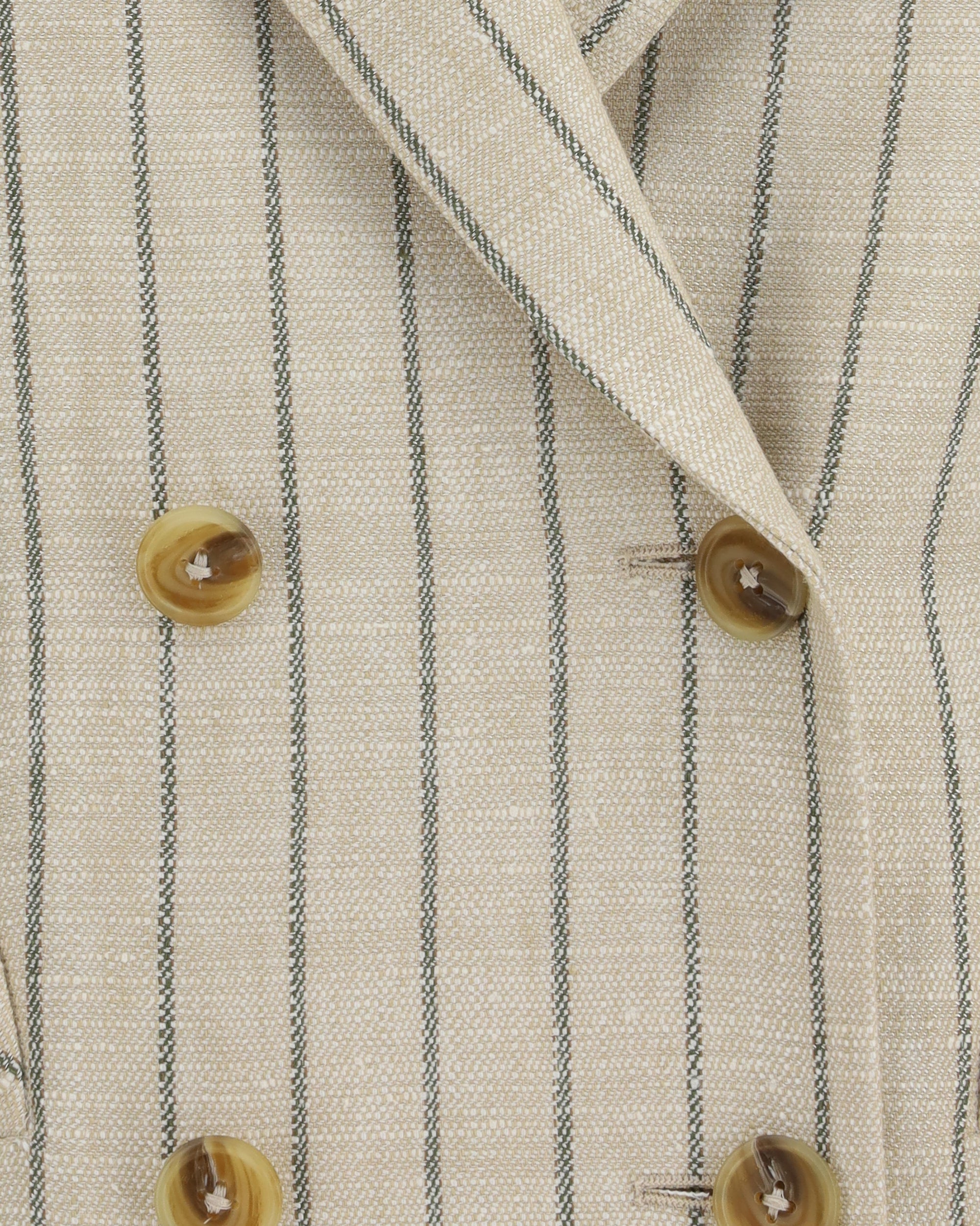 Il blazer Serene Tea gessato doppiopetto di Blazè Milano è realizzato in un fresco blend di lino, viscosa, cotone e seta, ideale per la stagione primavera estate. Le spalle leggermente imbottite e i revers a lancia definiscono una silhouette elegante e strutturata. Iconiche tasche arrotondate, spacco sul retro e bottoni tartarugati logati con controbottone in madreperla completano il capo con dettagli sartoriali distintivi.