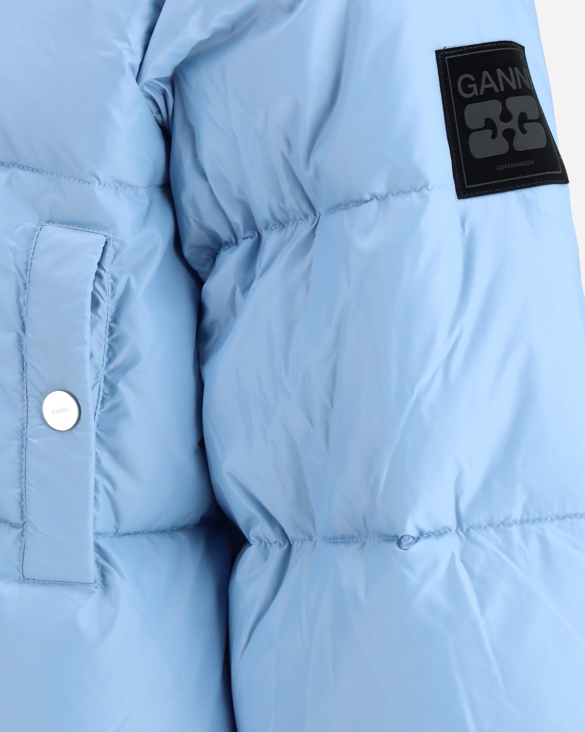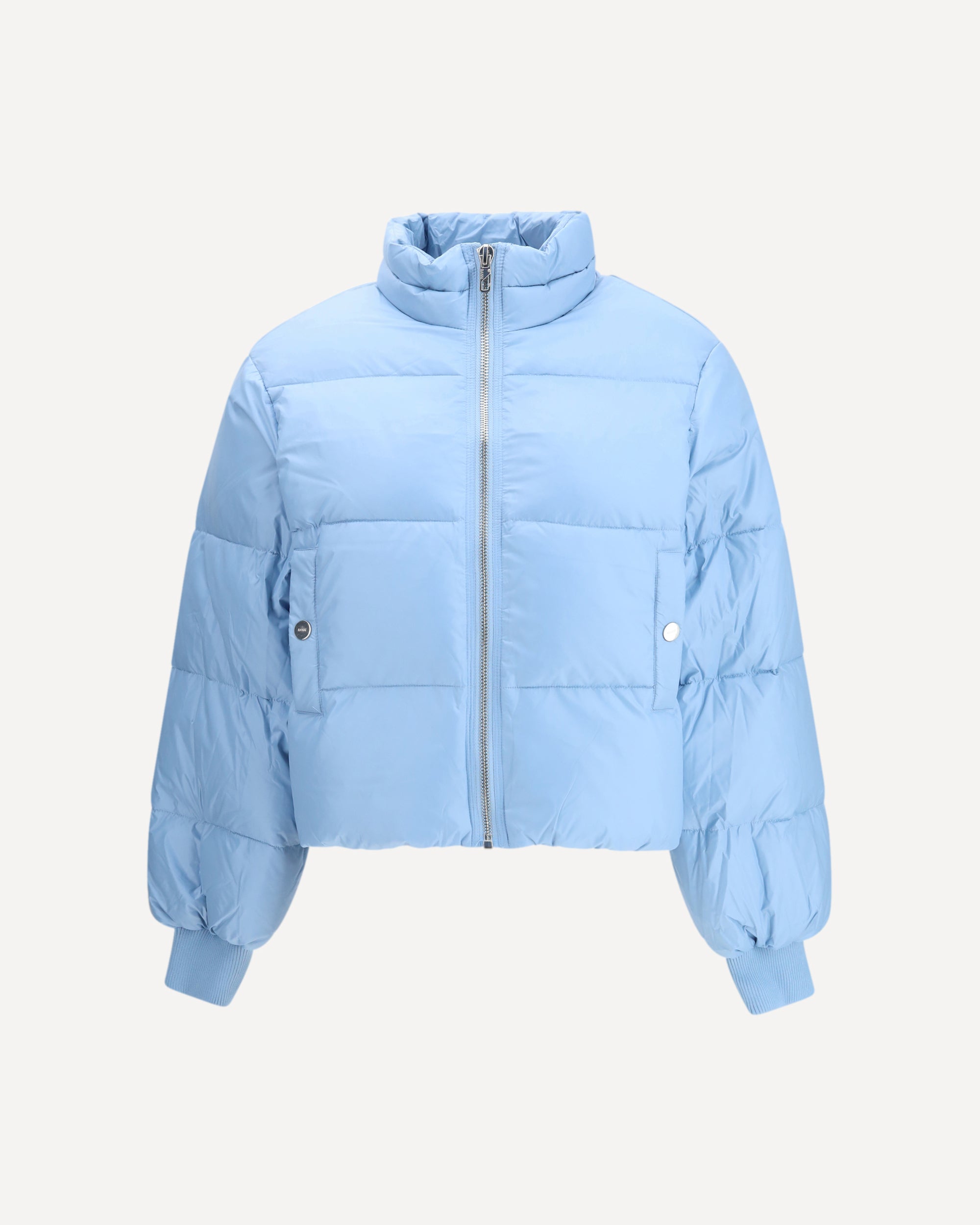 Il Piumino corto di Ganni in nylon lucido interpreta l’energia moderna del brand attraverso una silhouette compatta e funzionale. Il collo alto e la chiusura frontale con zip garantiscono protezione e pulizia estetica, mentre i polsini a coste definiscono una linea raccolta. Le tasche frontali aggiungono praticità quotidiana, completando un Piumino che esprime il carattere urbano e brillante dI Ganni.