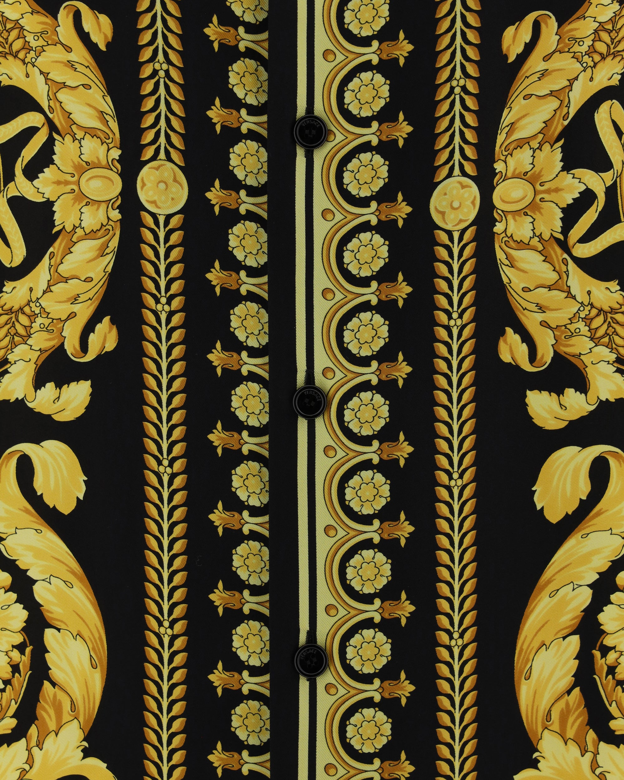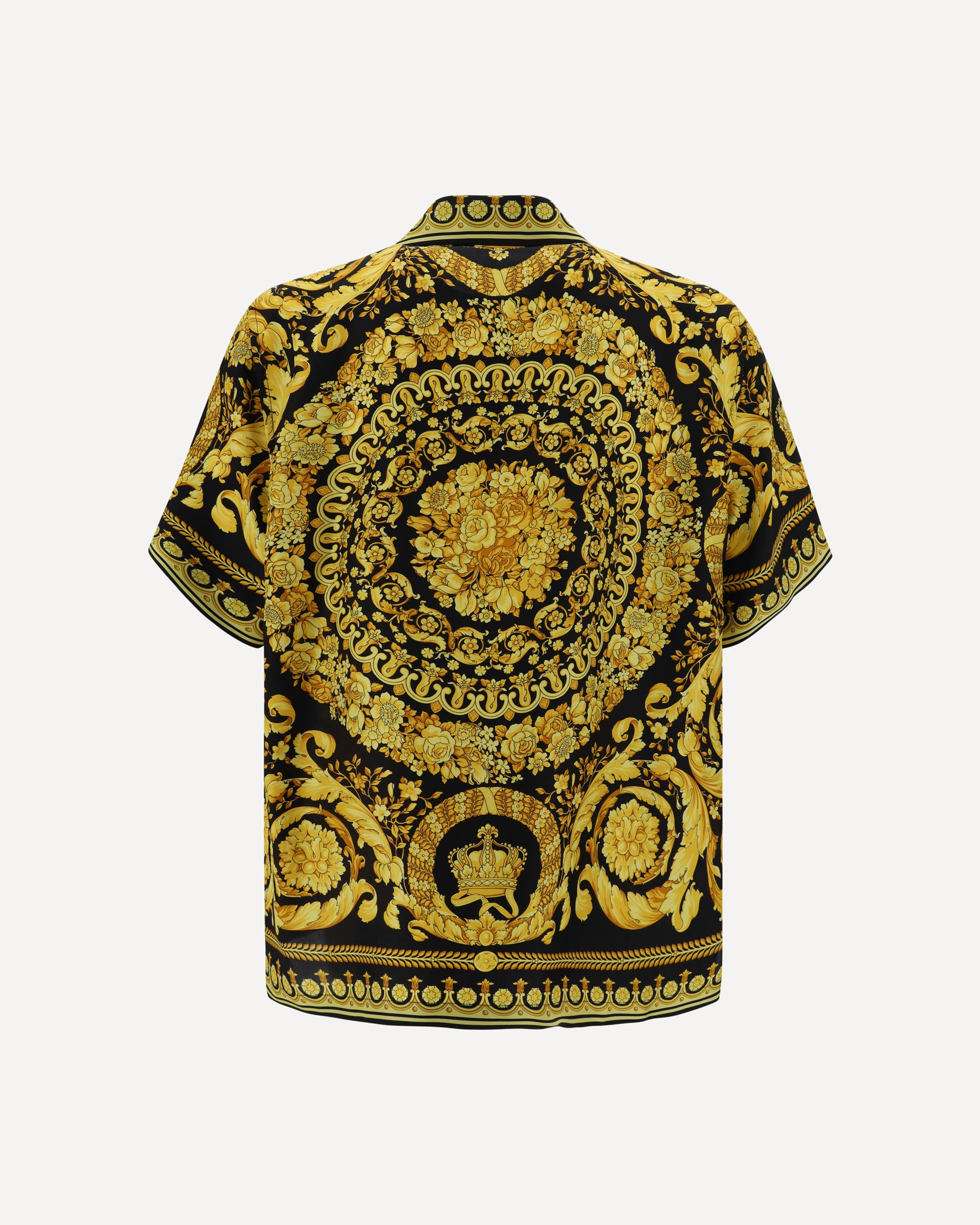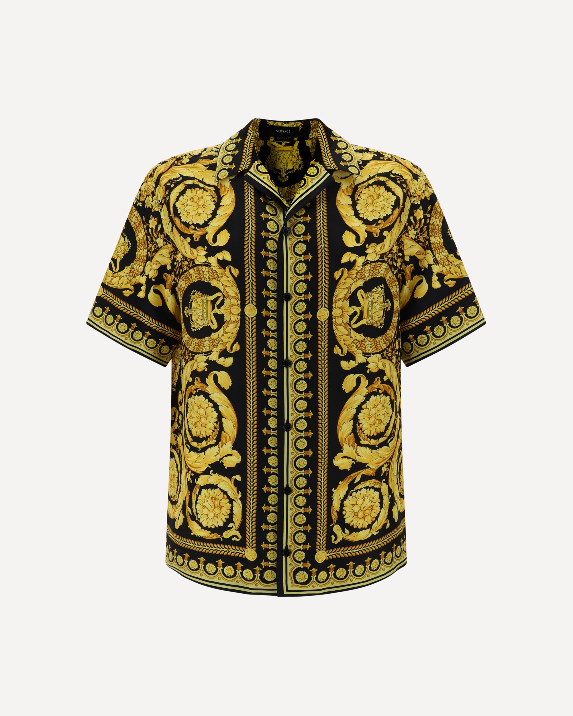 Camicia in Seta di Versace, colletto classico, chiusura frontale con bottoni, modello a maniche corte, iconica stampa Barocco all-over, vestibilità regular.