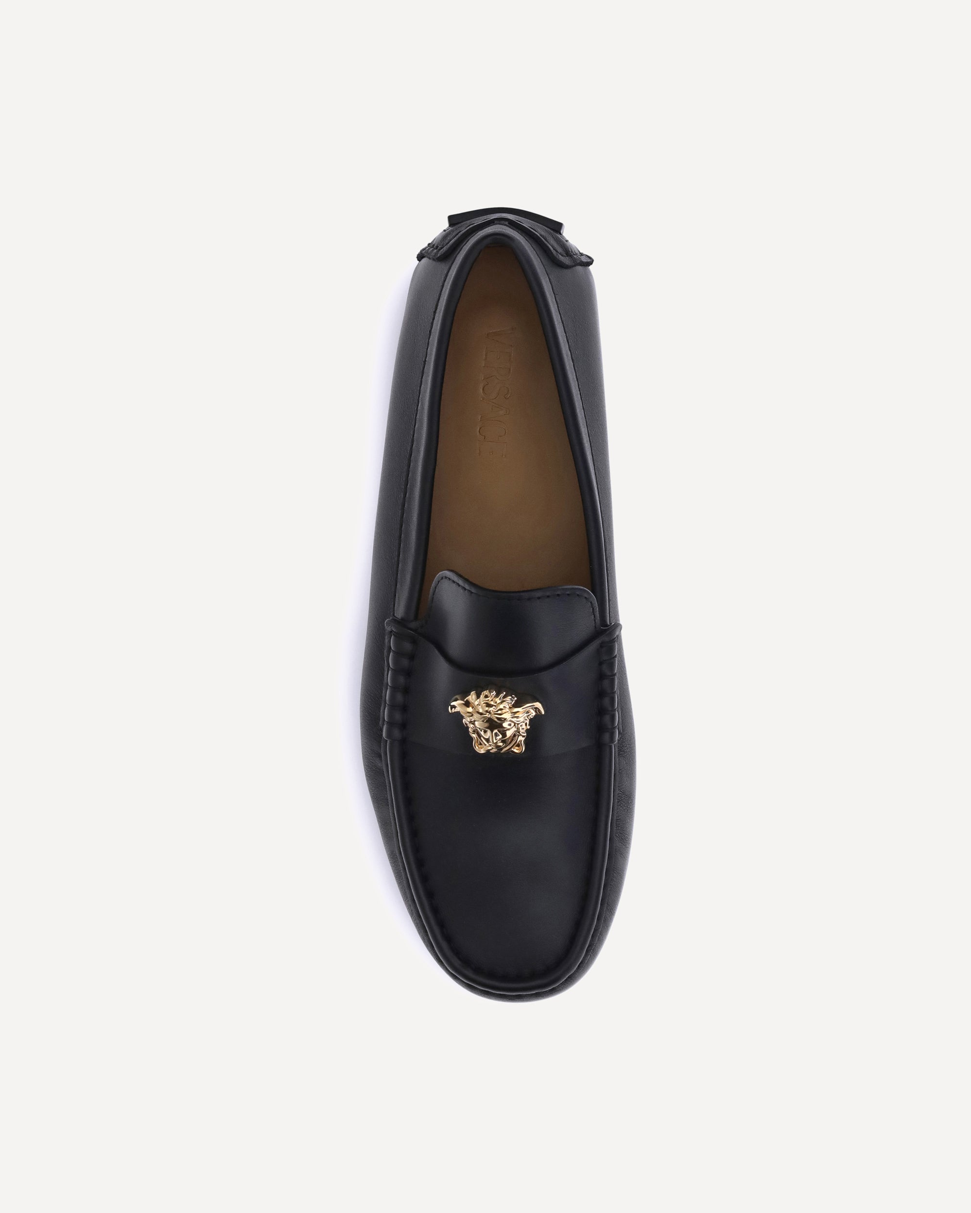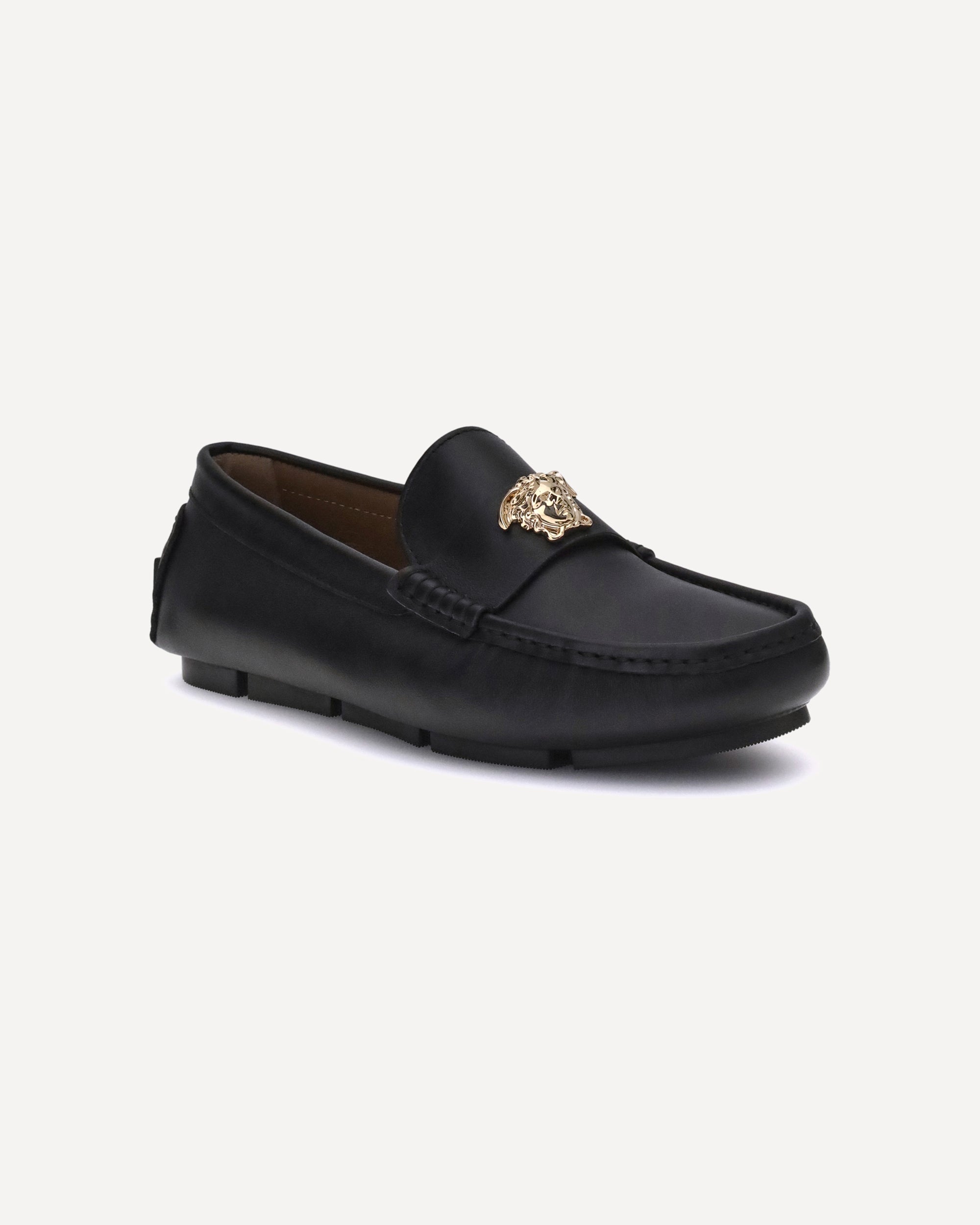 I Mocassini Driver di Versace uniscono eleganza classica e dettagli iconici in perfetto stile della maison. Realizzati in morbida pelle di vitello, sono dotati di comode suole Greca in gomma, che garantiscono comfort e aderenza. Il design è valorizzato dal cinturino frontale con l’accessorio La Medusa, simbolo distintivo di Versace. La calzata slip-on li rende pratici e versatili, ideali per un look curato e contemporaneo.