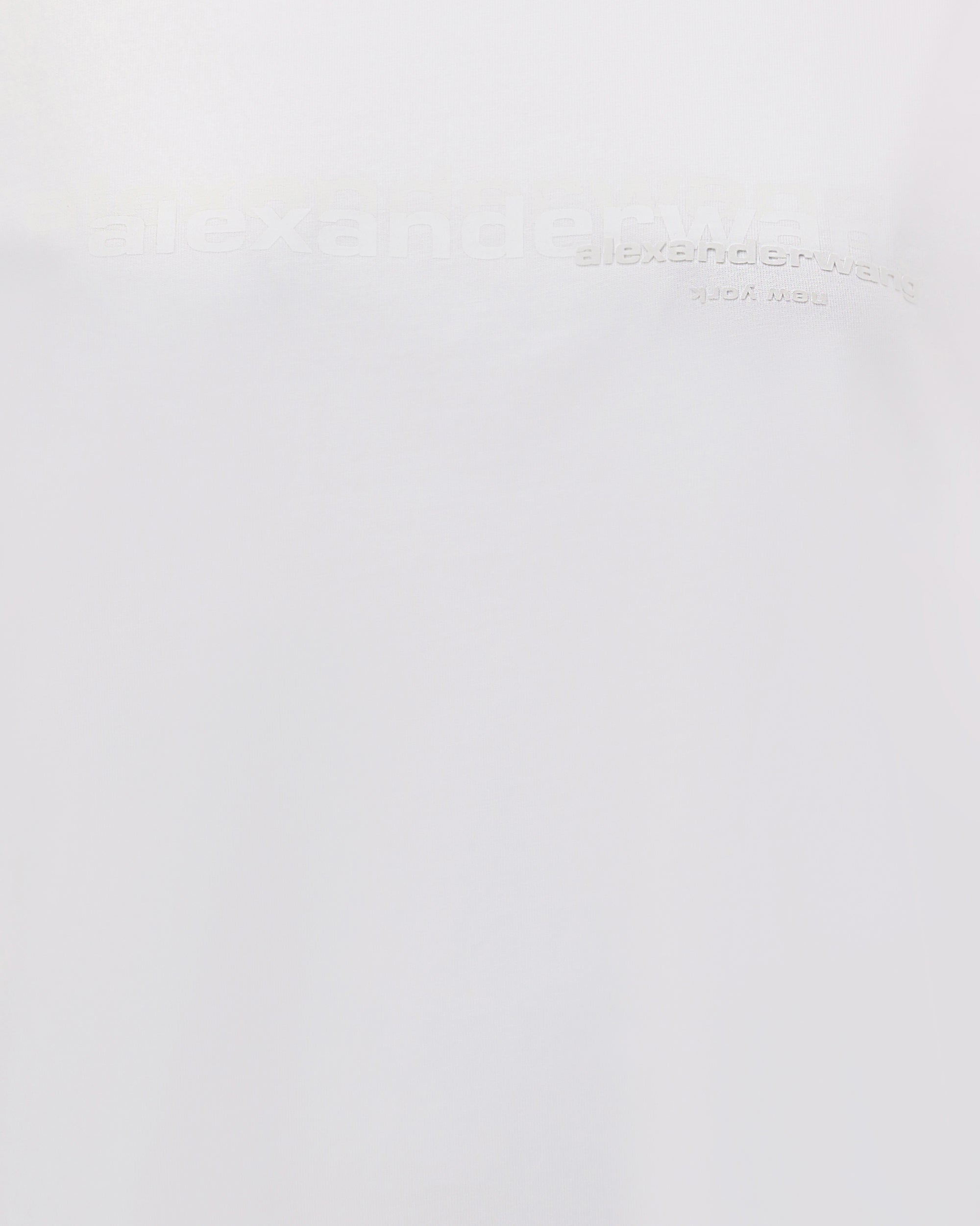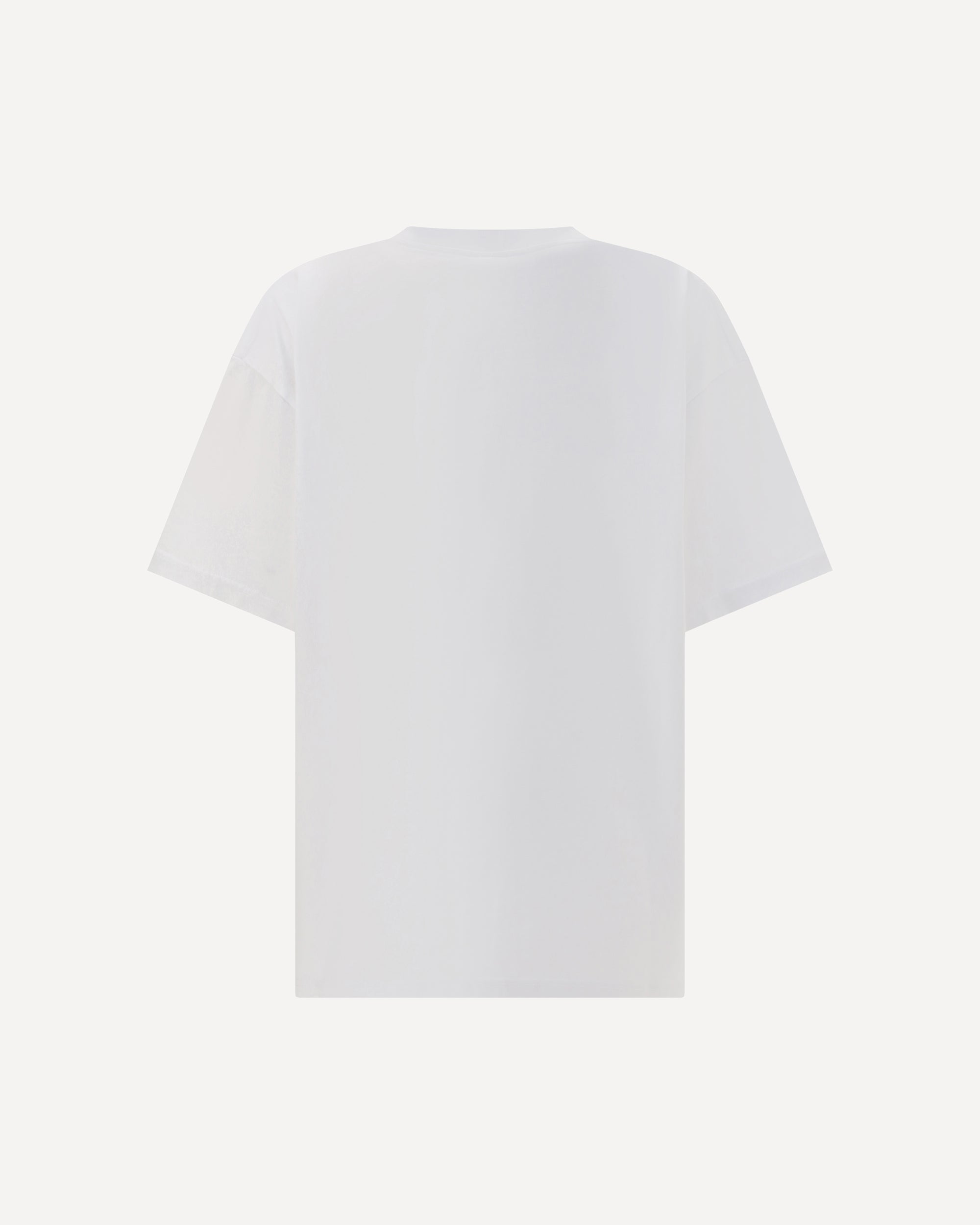 T-shirt in puro cotone firmata Alexander Wang, dal design essenziale e d’impatto. Caratterizzata da girocollo a costine e iconico monogramma a contrasto ricamato sul fronte. La vestibilità oversize dona un look rilassato e contemporaneo, perfetto per uno stile urbano e disinvolto.