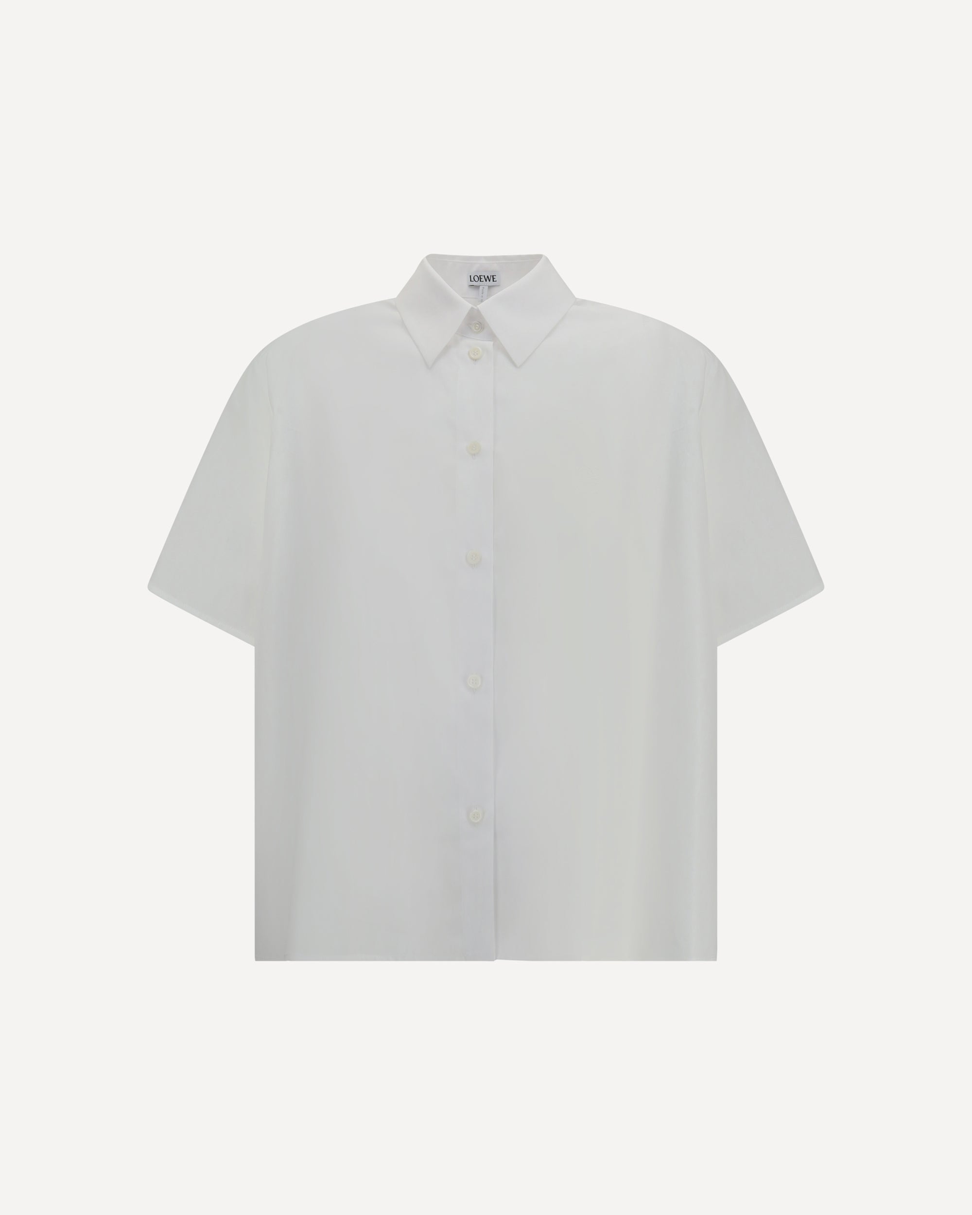 La Camicia crop Trapeze di Loewe è un capo dal taglio moderno e dall’eleganza essenziale. Realizzata con una linea ampia e leggermente strutturata, presenta un colletto classico e una chiusura frontale con bottoni che ne enfatizzano il carattere sobrio e raffinato. Sul retro, le pieghe a cannoncino aggiungono volume e movimento alla silhouette, mentre il ricamo con l’anagramma iconico del brand, posizionato sul petto, firma il capo con un dettaglio distintivo.