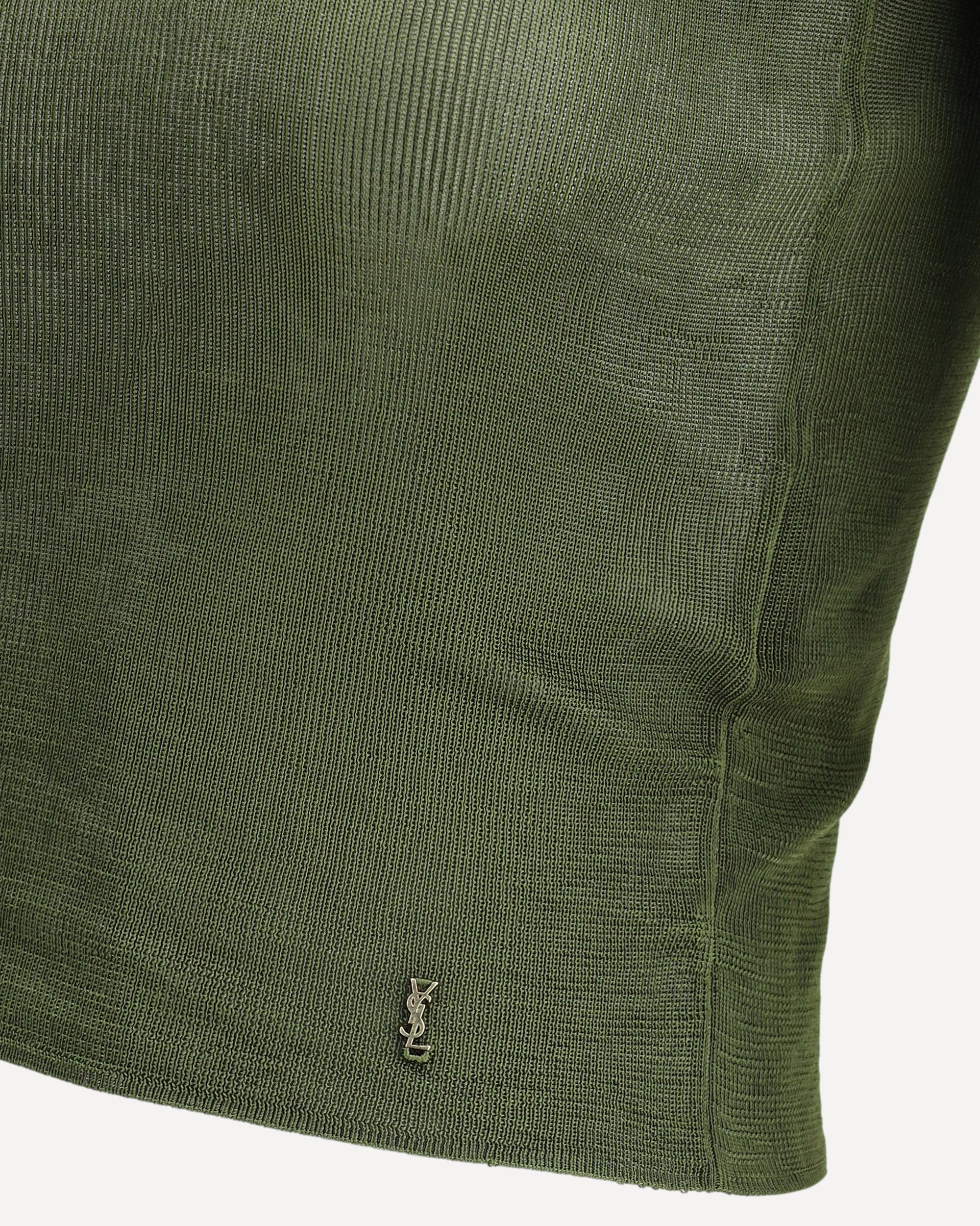 Il Top di Saint Laurent unisce semplicità e raffinatezza in un design essenziale ma riconoscibile. Realizzato in un modello a maniche corte con girocollo classico, si distingue per la placca metallica con l’iconico logo YSL applicata sul fronte, dettaglio distintivo che richiama l’eleganza senza tempo della Maison. La vestibilità aderente valorizza la silhouette con discrezione, rendendolo un capo versatile, perfetto da indossare da solo o sotto blazer strutturati per un look deciso e sofisticato.