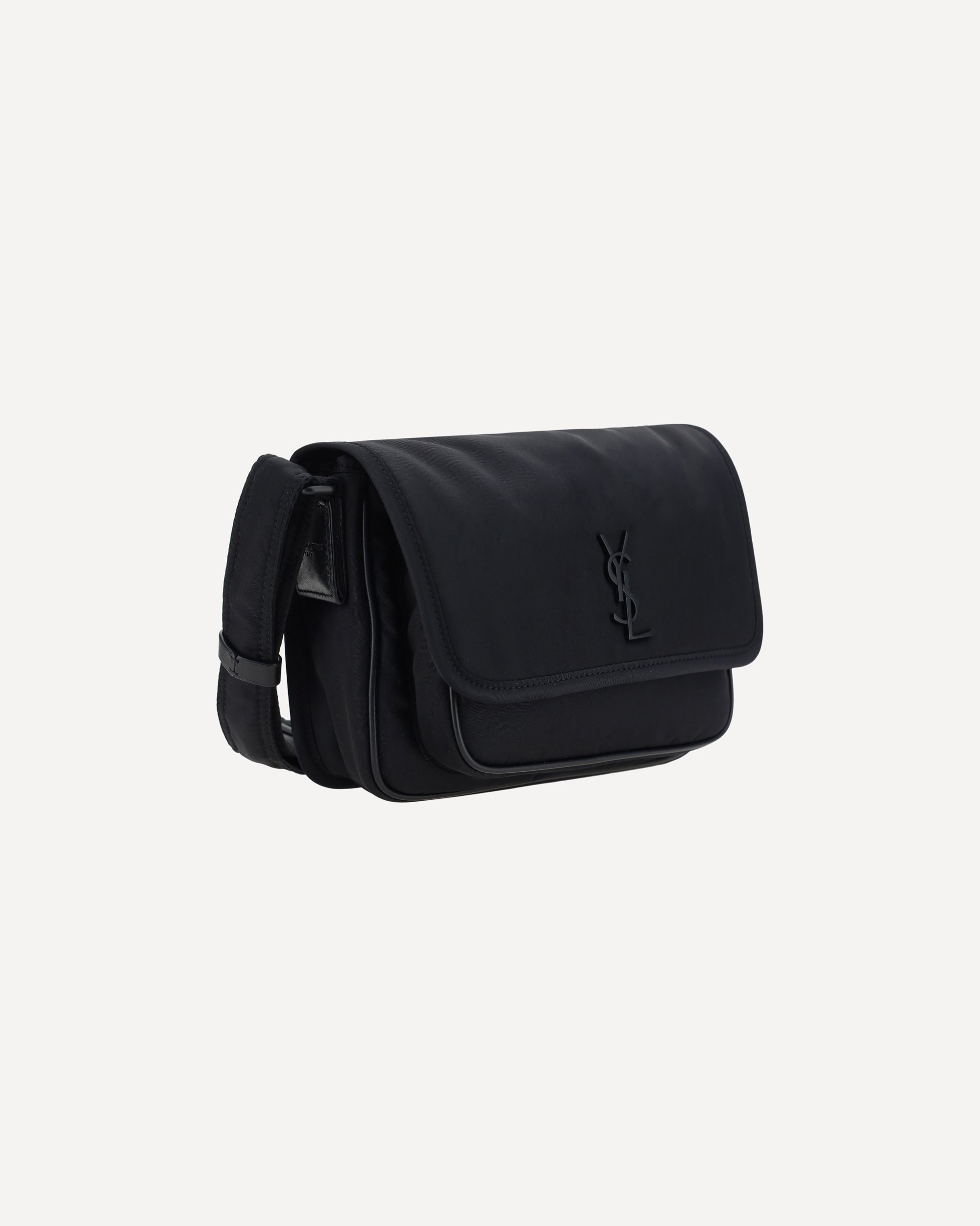 Borsa a Tracolla di Saint Laurent, tracolla regolabile, chiusura frontale con patta magnetica, iconica placca tridimensionale logo YSL applicata sul frontale, tasca a filetto sul pannello posteriore, unico scomparto interno.