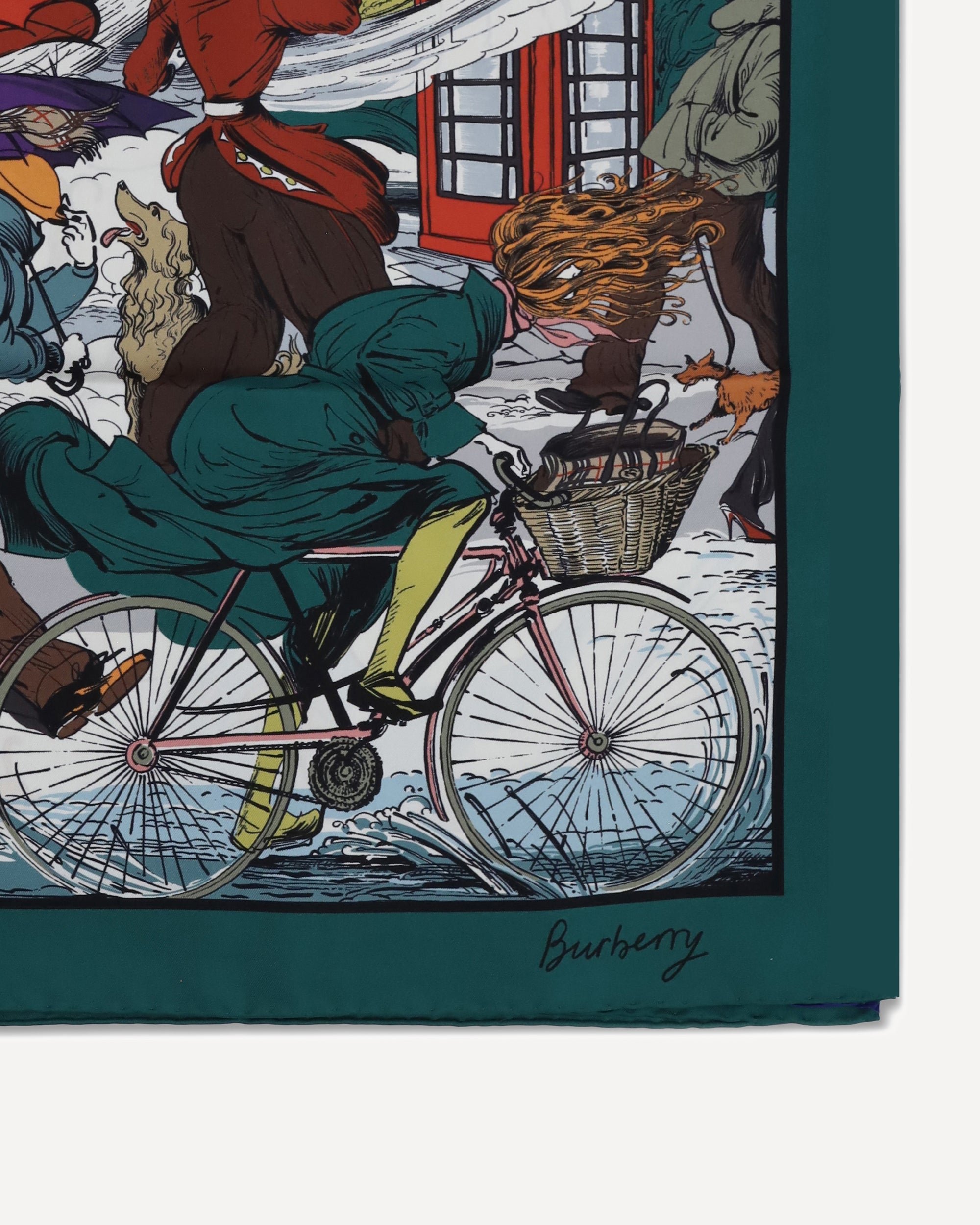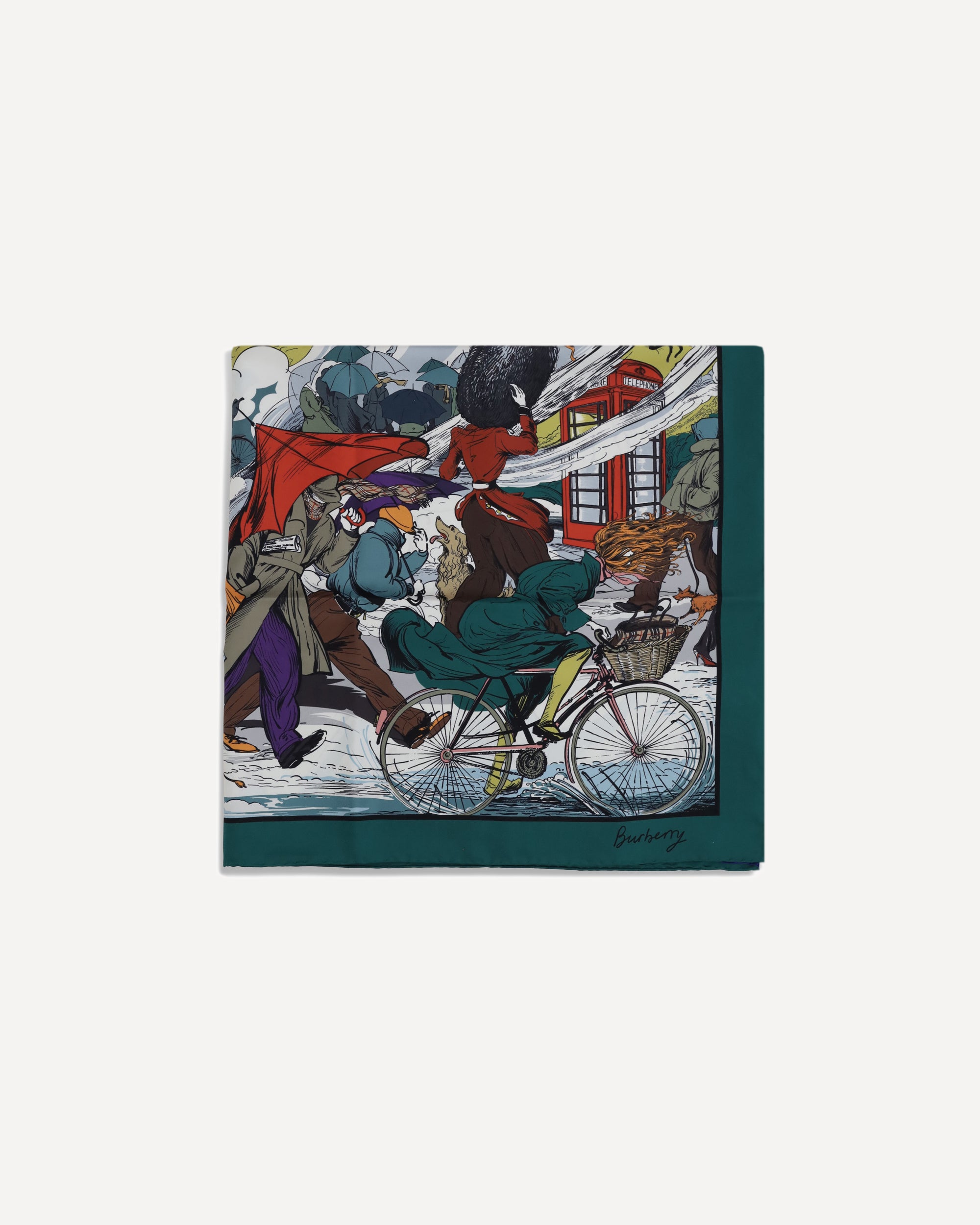 Il Foulard in seta Burberry Raining Cats and Dogs racconta, con eleganza giocosa, l’imprevedibilità del cielo inglese. Realizzato in Italia in twill di seta, presenta un disegno d’archivio reinterpretato: una scena illustrata a mano in cui i londinesi affrontano vento e pioggia avvolti in cappotti e accessori iconici. Il formato a quadrato, gli orli arrotolati a mano e la scritta Burberry stampata sui bordi completano questo accessorio raffinato e narrativo.