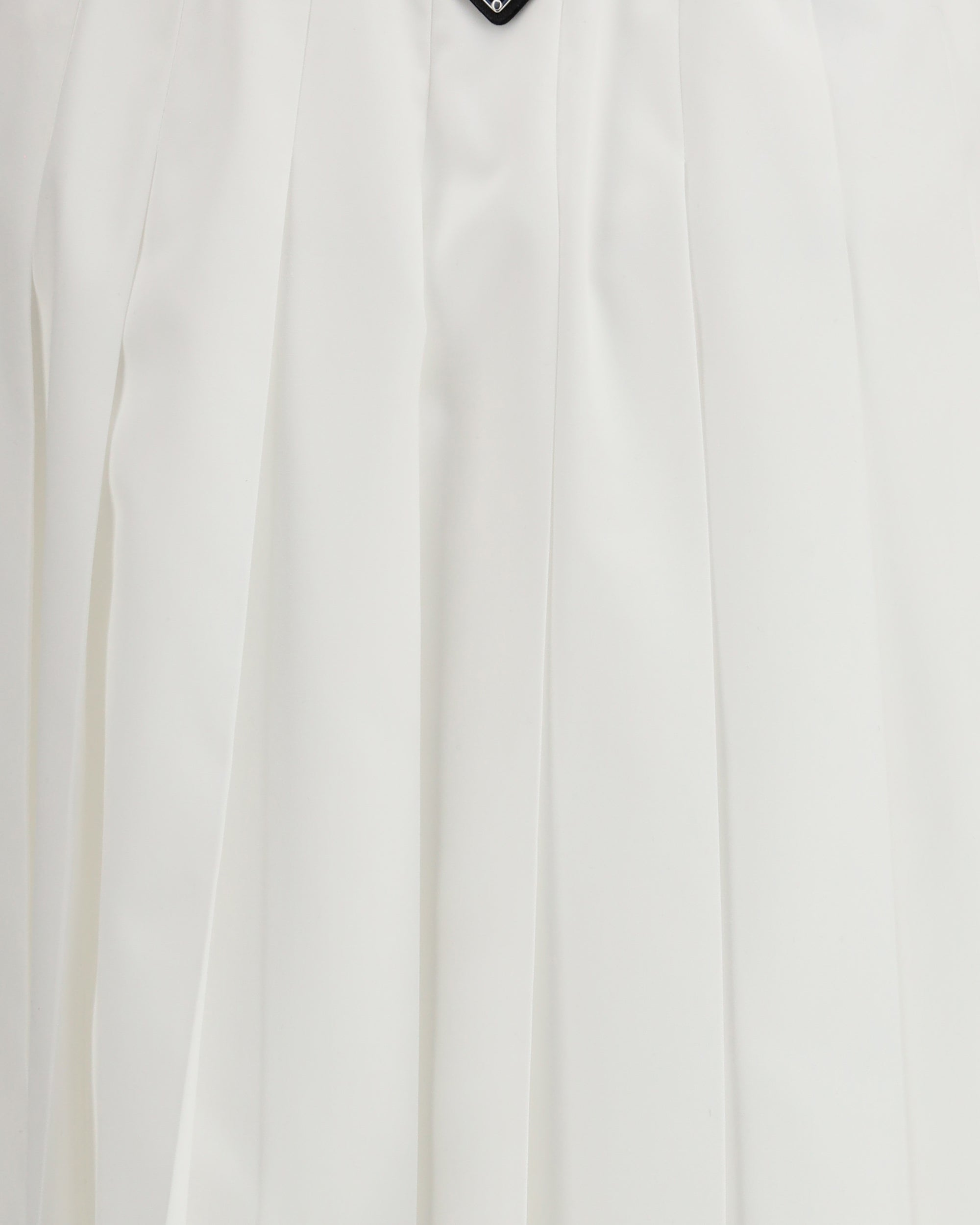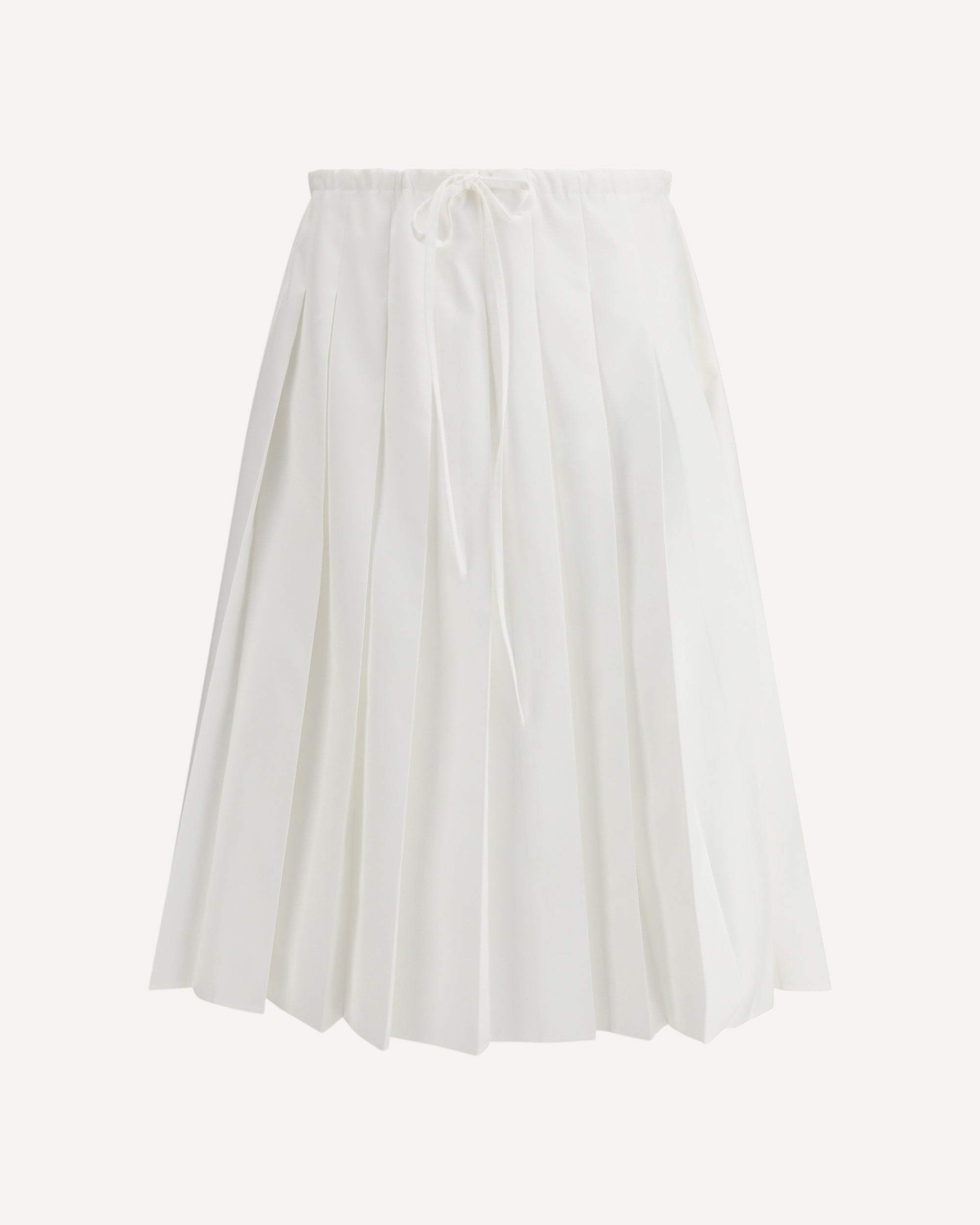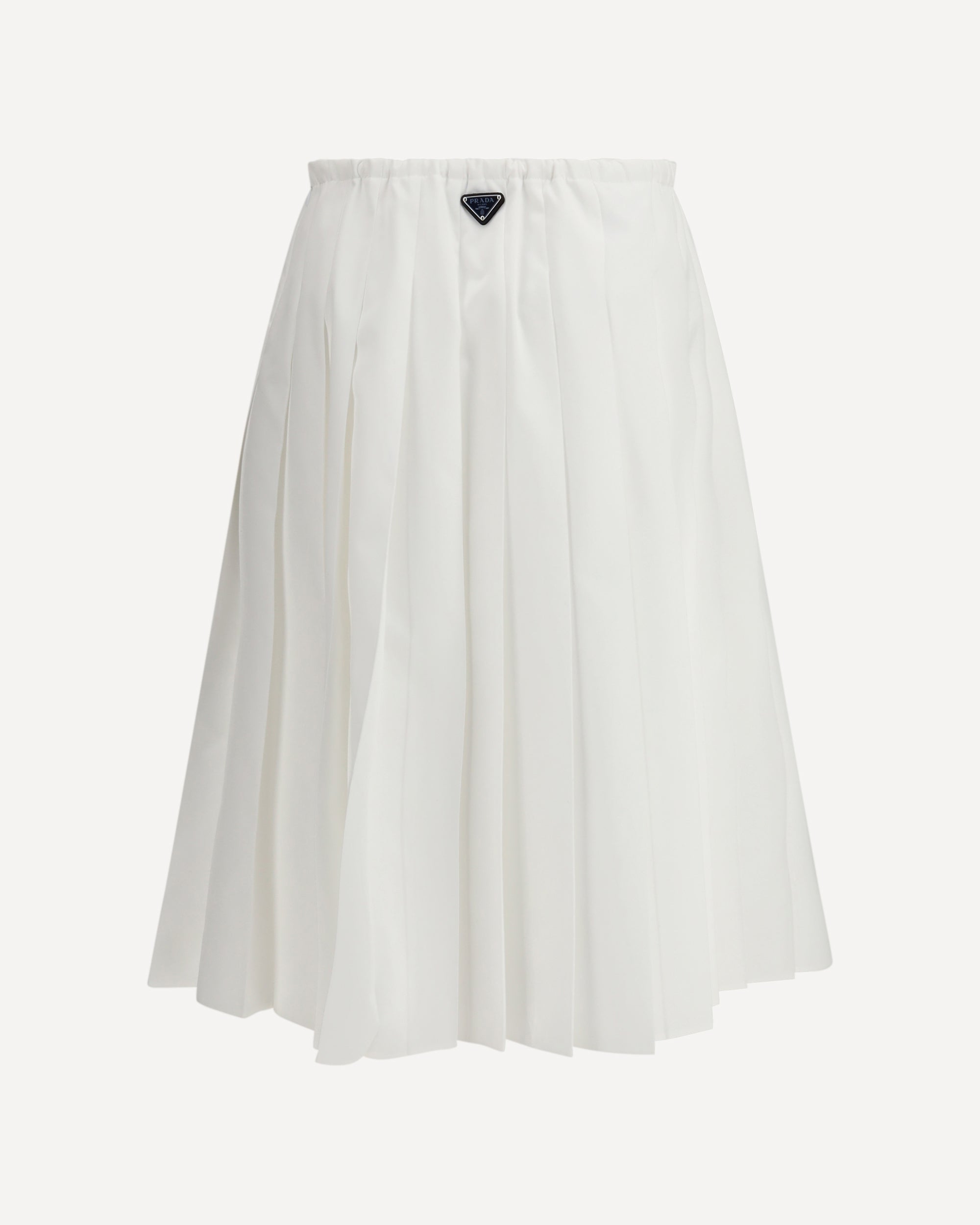 La Gonna in jersey plissé di Prada unisce leggerezza e richiami rétro, dando vita a un modello dalle pieghe rigorose e dal movimento fluido. Realizzata in jersey leggero e lasciata sfoderata per mantenere la naturale morbidezza del tessuto, presenta una chiusura frontale con lacci che aggiunge un dettaglio discreto ma distintivo. Il logo triangolo in tessuto con etichetta sartoriale completa il design con la firma essenziale della maison.