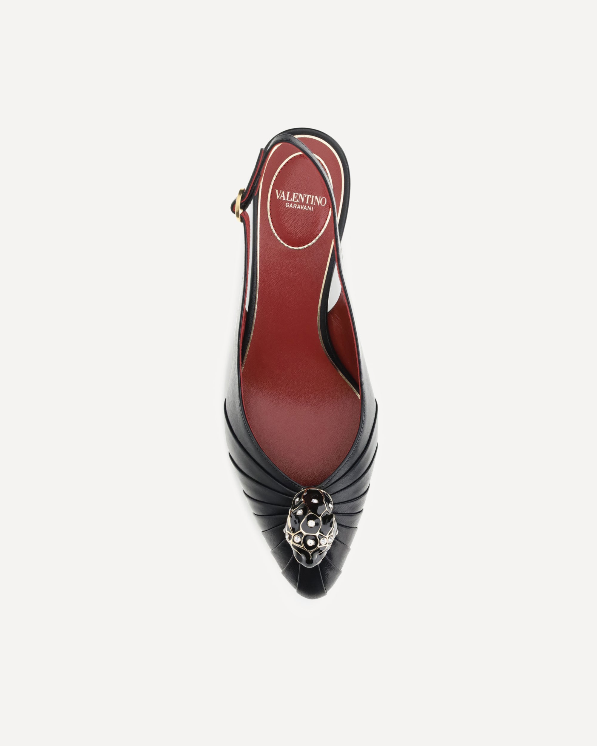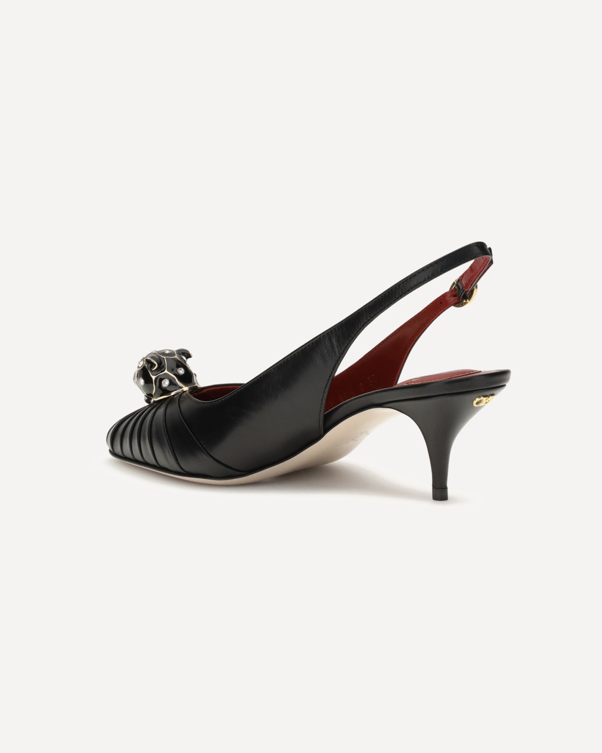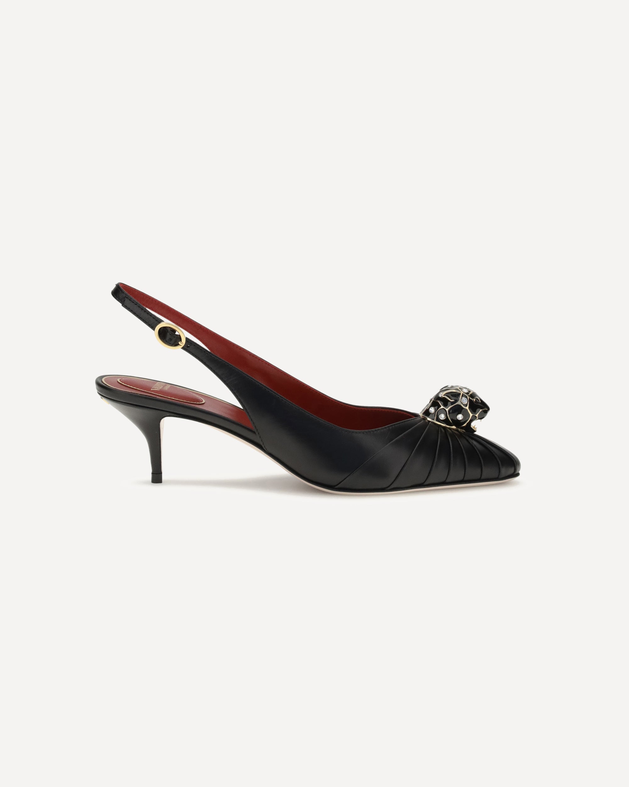 Le Décolleté Panthea di Valentino Garavani sono realizzate in morbido capretto con raffinata lavorazione plissé. Il design è impreziosito da una testa di felino smaltata decorata con cristalli Swarovski® e dal dettaglio VLogo Signature in ottone a finitura effetto anticato, per un’eleganza audace e sofisticata.