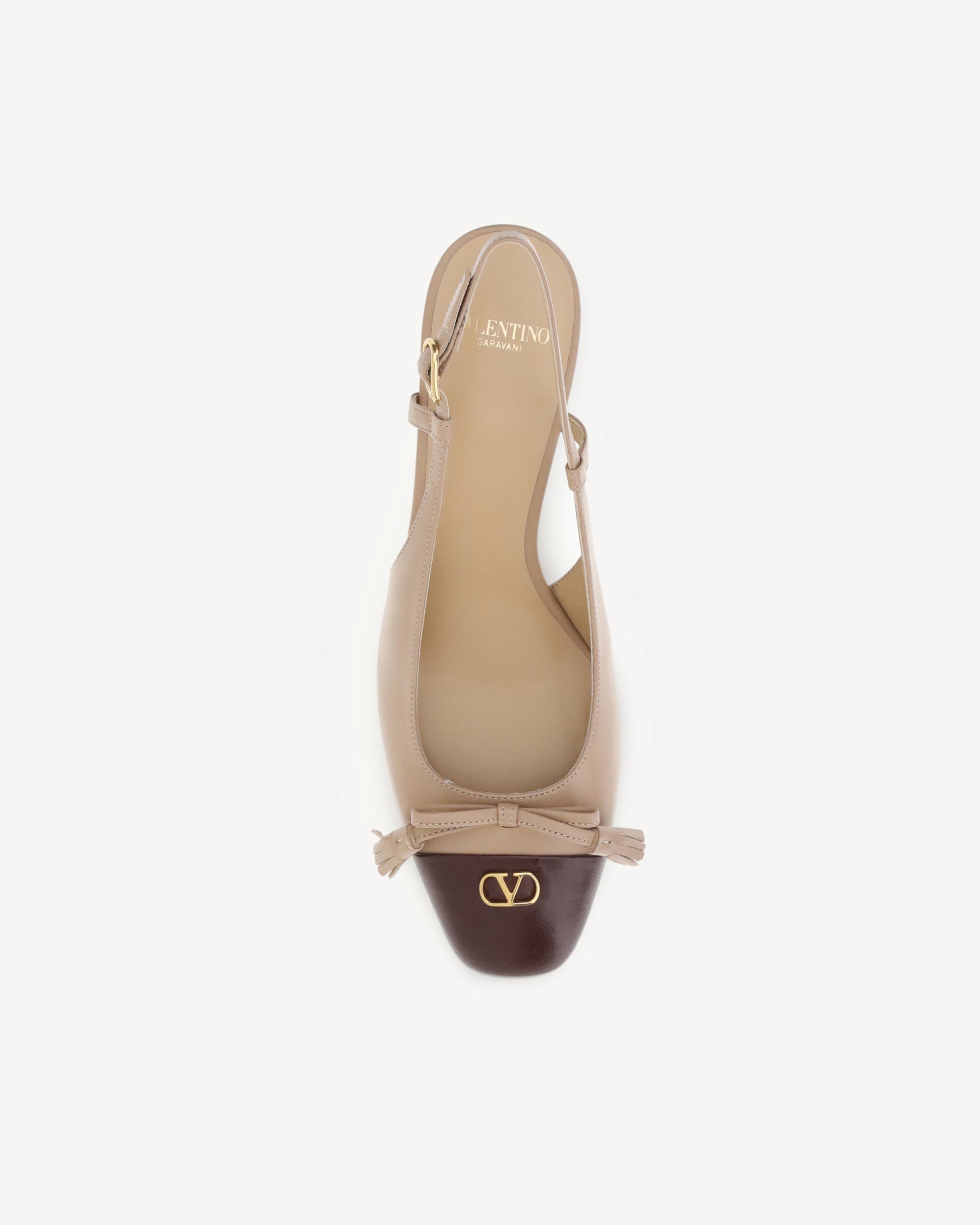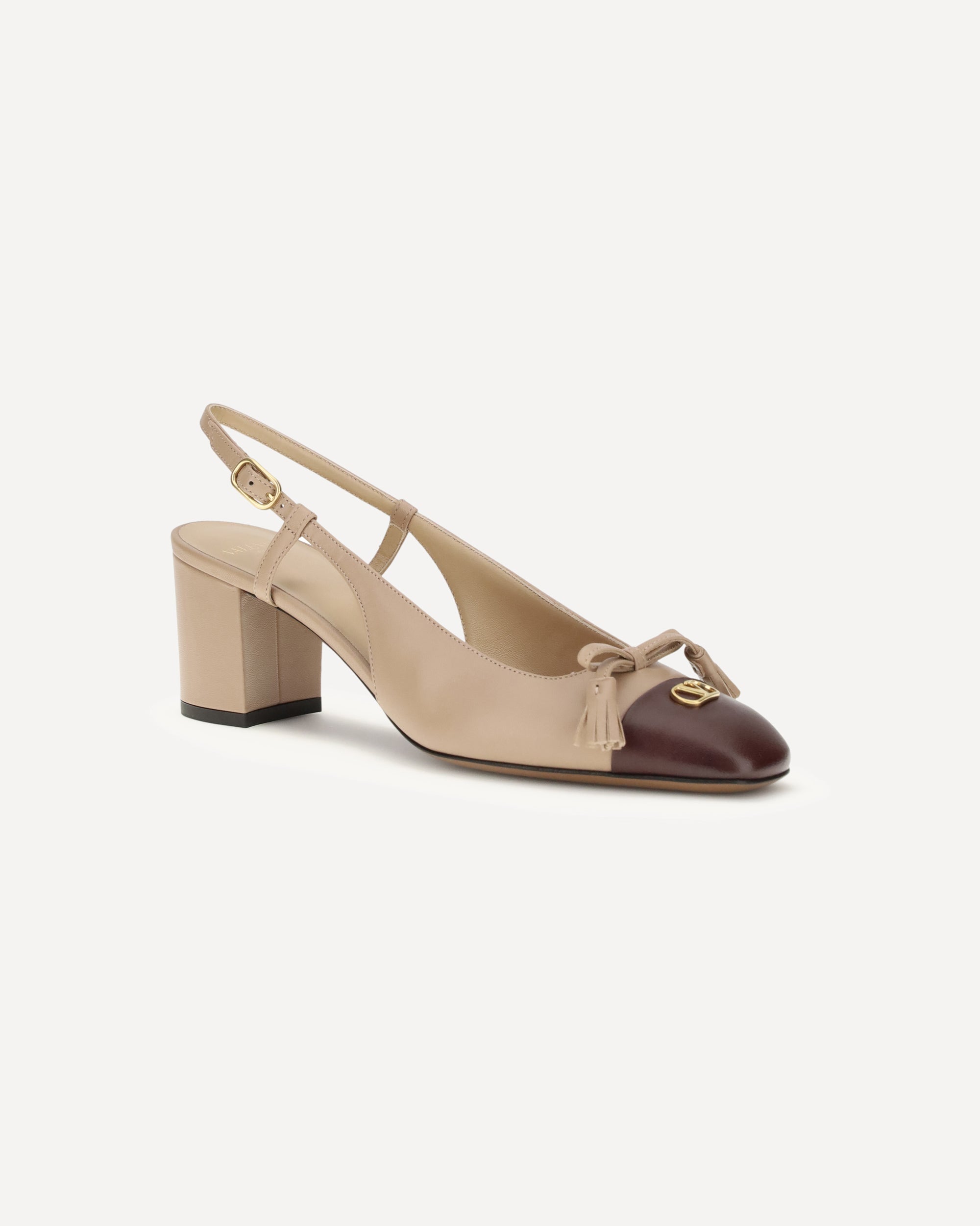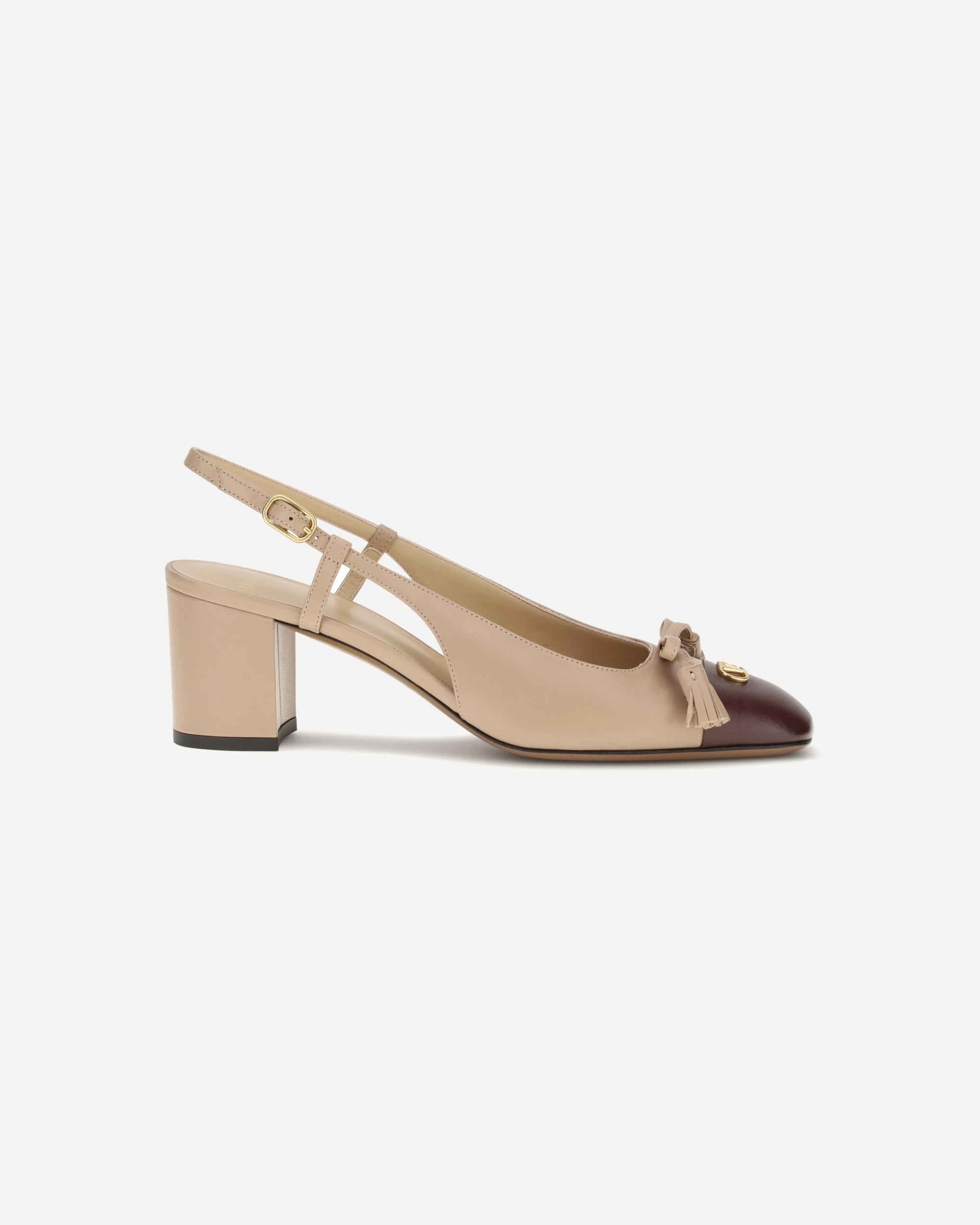Le Décolleté Valet Du Roi di Valentino Garavani reinterpretano lo stile classico con un’eleganza d’altri tempi. Realizzate in capretto bi-colore, presentano una silhouette slingback impreziosita dal dettaglio VLogo Signature in ottone con effetto anticato. Completano il design un raffinato fiocco con nappine in pelle e un cinturino regolabile con fibbia, per una calzata personalizzata e un look sofisticato.