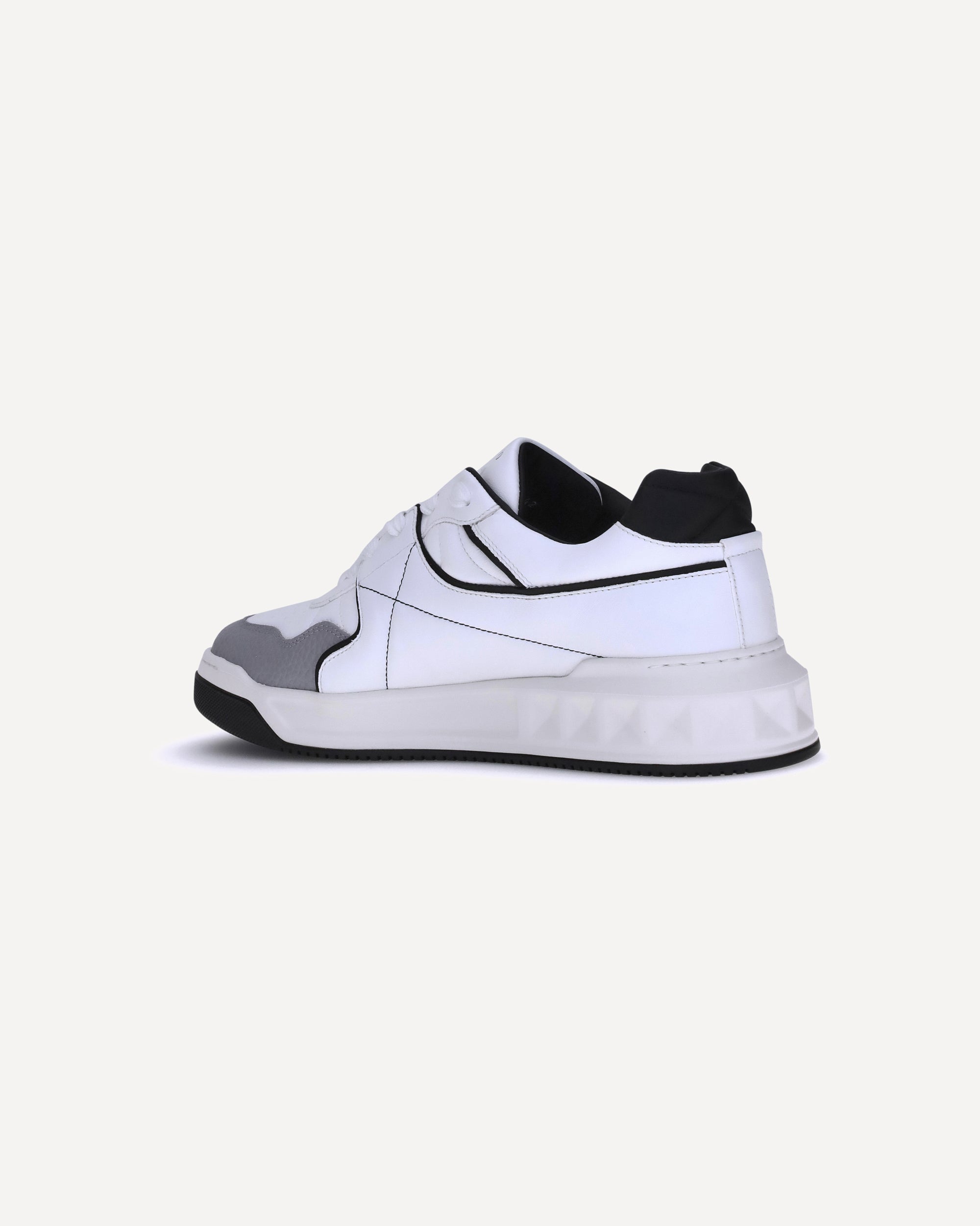 Le Sneakers Low-Top One Stud di Valentino Garavani reinterpretano l’estetica urbana con un tocco di eleganza iconica. Caratterizzate da un design pulito e contemporaneo, si distinguono per il dettaglio della maxi borchia con finitura semi-opaca, elemento simbolo della Maison che conferisce personalità e riconoscibilità al modello. Il logo Valentino Garavani serigrafato sul tallone e sulla linguetta aggiunge una nota grafica sobria ma distintiva. La suola in gomma è arricchita da un raffinato dettaglio della maxi borchia in basso rilievo, che si ripete anche sul battistrada, creando un effetto visivo coerente e di forte impatto.