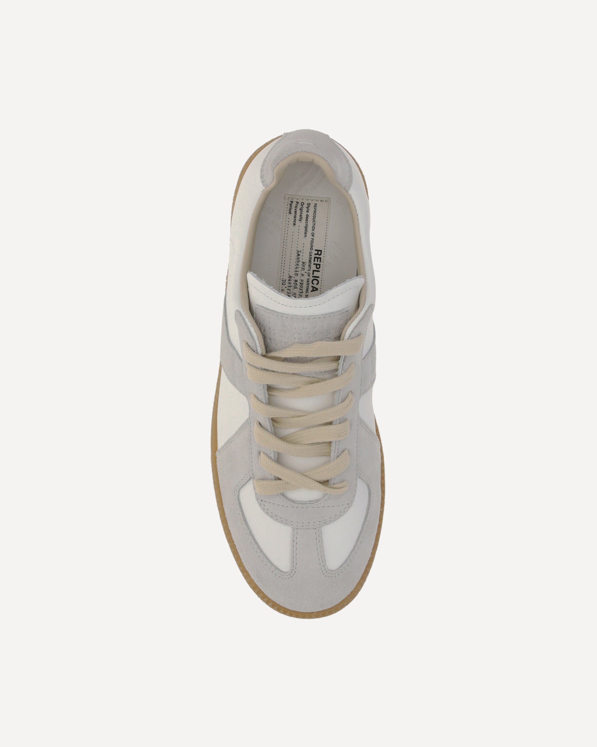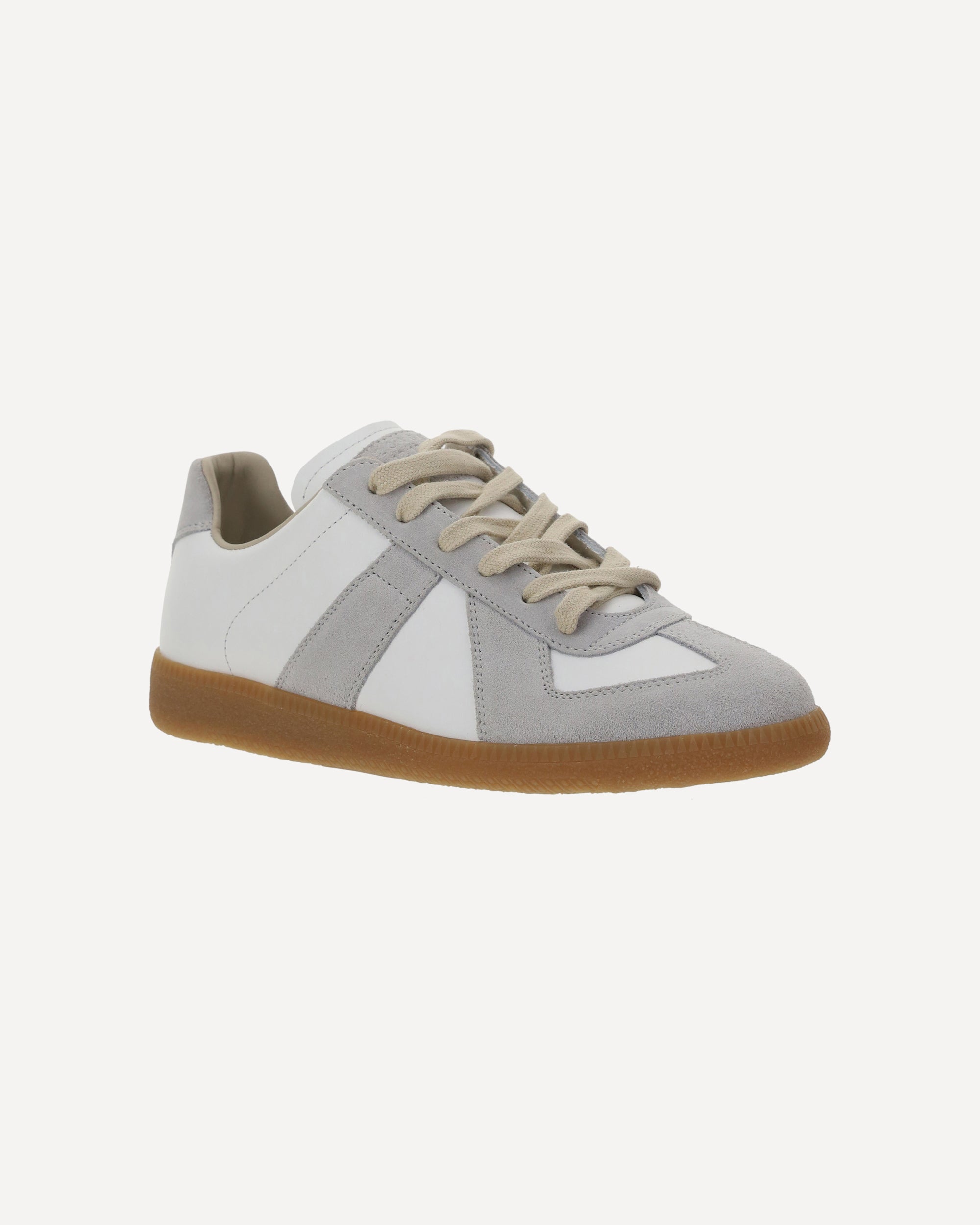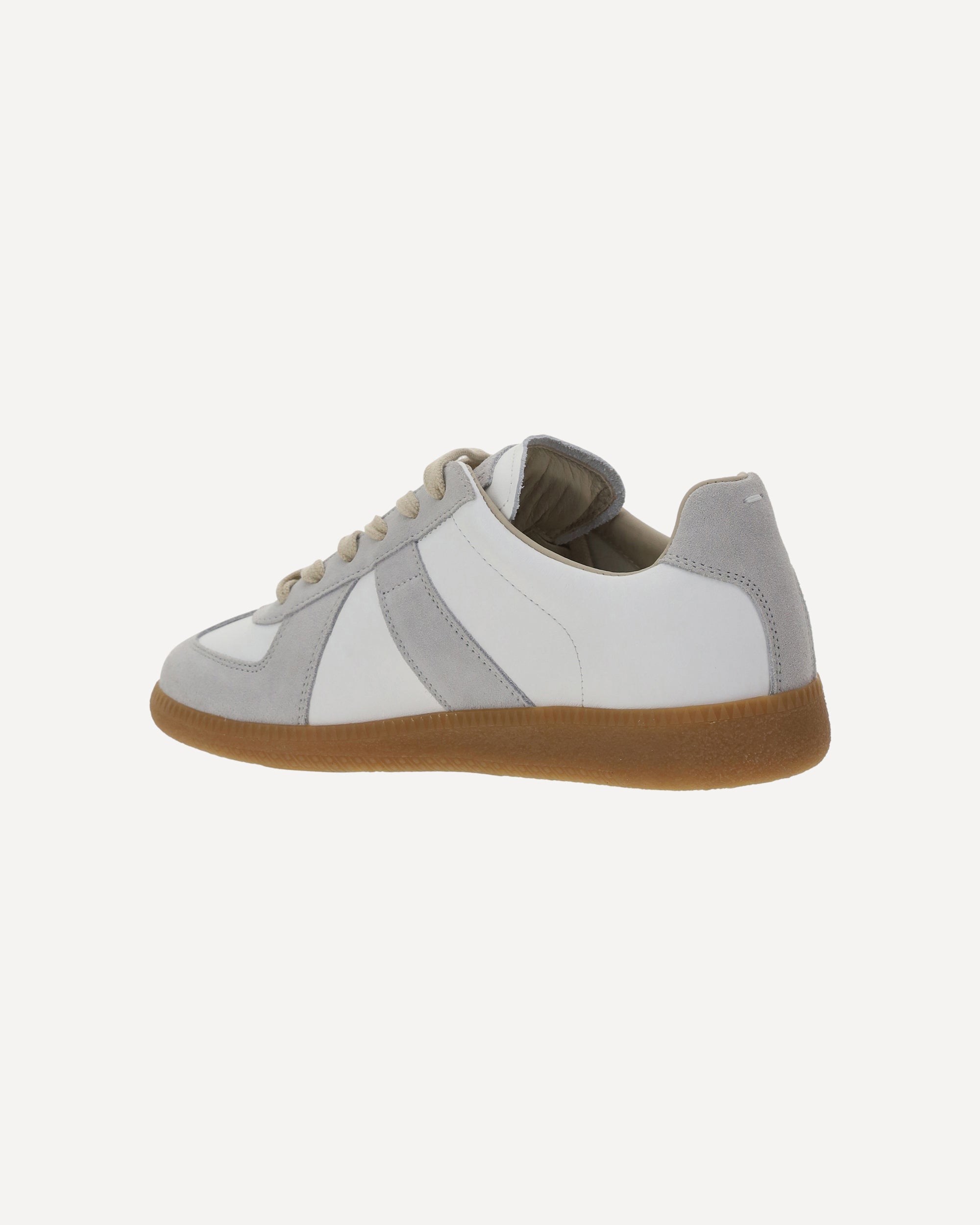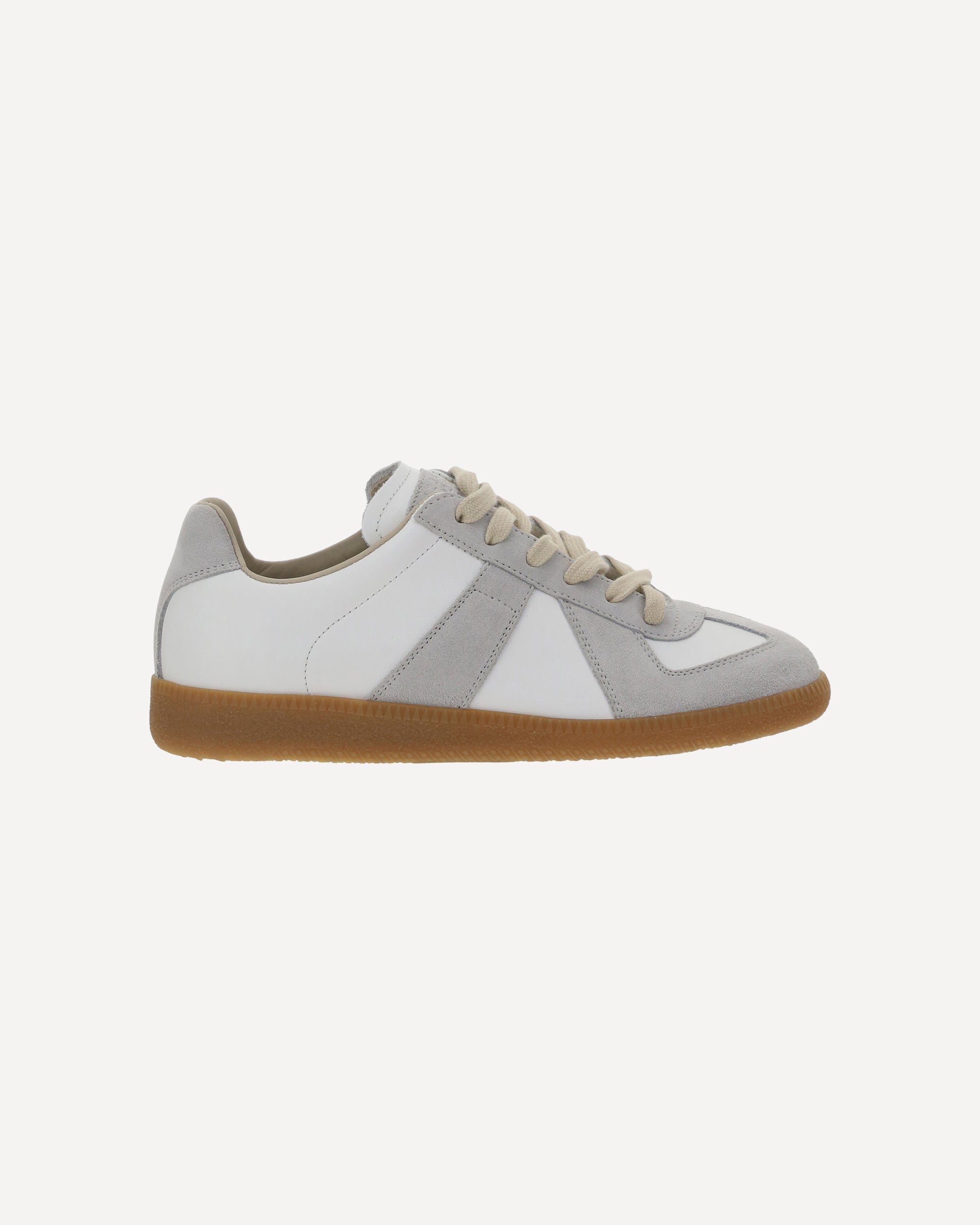 Le Sneakers in pelle di Maison Margiela presentano una punta tonda e una chiusura frontale con lacci. Sono arricchite da dettagli in pelle scamosciata e da una targhetta in pelle scamosciata applicata sulla linguetta, con il logo stampato a pressione tono su tono, per un look raffinato e distintivo.