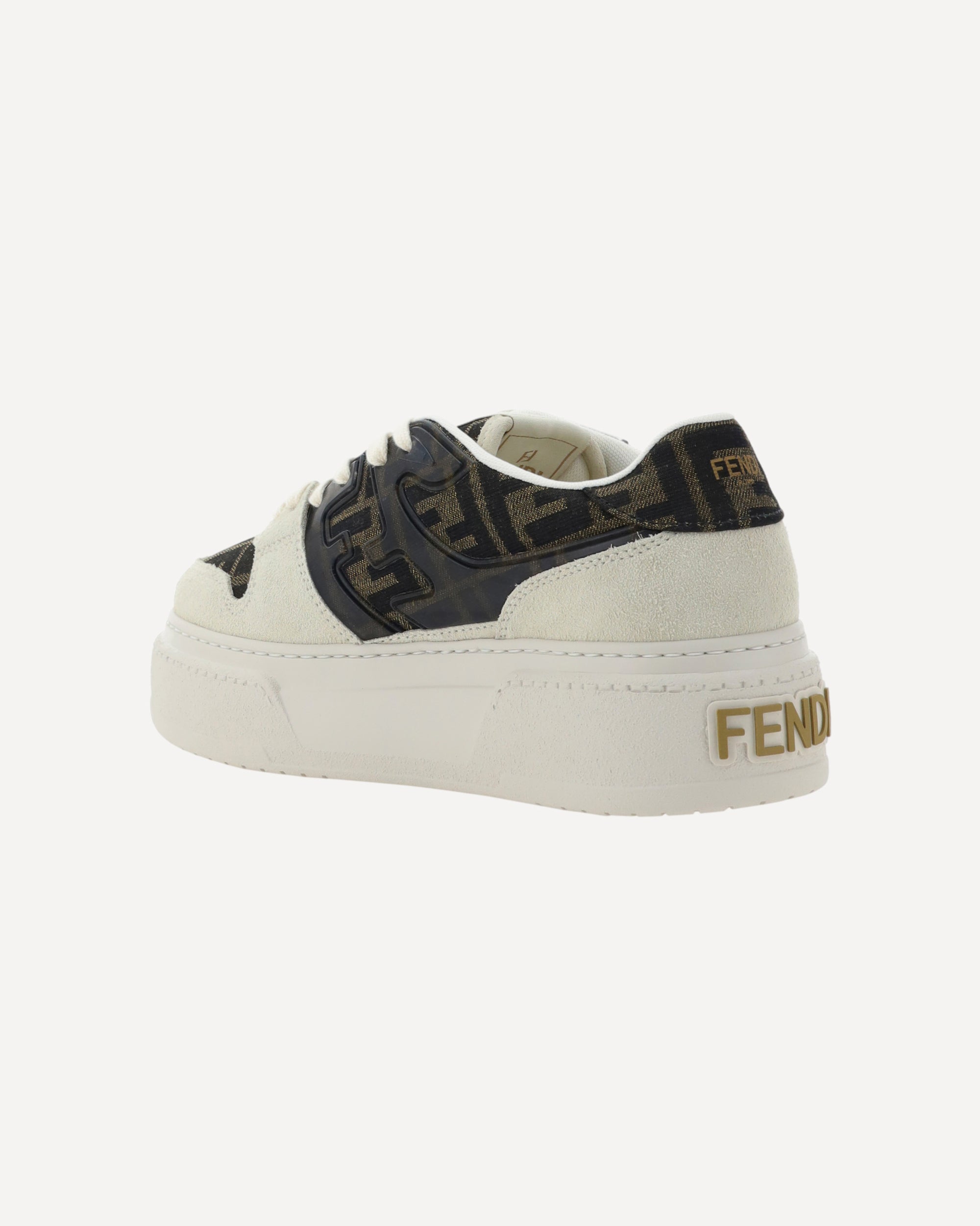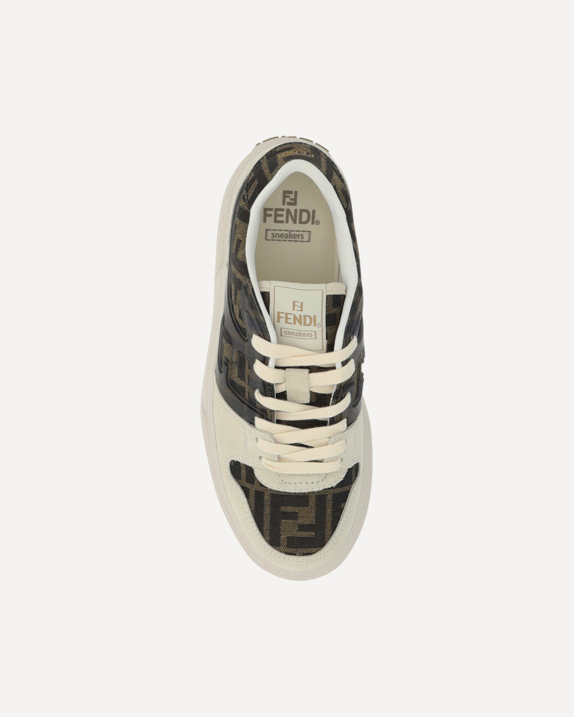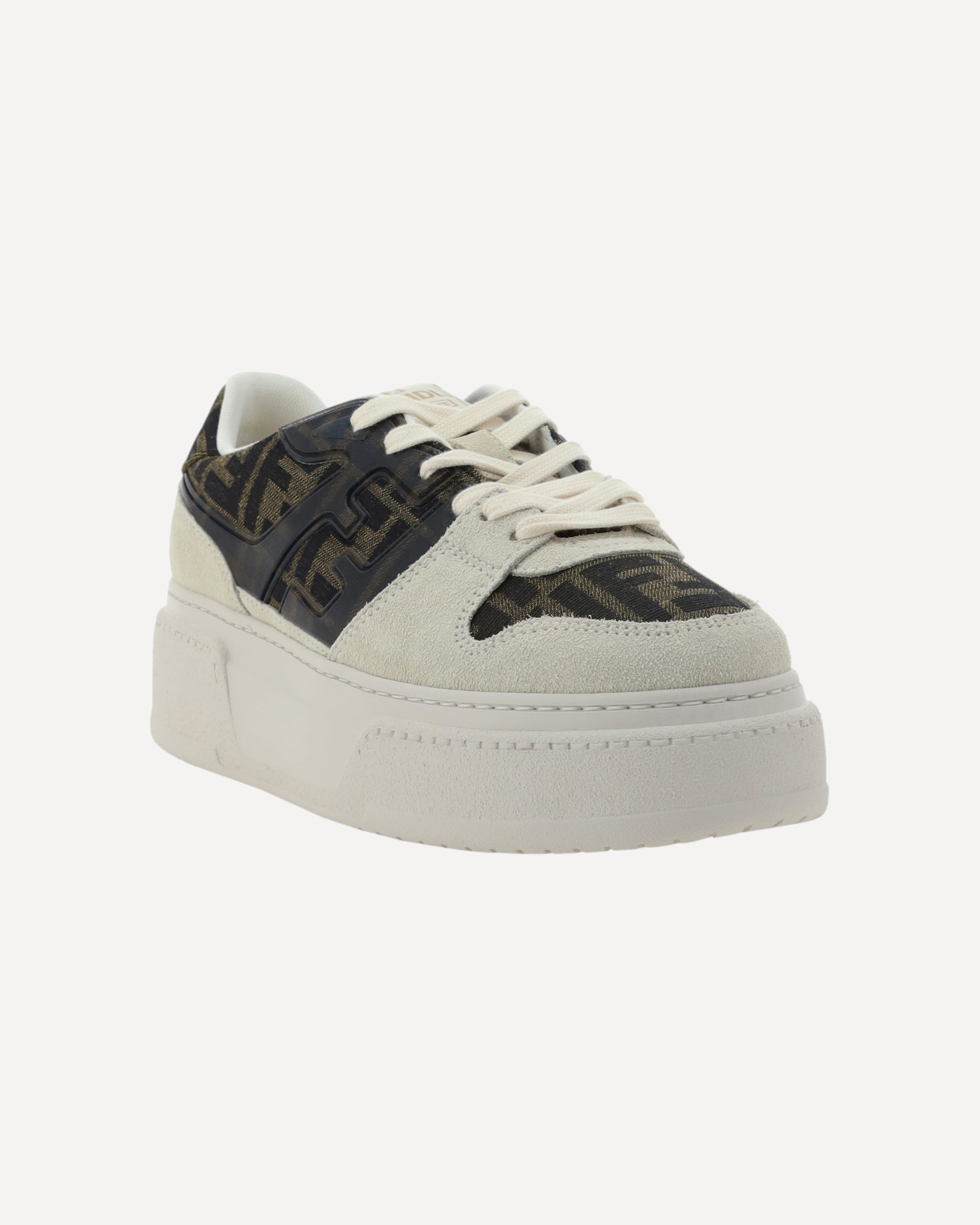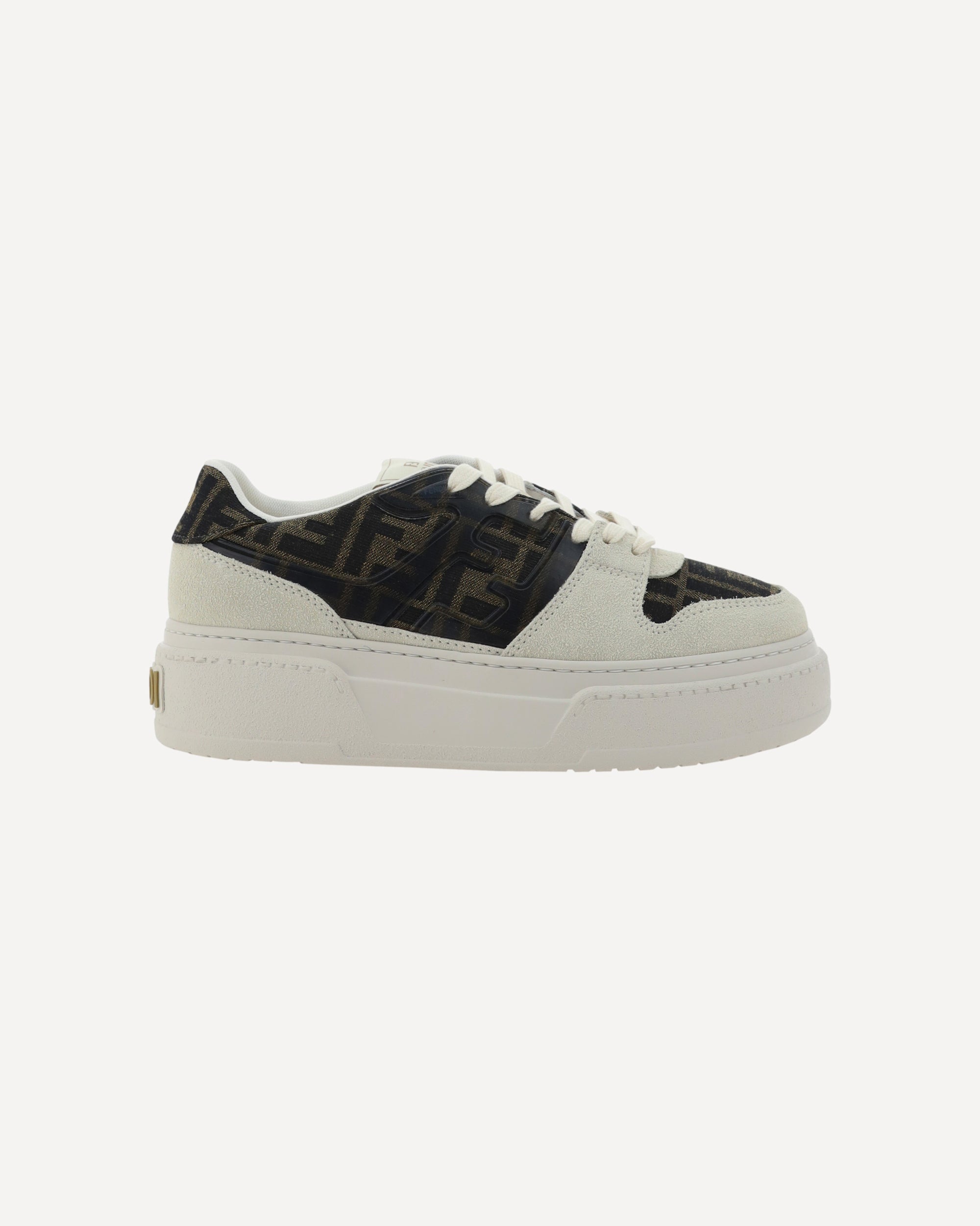 Sneakers di Fendi, dettagli in pelle effetto scamosciato, chiusura con lacci sul fronte, dettagli in tessuto jacquard con iconico motivo FF ripetuto all-over, suola platform con macro lettering Fendi a rilievo sul retro, soletta logata.