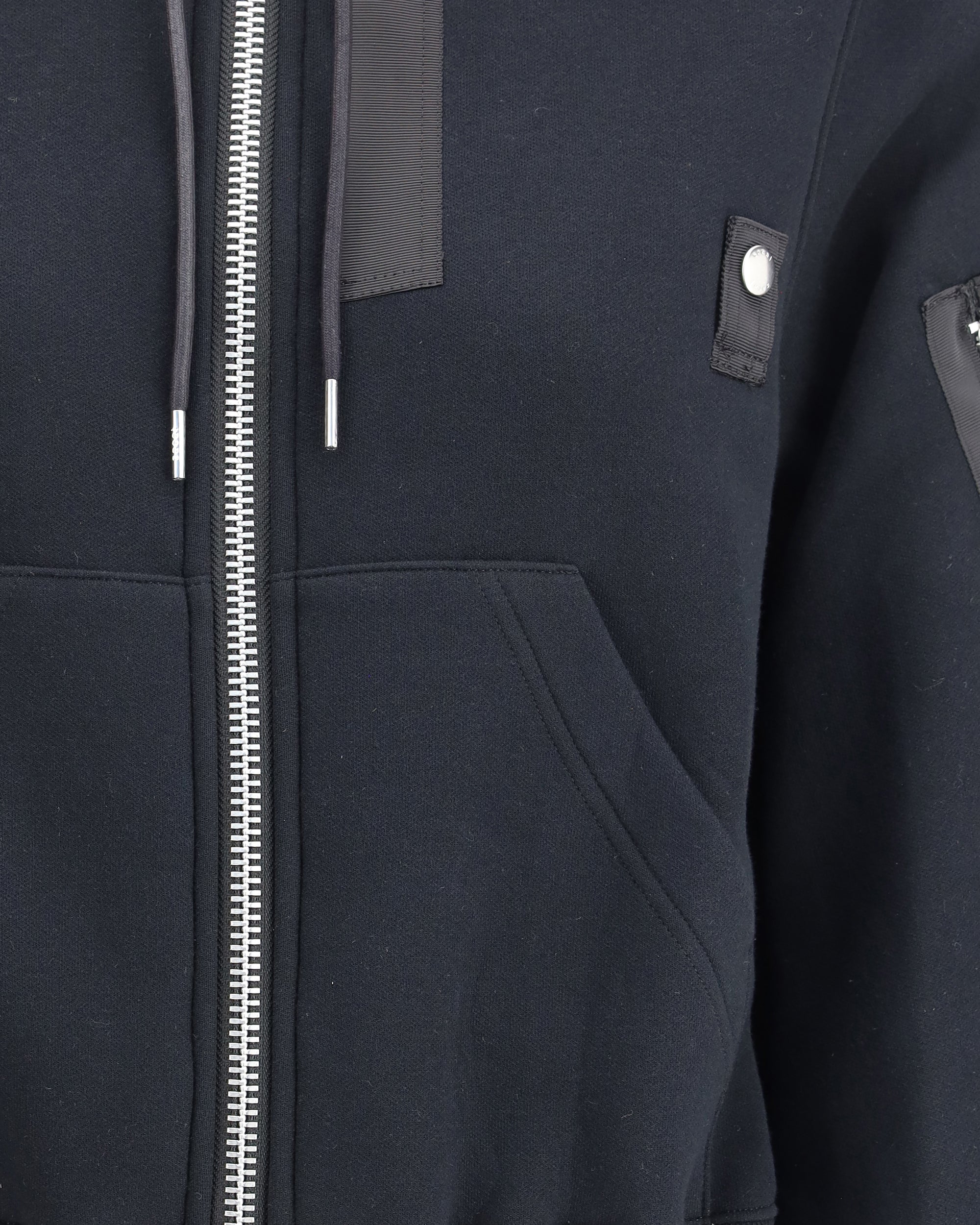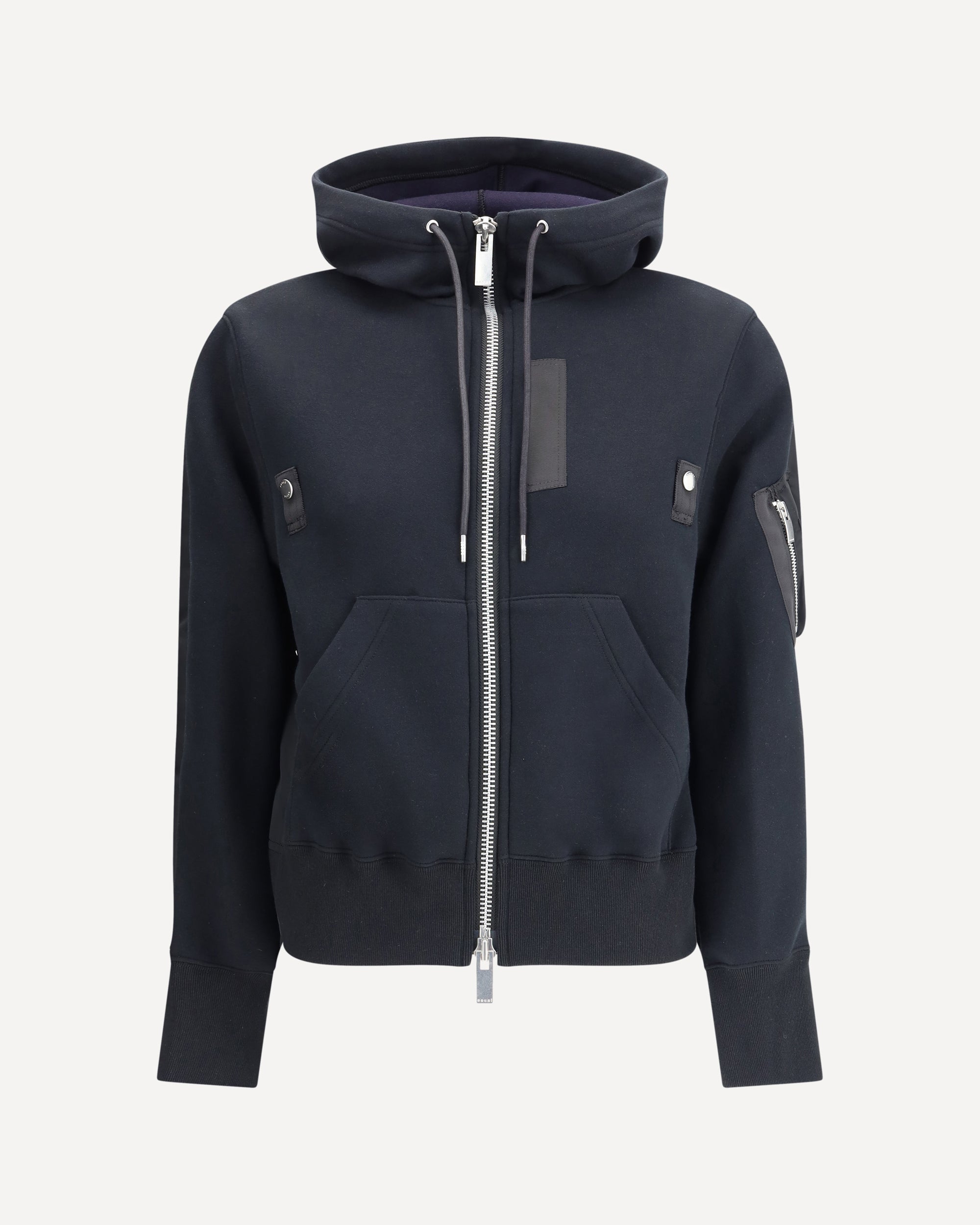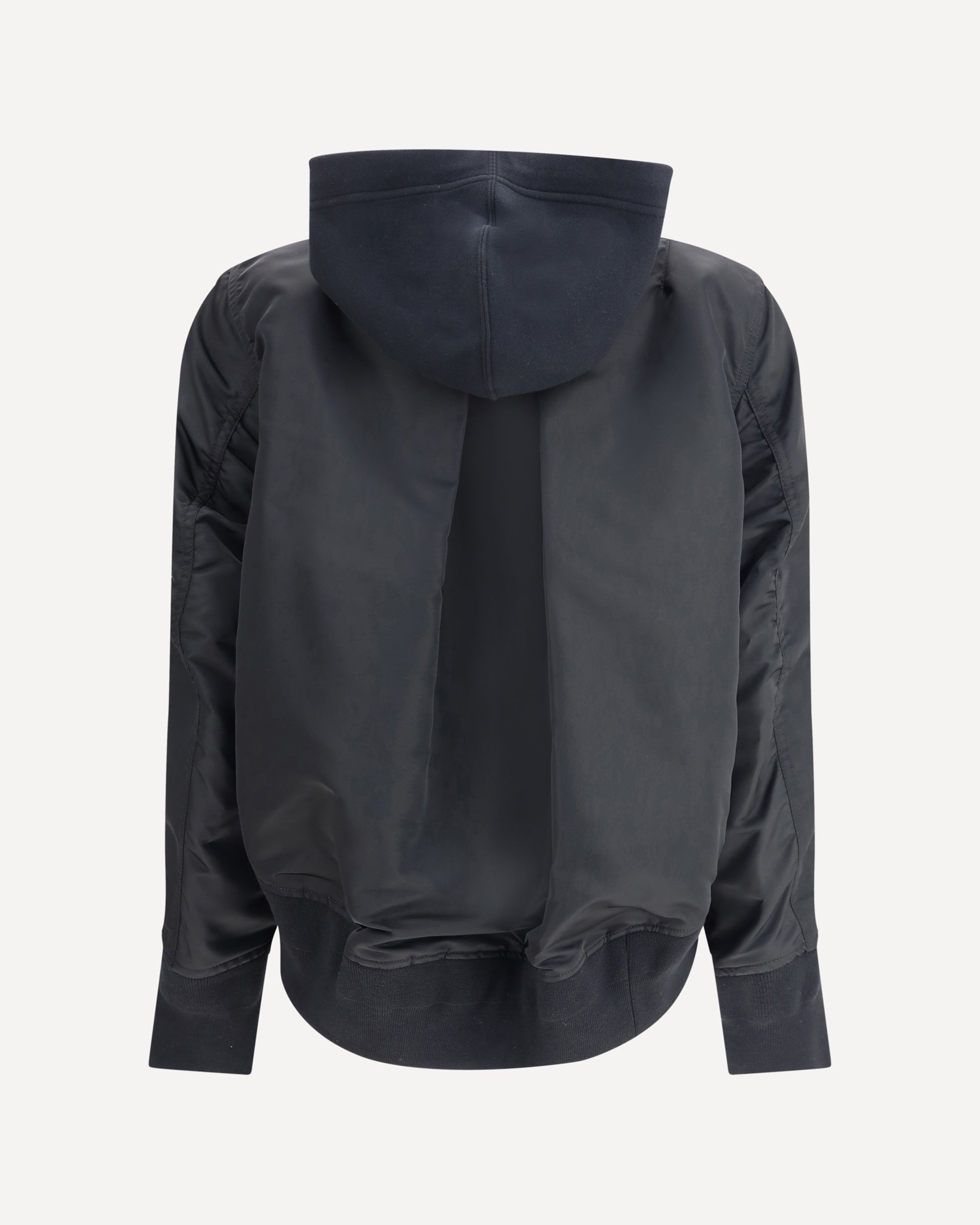 La Giacca bomber di Sacai è un capo dallo stile contemporaneo, con chiusura frontale a zip e due tasche applicate sul davanti. Le maniche e il retro in nylon conferiscono un look tecnico, mentre il cappuccio regolabile con coulisse aggiunge funzionalità. Completano il design i polsini e l’orlo a costine per una vestibilità confortevole.