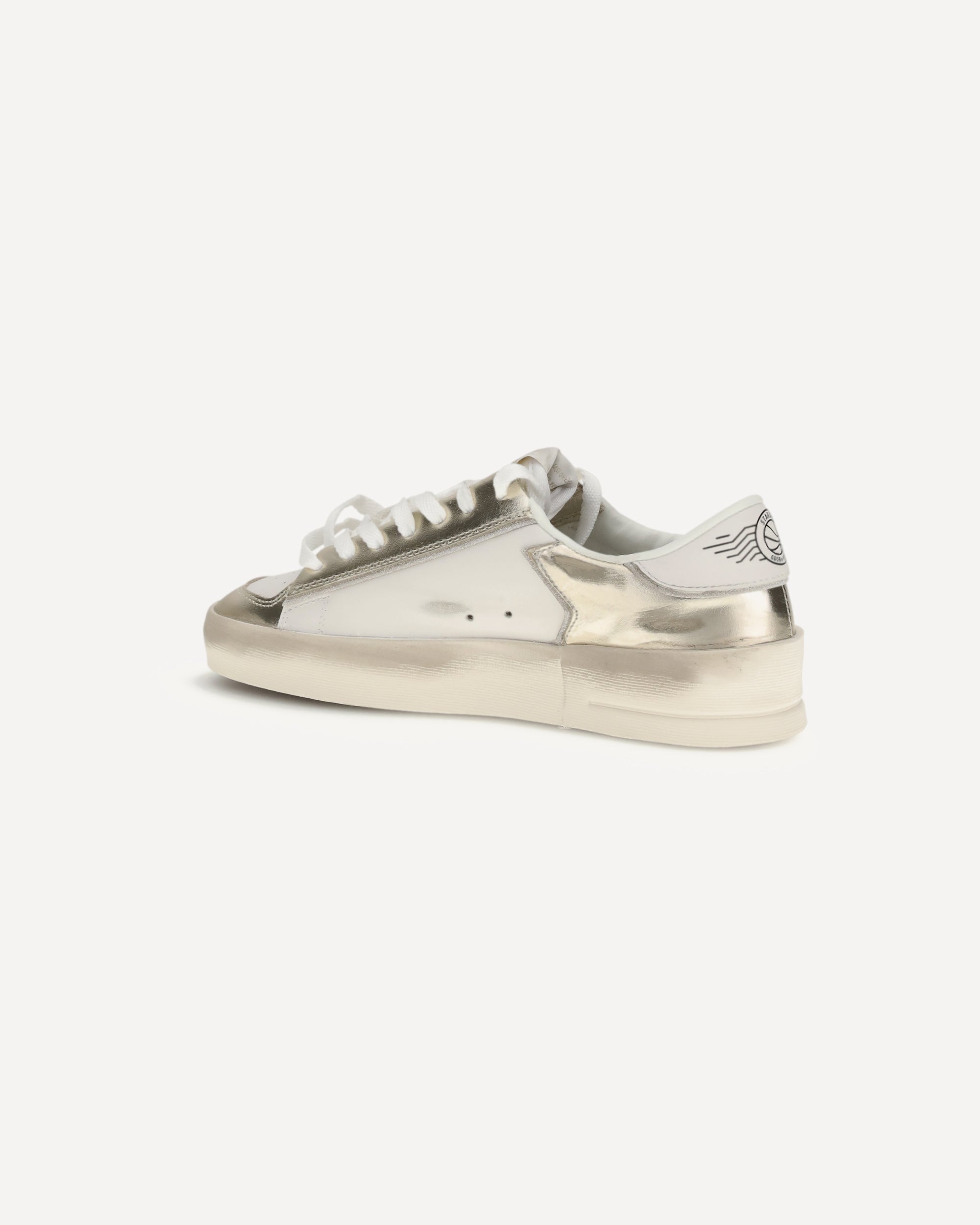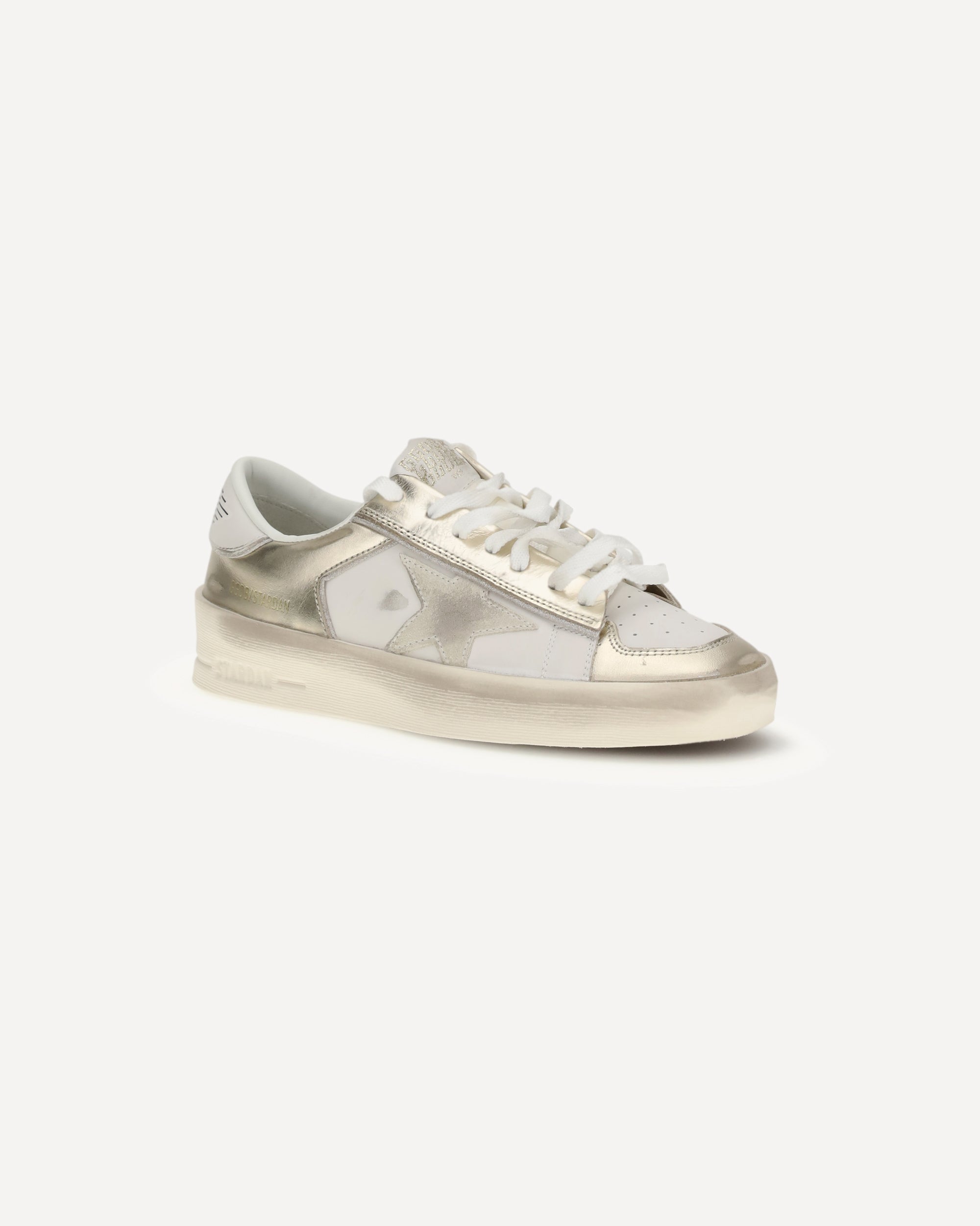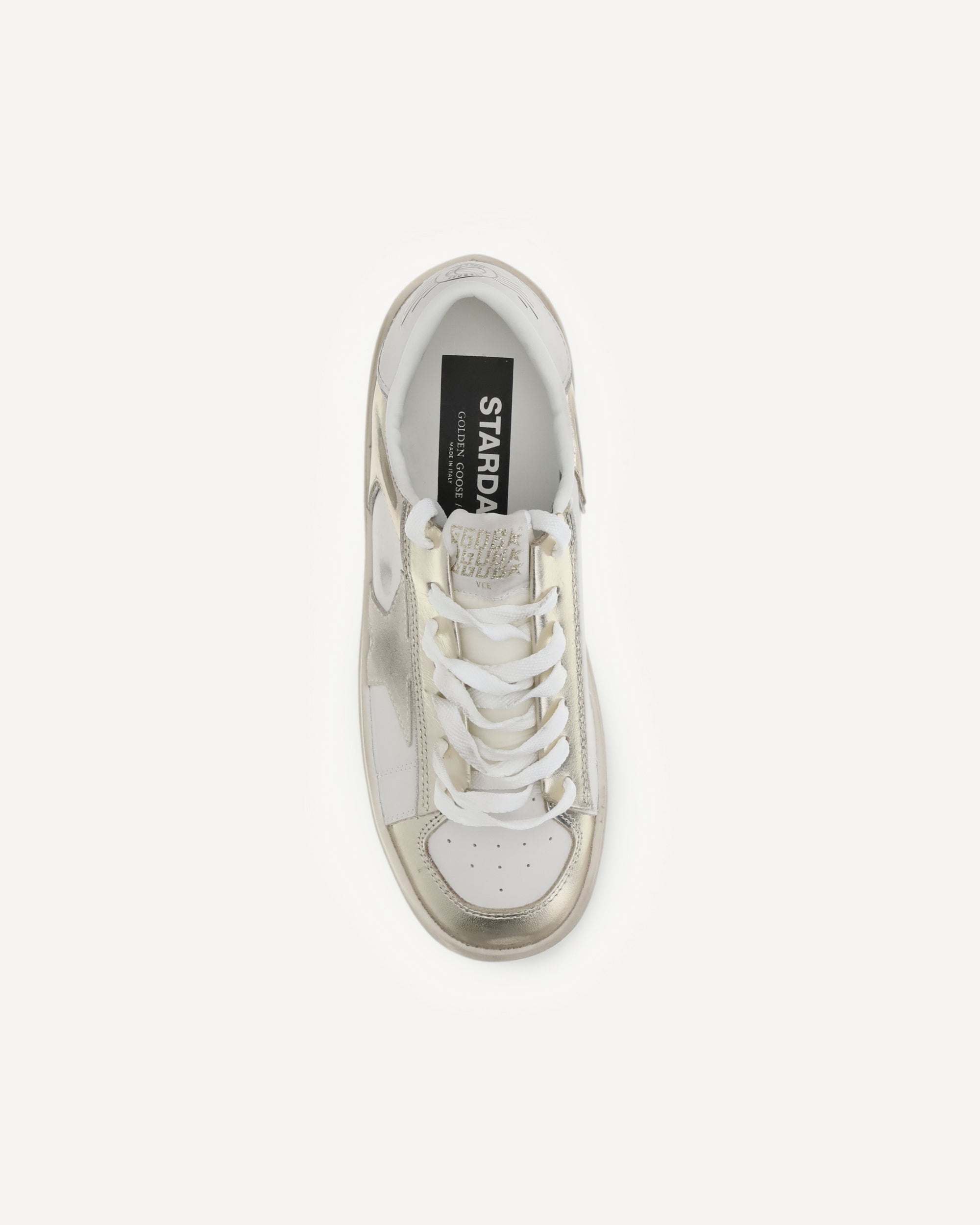 Le Sneakers Stardan di Golden Goose sono realizzate in pelle liscia e rifinite con sporcature intenzionali che richiamano l’estetica vintage tipica del brand. Presentano il logo stampato sul lato, una particolare stampa laminata sul tallone e la iconica stella applicata lateralmente. La chiusura è regolabile tramite lacci, mentre la linguetta e la caviglia imbottite garantiscono comfort. Completano il modello l’etichetta logata sulla linguetta e il logo stampato all’interno.