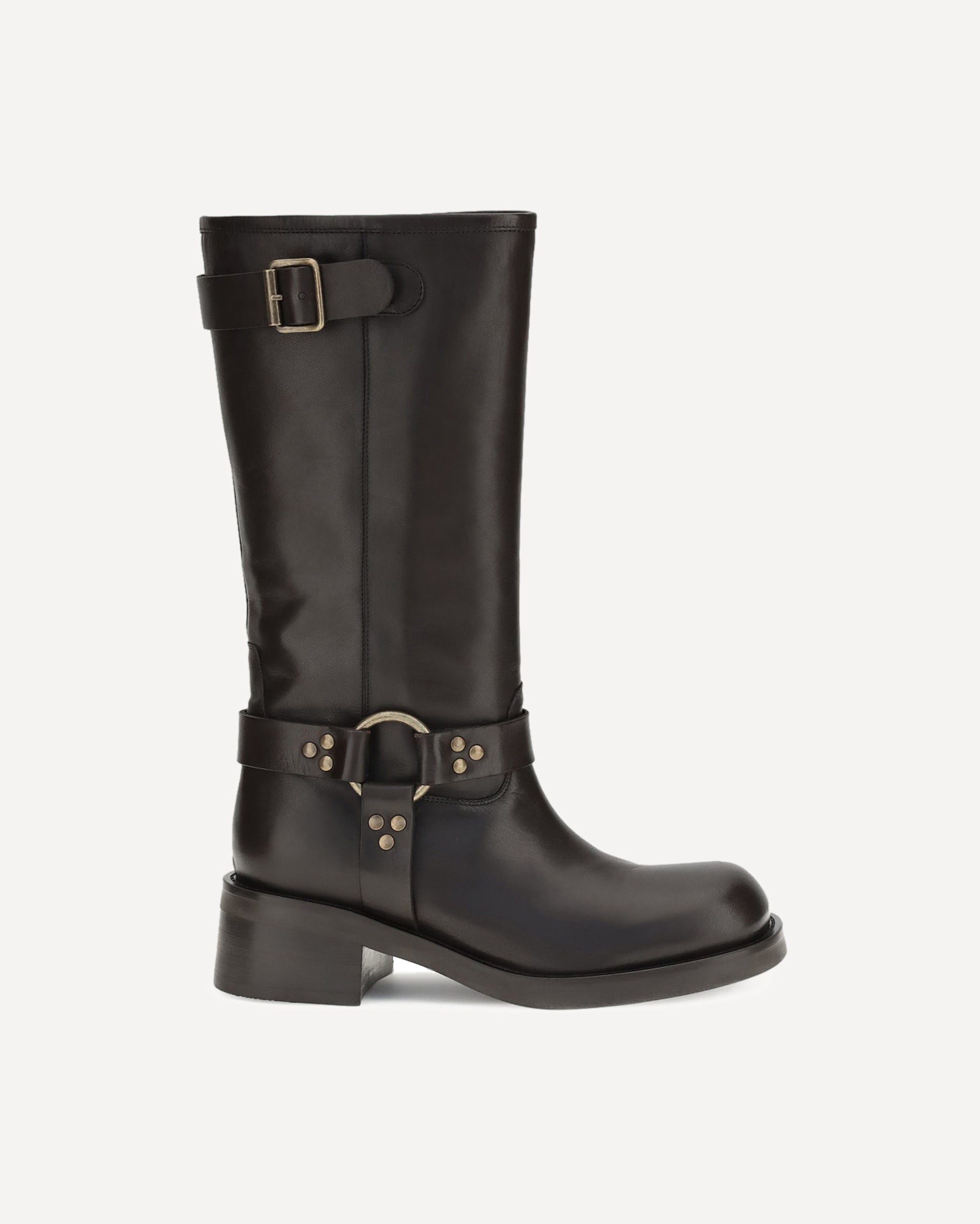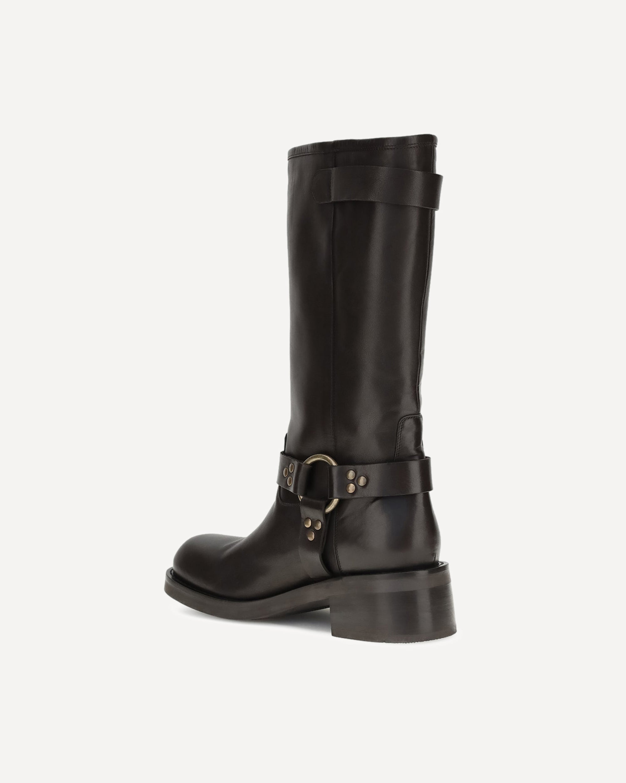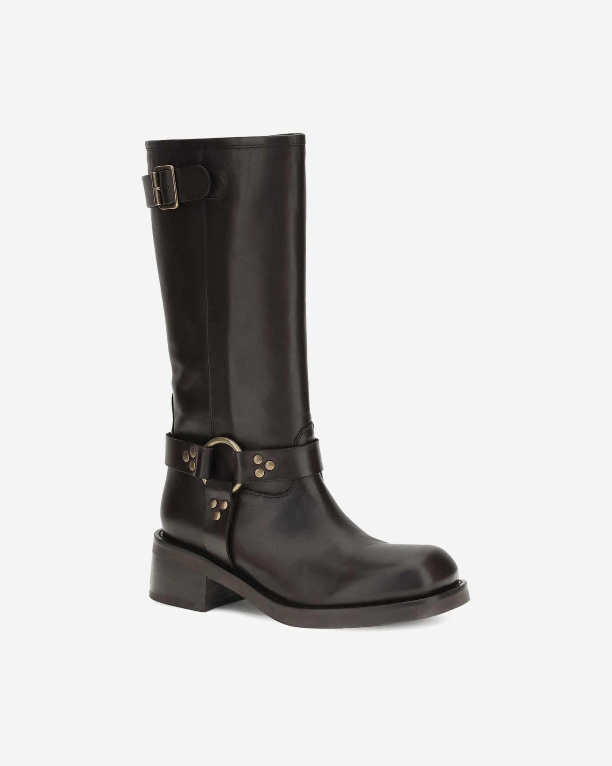 Gli Stivali in pelle di P.A.R.O.S.H. si distinguono per un design elegante e versatile. Con altezza sotto il ginocchio e punta tonda, offrono comfort e stile, mentre il tacco a blocco garantisce stabilità durante la camminata. La fibbietta posta sulla parte superiore aggiunge un dettaglio raffinato, rendendo questi stivali perfetti per completare ogni look con un tocco di carattere.