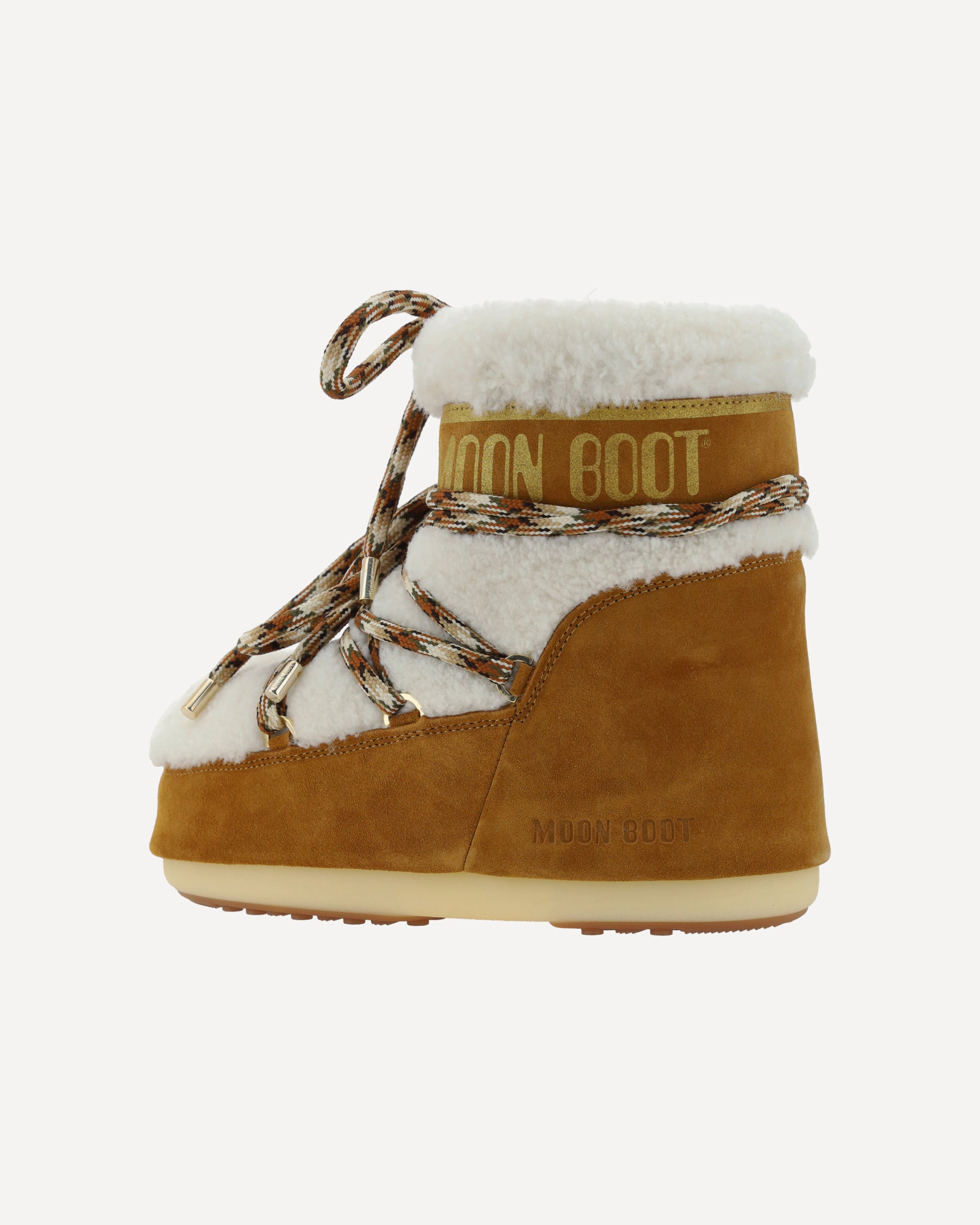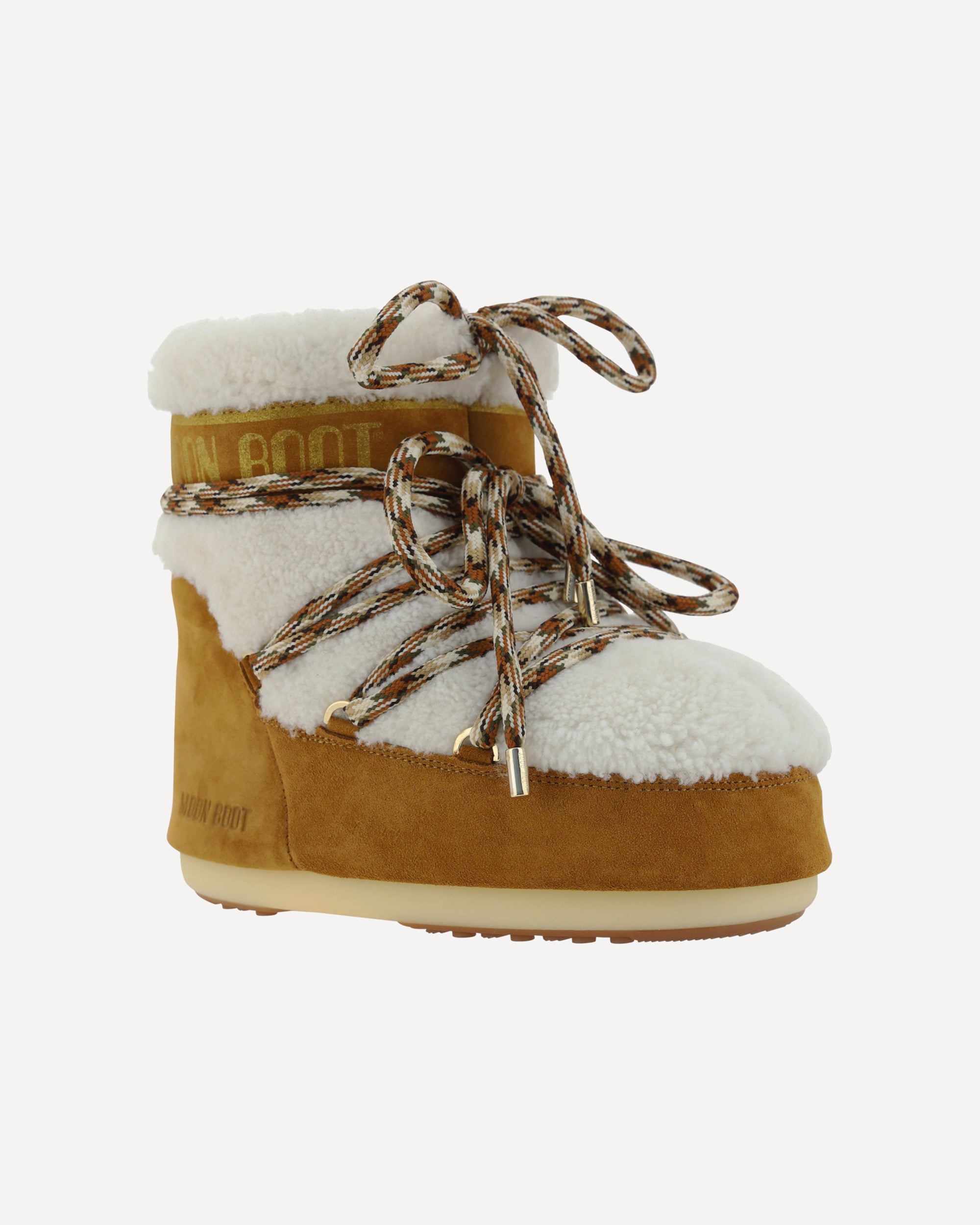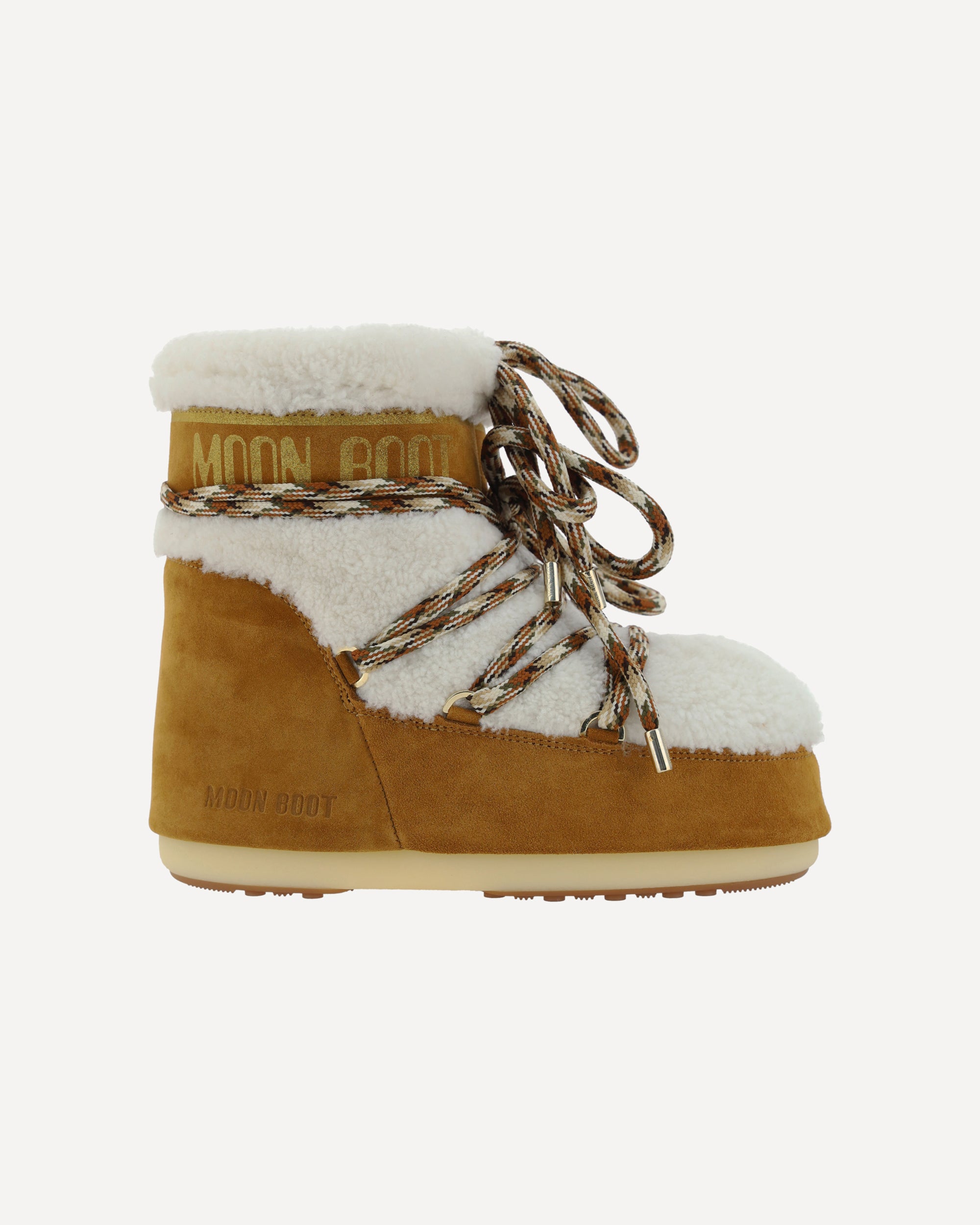 Stivali Icon Low Lab69 in Pelle di Moon Boot, design in shearling, iconico monogramma brand stampato a contrasto sul gambale, dettaglio in pelle scamosciata, lacci frontali per chiusura, suola platform, modello alla caviglia.