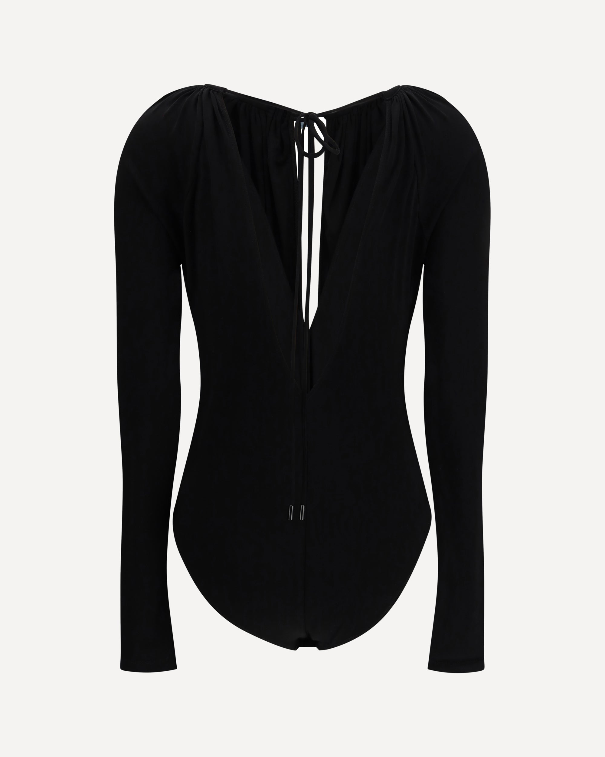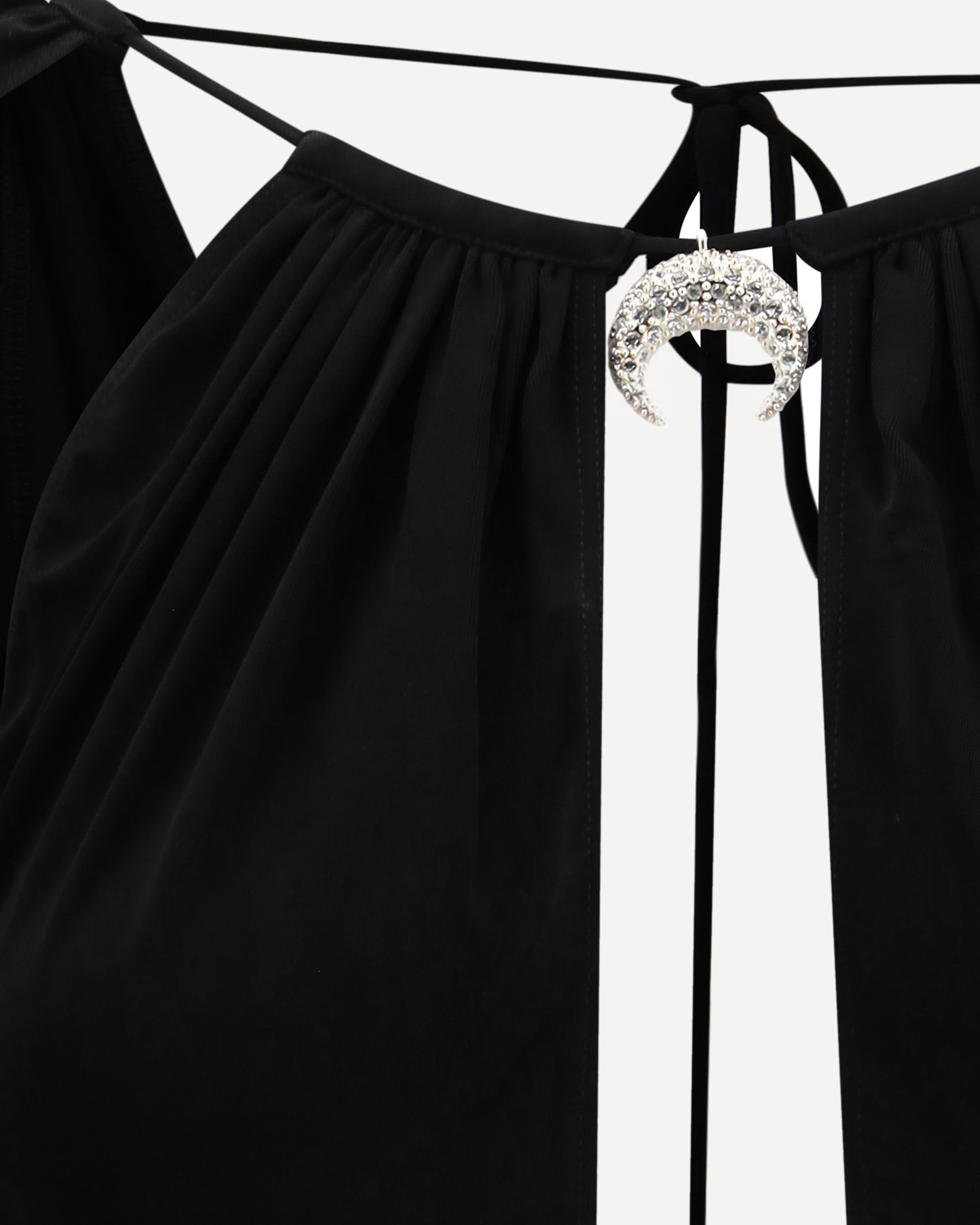 Il Body in viscosa stretch di Marine Serre si distingue per la sua eleganza contemporanea e la silhouette sensuale. Impreziosito da una decorazione gioiello a forma di Moon sulla parte superiore, presenta una scollatura a giro, dettagli cut-out sulla parte frontale e una chiusura con lacci da annodare sul retro. Un capo sofisticato che unisce raffinatezza e modernità con l’inconfondibile estetica del brand.