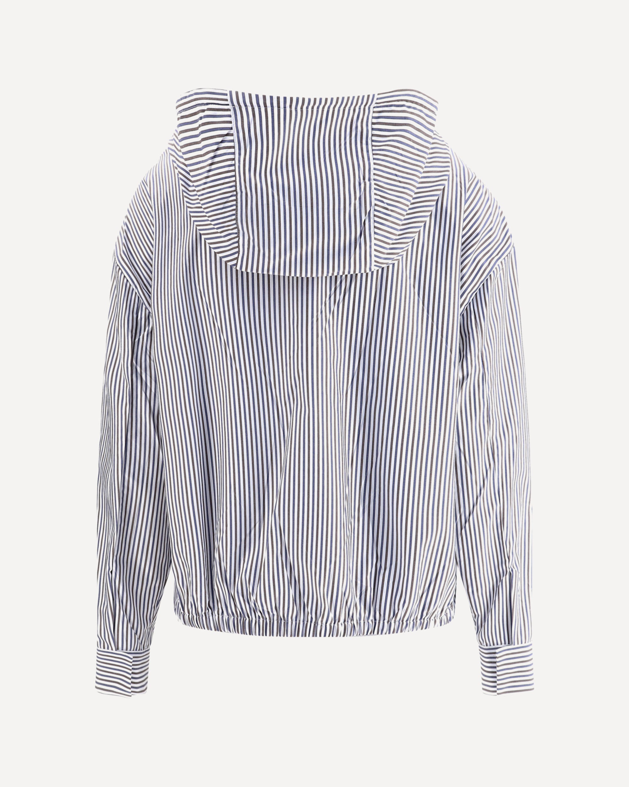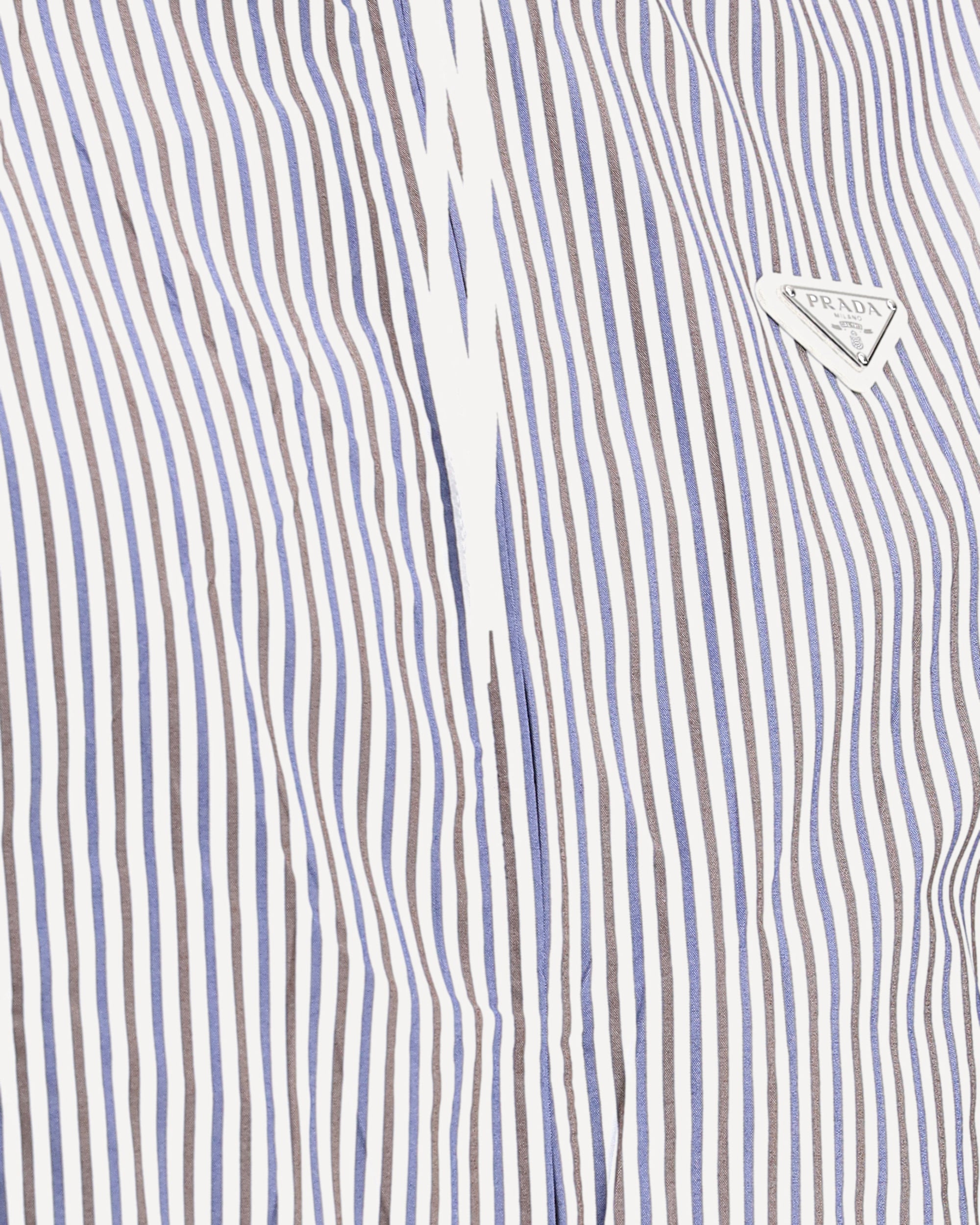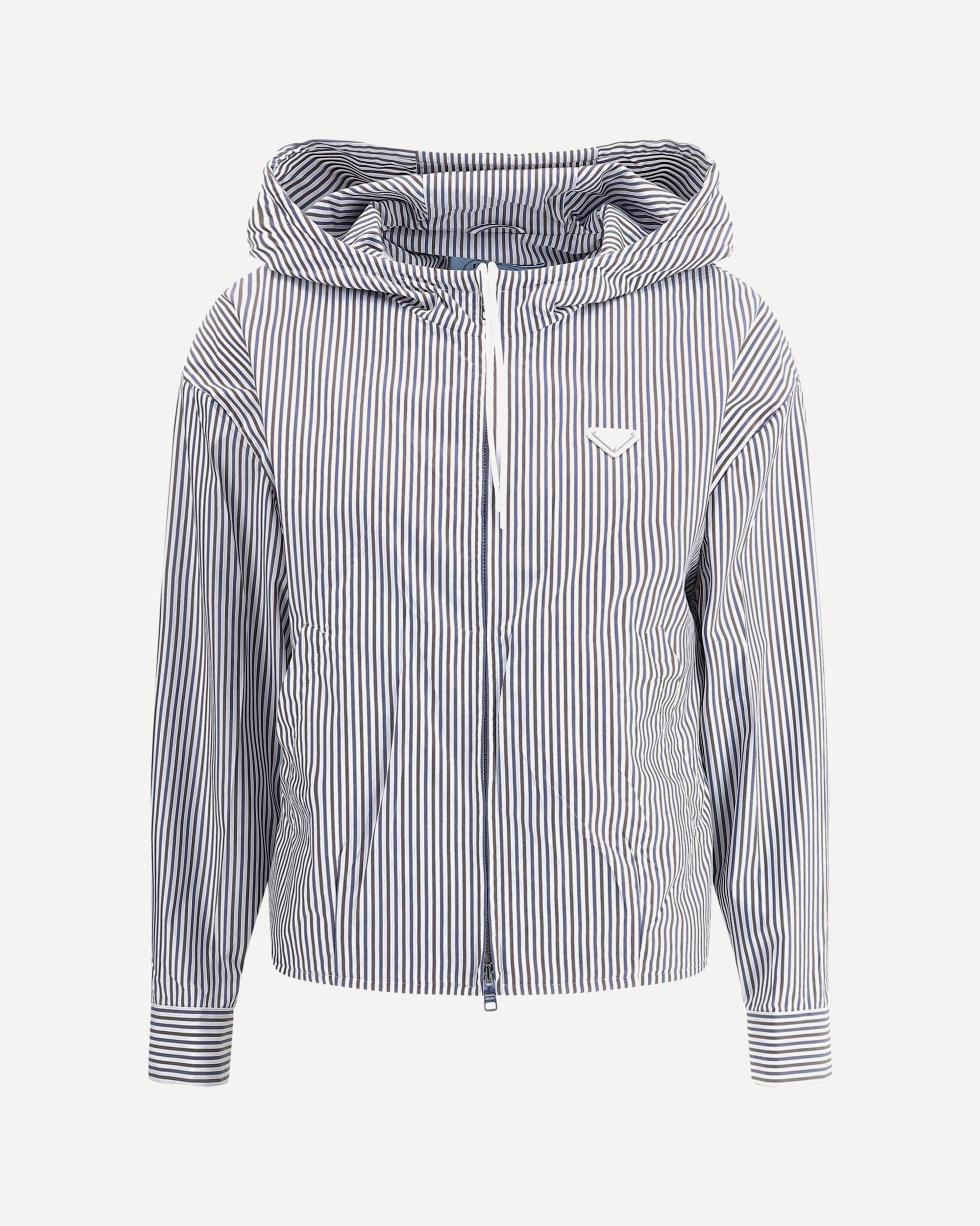 La Giacca a righe con cappuccio di Prada combina stile urbano e funzionalità. La chiusura frontale con cerniera a doppio cursore permette una regolazione pratica, mentre il cappuccio regolabile con coulisse aggiunge un elemento di comfort e protezione. Il design è arricchito dall'iconica placca triangolare del brand sul fronte, che ne sottolinea l'autenticità. Le tasche laterali a filetto completano il look, mentre la fantasia a righe dona un tocco distintivo e moderno.