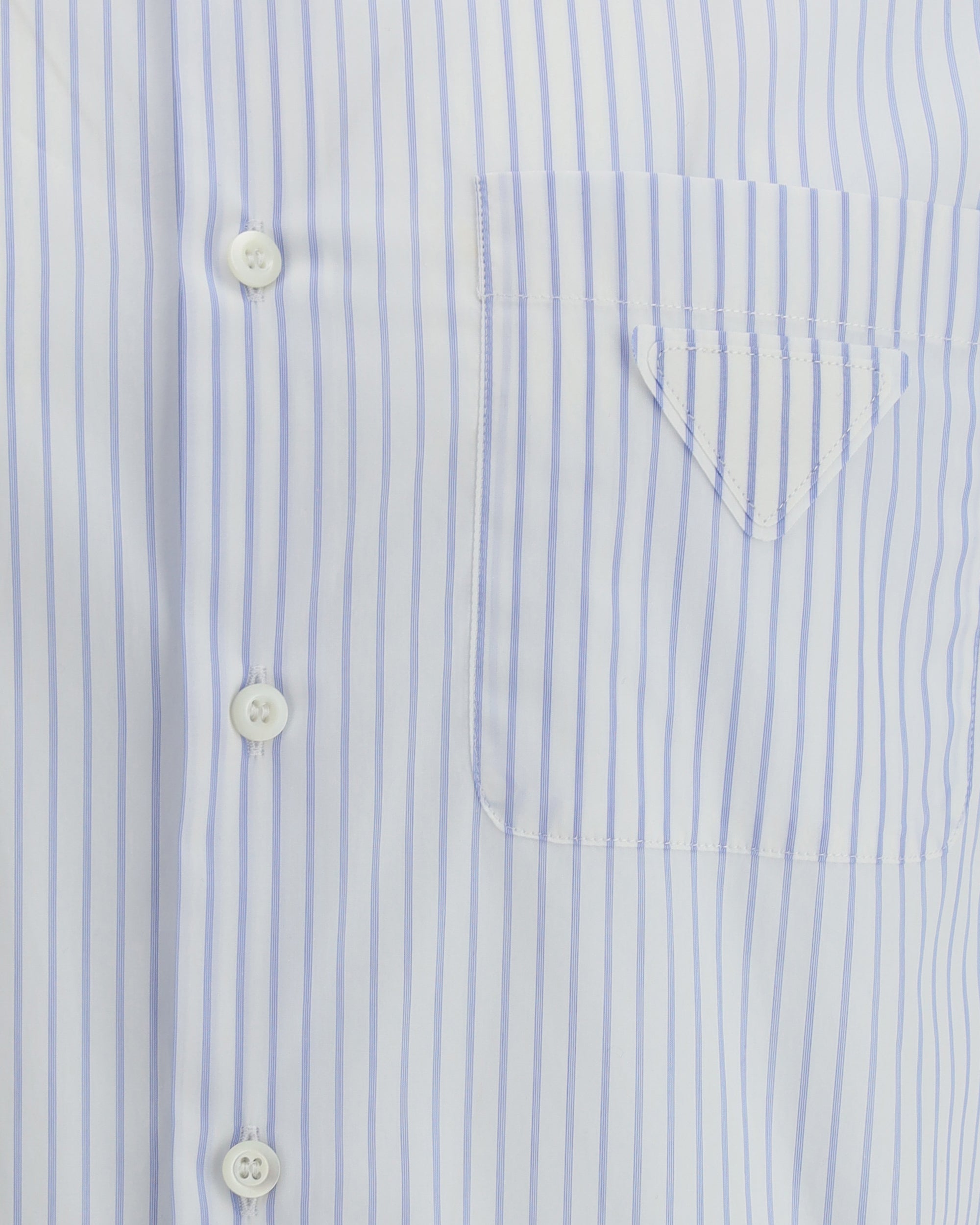 La Camicia è un capo elegante e versatile, realizzato in cotone di alta qualità di Prada. Il design con il colletto alla coreana aggiunge un tocco moderno e raffinato, mentre la chiusura frontale con bottoni e i polsini regolabili offrono una vestibilità personalizzabile. La tasca a filetto applicata sul fronte contribuisce a un aspetto minimalista ma funzionale.